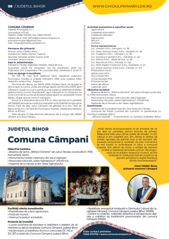 98 / JUDE%u021aUL BIHOR WWW.GHIDULPRIMARIILOR.ROCOMUNA C%u00c2MPANIAdres%u0103: Principal%u0103, nr. 1Cod po%u0219tal: 417140Telefon: 0359-170759; Fax: 0359-170757; Adresa de e-mail: office@primaria.campani.roprimariacimpani@yahoo.comURL: https://primaria.campani.ro/Persoane din primarie:Primar: Giani C%u0103t%u0103lin BuraViceprimar: Radu Ciprian%u00a0TuduceSecretar General: Ionela Corina%u00a0TodaContabil: Jenica CoroiuSate %u00een administra%u021bie:C%u00e2mpani, F%u00eena%u0163e, Sighi%u015ftel,%u00a0H%u00eerse%u015fti,%u00a0Valea de SusSuprafa%u021ba:%u00a0 4449 ha; Intravilan:%u00a0 142 ha; Extravilan:%u00a0 4307 ha; Popula%u021bia:%u00a02111; Gospod%u0103rii:%u00a0719; Locuin%u021be:%u00a0842; Gr%u0103dini%u021be:%u00a03; %u0218coli:%u00a03; Cum se ajunge in localitate:Pe DN 75 care face leg%u0103tura %u00eentre re%u0219edin%u021ba jude%u021bului Municipiul Oradea %u0219i ora%u0219ele C%u00e2mpeni, Alba Iulia, jude%u021bul Alba, respectiv ora%u0219ul Cluj - NapocaPornind din Beiu%u0219, pe DN76 (E69) Oradea-Deva, se ajunge la %u0218tei %u0219i apoi la Lunca, unde, pe st%u00e2nga apare ramifica%u021bia DN75 spre C%u00e2mpani. Dup%u0103 ce urc%u0103 o pant%u0103 scurt%u0103, %u0219oseaua asfaltat%u0103 str%u0103bate platoul %u00eentins, numit %u201cDumbrav%u0103%u201d, apoi coboar%u0103 lin %u00een C%u00e2mpani. La circa 4 km de la Lunca pe aceast%u0103 %u0219osea apare un pod peste Cri%u0219ul B%u0103i%u021bei , dup%u0103 care se intr%u0103 %u00een C%u00e2mpani.Situat la o altitudine de circa 370 m, satul se %u00eenscrie %u00een paralela 46%u00b051' latitudine nordic%u0103 %u0219i meridianul 22%u00b051' longitudine estic%u0103. Fa%u021b%u0103 de %u0218tei, satul C%u00e2mpani se g%u0103se%u0219te la 6 km., fa%u021b%u0103 de Beiu%u0219 la 26 km., iar fa%u021b%u0103 de Municipiul Oradea, re%u0219edin%u021b%u0103 jude%u021bului Bihor, la 87 km. Este situat%u0103 %u00een Depresiunea Beiu%u0219ului de-a lungul V%u0103ii B%u0103i%u021bei afluent al Cri%u0219ului Negru.Activitati economice si specifice zonei:Agricultur%u0103Cre%u0219terea animalelorCre%u0219terea albinelorAgroturismServicii Comer%u021bFirme reprezentative:S.C. Vitavert S.R.L. C%u00e2mpani, nr. 39S.C. Oana Service Colect S.R.L. H%u00e2rse%u0219ti, nr. 25S.C. Tudilemn S.R.L., C%u00e2mpani, nr. 93S.C. Construct Vameli S.R.L. , H%u00e2rse%u0219ti, nr. 62S.C. Jeanul S.R.L., Valea de Sus, nr. 65S.C. Raa Morar S.R.L., F%u00e2na%u021be, nr. 122S.C. ADR Aspect Construct S.R.L., Sighi%u0219tel, nr. 61S.C. Morar Cosmin Trans S.R.L., F%u00e2na%u021be, nr. 212Produc%u0103tori locali:Sab%u0103u Ioan PFASturz Dorel PFAIrimie Nicolae PFAProduse locale:Miere de albine Lapte de vac%u0103Obiective turistice:Biserica de lemn ,,Sf%u00e2ntul Dimitrie%u201d din satul F%u00e2na%u021be construit%u0103 %u00een 1796 monument istoricMonumentul eroilor neamului din satul Sighi%u0219teRezerva%u021bia natural%u0103%u00a0,,Valea Sighi%u0219telului%u201d (412,60 ha)Pe%u0219terile de la F%u00e2na%u021be %u0219i din Valea Sighi%u0219teluluiEvenimente:Atelierul de %u00eencondeiat ou%u0103 din Joia Mare din F%u00e2na%u021beConcerte de Pa%u0219te ,,Lumin%u0103 din Lumin%u0103%u201d, %u00een parteneriat cu Consiliul Jude%u021bean Bihor ,, Bihorul colind%u0103 %u201d %u2013 %u00een parteneriat cu Consiliul Jude%u021bean Bihor