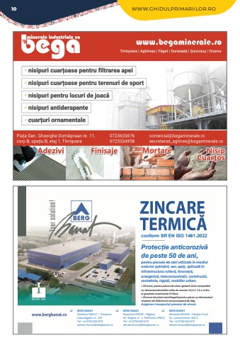10 WWW.GHIDULPRIMARIILOR.RO%u2751 BERG BANATRom%u00e2nia 300517 %u2013 Timi%u015foaraCalea %u0218agului nr. 143 Tel: +4 0755 042 672 adrian.flucus@bergbanat.ro%u2751 BERG BANATRom%u00e2nia 505200 %u2013 F%u0103g%u0103ra%u015fStr. Negoiu nr. 1, Platforma UPRUC Tel: +4 0755 042 672 adrian.flucus@bergbanat.ro%u2751 BERG BANATRom%u00e2nia 405100 %u2013 C%u00e2mpia TurziiStr. Laminoristilor 169 A Tel: +4 0755 042 672 adrian.flucus@bergbanat.roconform SR EN ISO 1461-2022Protec%u021bie anticoroziv%u0103 de peste 50 de ani, pentru piesele de o%u021bel utilizate %u00een mediul exterior (p%u0103m%u00e2nt, aer, ap%u0103), aplicat%u0103 %u00een infrastructura rutier%u0103, feroviar%u0103, energetic%u0103, telecomunica%u021bii, construc%u021bii, zootehnie, iriga%u021bii, mobilier urban.%u2022 Zincare, pentru piese ale c%u0103ror gabarit este compatibil cu dimensiunile b%u0103ilor utile de maxim 12,3 x 1,5 x 2.8m %u0219i grautate maxim%u0103 de 5 t/buc.%u2022 Zincare termic%u0103 centrifugal%u0103 pentru piese cu dimensiuni maxime de 500mm %u0219i masa maxim%u0103 de 3kg.Asigur%u0103m transportul pieselor de zincat.