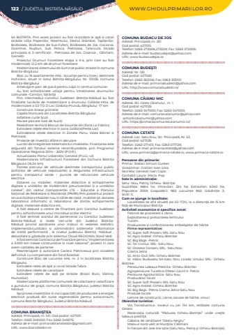122 / JUDE%u021aUL BISTRI%u021aA-N%u0102S%u0102UD WWW.GHIDULPRIMARIILOR.ROSA BISTRITA. Prin acest proiect au fost racordate la ap%u0103%u00a0%u0219i canal str%u0103zile Uli%u021ba Popenilor, Neam%u021bului, Dealul St%u00e2mbei, Tapi%u021berilor, Bridireasa, Bridireasa de Sus-Fufeni, Bridireasa de Jos, Cociorva, Doamnei, Rupturi, Sub Potica, Pietroasa, Tatarcuta Strada principala %u0219i 3 ramifica%u021bii , Pietroasa de Jos, Cioanca , C%u0103limani, GainestiProiectul Drumuri Forestiere etapa a II-a, prin care au fost moderniza%u021bi 12,2 km de drumuri forestiereModernizarea sistemului de iluminat public stradal %u00een comuna Bistri%u021ba-B%u00eerg%u0103uluiBloc cu 16 apartamente ANL- locuin%u0163e pentru tineri, destinate %u00eenchirierii, situat %u00een Satul Bistri%u021ba-B%u00e2rg%u0103ului, Nr. 1331/B, Comuna Bistri%u021ba-B%u00e2rg%u0103uluiAmenajare parc de joac%u0103 pentru copii %u00een centrul comuneiAu fost achizi%u021bionate utilaje pentru %u00eentre%u021binerea drumurilor comunale %u2013Camion, S%u0103r%u0103ri%u021b%u0103Prin intermediul Consiliul Jude%u021bean Bistri%u021ba-N%u0103s%u0103ud au fost finalizate lucr%u0103rile de modernizare a drumului Colibi%u021ba-Mi%u021ba, de modernizare a DJ 172 D Lac Colibi%u021ba-Prundu B%u00e2rg%u0103ului -17 kmConstruire Anexe prim%u0103rieCapela Mortuar%u0103%u00a0din Localitatea Bistri%u021ba B%u00e2rg%u0103uluiAsfaltare curte %u0218coliPavare parcare Sala de Nun%u021biReabilitare termic%u0103%u00a0Blocuri de locuin%u021be din Zona La FabricaExtindere re%u021bele electrice %u00een zona Colibi%u021ba(Peste Lac)Extinderere re%u021bele electrice %u00een Zonele Panu, Valea B%u00e2rnei %u0219i PietroasaProiecte de investi%u021bii aflate %u00een derulareLucr%u0103ri de %u00eenregistrare sistematic%u0103 a imobilelor. Finan%u021barea este asigurat%u0103 din fonduri externe nerambursabile, prin Programul Opera%u021bional Regional 2014 %u2013 2020 (P.O.R.)Actualizarea Planul Urbanistic General (P.U.G.-ul)Modernizarea Infrastructurii Forestiere din Comuna Bistri%u021ba B%u00e2rgaului (16,34 km)%u00cenoirea parcului de vehicule destinate transportului public (achizi%u021bia de vehicule nepoluante) %u0219i Asigurarea infrastructurii pentru transportul verde - puncte de re%u00eencarcare vehicule electriceDotarea cu mobilier, materiale didactice %u0219i echipamente digitale a unit%u0103%u021bilor de %u00eenv%u0103%u021b%u0103m%u00e2nt preuniversitar %u0219i a unit%u0103%u021bilor conexe%u201d, din cadrul Componentei C15 %u2013 Educa%u021bie a Planului Na%u021bional de Redresare %u0219i Rezilien%u021b%u0103 (PNRR).Prin prezentul proiect se va achizitona Mobilier nou %u00een s%u0103lile de clas%u0103%u00a0, mobilier pt. dotarea laboratorul informatic %u0219i laboratorul de %u0219tiin%u021be, echipamente digitale, materiale didactice etc.A fost depus%u0103%u00a0 o cerere de finan%u021bare prin Consiliul Jude%u021bean pentru achizi%u021bionarea unui microbus %u0219colar electricA fost semnat acordul de parteneriat cu Consiliul Jude%u021bean Bistri%u021ba-N%u0103s%u0103ud %u0219i toate Uat-urile din Jude%u021bul Bistri%u021baN%u0103s%u0103ud privind aprobarea unor m%u0103suri %u00een vederea realiz%u0103rii, implement%u0103rii,utiliz%u0103rii %u0219i administr%u0103rii sistemelor informatice de %u00eenalt%u0103 performant%u0103 , la nivelul jude%u021bului Bistri%u021ba %u2013N%u0103s%u0103ud , dezvoltate %u0219i g%u0103zduite prin sistemul Cloud REGIONAL Nord-VestA fost semnat Contractul de Finan%u021bare pentru %u2018%u2019Implementarea a 3.000 km trasee cicloturistice la nivel na%u021bional%u2019%u2019, proiect %u00een care avem calitatea de partenerReamenajare %u0219i autorizare Cariera Pietriceaua prin scoatere definitiv%u0103%u00a0cu compensare din fond forestierConstruire Bloc de Locuin%u021be ANL nr. 2 %u00een localitatea Bistri%u021ba B%u00e2rgauluiExtindere re%u021bea de ap%u0103%u00a0%u0219i canal Strada TabraExtindere re%u021bele de canalizareExtindere re%u021bele de ap%u0103 pe str%u0103zile (Brazii Buni, Slatina, Munceilor)Modernizarea platformei comunale de colectare %u0219i valorificare a gunoiului de grajd, comuna Bistri%u021ba B%u00e2rg%u0103ului, jude%u021bul Bistri%u021ba N%u0103s%u0103udSprijinirea investi%u021biilor %u00een noi capacit%u0103%u021bi de producere a energiei electrice produs%u0103 din surse regenerabile pentru autoconsum, comuna Bistri%u021ba B%u00e2rg%u0103ului, Jude%u021bul Bistri%u021ba N%u0103s%u0103udCOMUNA BRANI%u015eTEAAdres%u0103: Principal%u0103, nr. 101; Cod po%u0219tal: 427010Telefon: 0263-349000; Fax: 0263-349275; Adresa de e-mail: primariabranisteabn@gmail.comURL: www.branisteabn.roCOMUNA BUDACU DE JOSAdres%u0103: Principal%u0103, nr. 251Cod po%u0219tal: 427015Telefon: 0263-272006,272229; Fax: 0263-272006; Adresa de e-mail: budacudejos@yahoo.comURL: www.budacudejos.roCOMUNA BUDE%u015eTIAdres%u0103: Nr. 120Cod po%u0219tal: 427020Telefon: 0263-353106; Fax: 0263-353101; Adresa de e-mail: primariabudesti@yahoo.comURL: http://www.comunabudesti.ro/COMUNA C%u0102IANU MICAdres%u0103: Str. Calea C%u0103ianului , nr. 1Cod po%u0219tal: 427025Telefon: 0263-347000; Fax: 0263-347000; Adresa de e-mail: comunacaianumic@yahoo.com achizitiicaianumic@yahoo.comURL: https://primariacomuneicaianumic.ro/COMUNA CETATEAdres%u0103: Loc. Satu Nou, Str. Principal%u0103, Nr. 53Cod po%u0219tal: 427035Telefon: 0263-271413; Fax: 0263-271729; Adresa de e-mail: primariacetate@yahoo.comURL: www.primaria@primaria-cetate.ro, www.primaria-cetate.roPersoane din primarie:Primar: Stelian Simion CureanViceprimar: Cristian Ioan UrsaSecretar General:%u00a0Ioan%u00a0Cojoc%u00a0Contabil:%u00a0Laura- Maria%u00a0%u00a0PopSate %u00een administra%u021bie:Satu- Nou, Petri%u015f, Orheiu- Bistri%u0163eiSuprafa%u021ba:%u00a0 6664 ha; Intravilan:%u00a0 324 ha; Extravilan:%u00a0 6340 ha; Popula%u021bia:%u00a0 3059; Gospod%u0103rii:%u00a0 982; Locuin%u021be:%u00a0 862; Gr%u0103dini%u021be:%u00a0 3; %u0218coli:%u00a03; Cum se ajunge in localitate:Localitatea