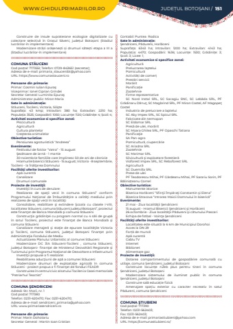 WWW.GHIDULPRIMARIILOR.RO JUDE%u021aUL BOTO%u0218ANI / 151Construire de insule supraterane ecologice digitalizate cu colectare selectiv%u0103 %u00een Ora%u0219ul S%u0103veni, jude%u021bul Boto%u0219ani (Stadiul lucr%u0103rilor-%u00een implementare) Modernizare str%u0103zi or%u0103%u0219ene%u0219ti %u0219i drumuri s%u0103te%u0219ti etapa a III a (Stadiul lucr%u0103rilor-%u00een implementare)COMUNA ST%u0102UCENICod po%u0219tal: 717355l; Telefon: 0729-843651 (secretar); Adresa de e-mail: primaria_staucenibt@yahoo.comURL: https://www.comunastauceni.roPersoane din primarie:Primar:%u00a0Cosmin Iulian Epura%u015fViceprimar: Ionel Ciprian GrindeiSecretar General: Luminita Epura%u015fAdministrator public: Miron MariaSate %u00een administra%u021bie:St%u0103uceni, Tocileni, Victoria, Sili%u015fteSuprafa%u021ba:%u00a0 43 kmp; Intravilan:%u00a0 380 ha; Extravilan:%u00a0 2210 ha; Popula%u021bia:%u00a03525; Gospod%u0103rii:%u00a01050; Locuin%u021be:%u00a01120; Gr%u0103dini%u021be:%u00a04; %u0218coli:%u00a04; Activitati economice si specifice zonei:Piscicultur%u0103Agricultur%u0103Cultura plantelorCre%u015fterea animalelorObiective turistice:Pensiunea agroturistic%u0103 %u201cAndreea%u201dEvenimente:Festivalul de folclor %u201cVatra%u201d - 15 august%u015eez%u0103toare de iarn%u0103 - 1 martie30 noiembrie familiile care %u00eemplinesc 50 de ani de c%u0103snicieHramurile bisericii St%u0103uceni - 15 august, Victoria - 8 septembrie, Tocileni - la %u00cen%u0103l%u0163area DomnuluiFacilit%u00e3%u0163i oferite investitorilor:Ap%u0103 curent%u0103CanalizareDrumuri comunaleProiecte de investi%u0163ii:Investi%u0163ii %u00een curs de derulare:Realizarea de spa%u0163ii verzi %u00een comuna St%u0103uceni%u201d conform Programului Na%u0163ional de %u00cembun%u0103t%u0103%u0163ire a calit%u0103%u0163i mediului prin realizarea de spa%u0163ii verzi %u00een localit%u0103%u0163iConsolidare, reabilitare %u015fi extindere %u015ecoala cu clasele I-VIII, localitatea St%u0103uceni, comuna St%u0103uceni jude%u0163ul Boto%u015fani%u201d, proiectul este finan%u0163at de Banca Mondial%u0103 %u015fi comuna St%u0103uceni%u00a0Construc%u0163ia gr%u0103dini%u0163ei cu program normal cu 4 s%u0103li de grup%u0103 %u00een satul Tocileni, proiectul este finan%u0163at de Banca Mondial%u0103 %u015fi comuna St%u0103uceniCanalizare menajer%u0103 %u015fi sta%u0163ie de epurare localit%u0103%u0163ile Victoria %u015fi Tocileni, comuna St%u0103uceni, jude%u0163ul Boto%u015fani finan%u0163at prin Administra%u0163ia Fondului de MediuActualizarea Planului Urbanistic al comunei St%u0103uceniModernizare DC 31A St%u0103uceni-Tocileni , comuna St%u0103uceni, jude%u0163ul Boto%u015fani- finan%u0163at de Ministerul Dezvolt%u0103rii Regionale %u015fi Turismului prin Programul Na%u0163ional de Dezvoltare a InfastructuriiInvesti%u0163ii propuse a fi realizate:Reabilitarea aduc%u0163iunii de ap%u0103 a comunei St%u0103uceniModernizare drumuri de exploata%u0163ie agricol%u0103 %u00een comuna St%u0103uceni - proiect propus a fi finan%u0163at de fonduri FEADRConstruirea %u00een centrul civic al satului Tocileni a Casei memoriale %u201cPatriarhul Teoctist%u201dCOMUNA %u015eENDRICENIAdres%u0103: Str. Morii, nr. 1Cod po%u0219tal: 717380Telefon: 0231-620470; Fax: 0231-620470; Adresa de e-mail: sendriceni_primaria@yahoo.comURL: www.primariasendriceni.roPersoane din primarie:Primar: Marin DohotariuSecretar General : Martin Ioan CristianContabil: Puntea %u00a0RodicaSate %u00een administra%u021bie:%u015eendriceni, P%u0103dureni, Horl%u0103ceniSuprafa%u021ba:%u00a0 6343 ha; Intravilan:%u00a0 1200 ha; Extravilan:%u00a0 4143 ha; Popula%u021bia:%u00a0 4470; Gospod%u0103rii:%u00a0 1636; Locuin%u021be:%u00a0 1530; Gr%u0103dini%u021be:%u00a0 3; %u0218coli:%u00a03; Licee:%u00a01; Activitati economice si specifice zonei:Agricultur%u0103Prelucrarea lapteluiPomicultur%u0103Activit%u0103%u021bi de comer%u021bPrest%u0103ri serviciiMor%u0103ritPanifica%u021bieZootehnieFirme reprezentativeSC Nord Instal SRL, SC Sacagiu SNC, SC Leb%u0103da SRL, PF Gr%u0103dinaru D%u0103nu%u0163, SC Magbrind SRL, PF Miron Costel, AF Magope%u0163 CostelIndustria de prelucrare a lapteluiSC Aby Impex SRL, SC Spicul SRLFabricate din termopanSC Eldomar SRLPres%u0103 de ulei, mor%u0103ritSC Moara Ghilea SRL, PF Opaschi TatianaPanifica%u0163ieSA Pan-agroPomicultur%u0103, ciuperc%u0103rieSC Ariadna SRLZootehnieSC Marimar SRLSilvicultur%u0103 %u015fi exploatare forestier%u0103Vioforest Impex SRL, SC Reboforest SRLAgricultur%u0103SC Duemilla SRLPrese de uleiPF Teodorescu Mihai, PF G%u00e2rdeanu Mihai, PF Sarariu Sorin, PF B%u0103lini%u0219teanu CornelObiective turistice:Monumente istorice:Biserica Horl%u0103ceni %u201cSfin%u0163ii %u00cemp%u0103ra%u0163i Constantin %u015fi Elena%u201dBiserica Stracova %u201cIntrarea Maicii Domnului %u00een biseric%u0103%u201d%u00a0Evenimente:21 mai - Ziua localit%u0103%u0163ii %u015eendriceni15 august - Hramul Bisericii %u015eendriceni %u015fi Horl%u0103ceni26 octombrie - Ziua localit%u0103%u0163ii P%u0103dureni %u015fi c%u0103tunului PascariEchipa de fotbal - Voin%u0163a %u015eendriceniFacilit%u00e3%u0163i oferite investitorilor:Localitatea este situat%u0103 la 6 km de Municipiul DorohoiAcces la DN 29For%u021b%u0103 de munc%u0103Ap%u0103 curent%u0103Cablu TVInternetBiblionetAlimentare gazProiecte de investi%u0163ii:Dotarea compartimentului de gospod%u0103rire comunal%u0103 cu utilaje, comuna %u0218endriceni, jude%u021bul Boto%u0219aniConstruire locuin%u021be nZeb plus pentru tineri %u00een comuna %u0218endriceni, jude%u021bul Boto%u0219aniModernizare sistemului de iluminat public %u00een comuna %u0218endriceni, jude%u021bul Boto%u0219aniConstruire sal%u0103 educa%u021bie fizic%u0103Amenajare spa%u021biu exterior cu caracter recreativ %u00een satul P%u0103dureni, comuna %u0218endriceniCOMUNA %u015eTIUBIENICod po%u0219tal: 717390Telefon: 0231-562403; Fax: 0231-562403; Adresa de e-mail: primariastiubieni@yahoo.comURL: https://comunastiubieni.ro/