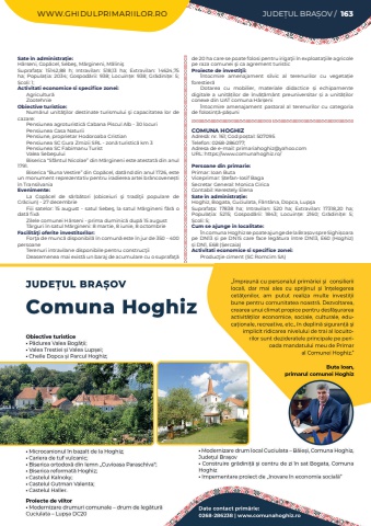 WWW.GHIDULPRIMARIILOR.RO JUDE%u021aUL BRA%u0218OV / 163Sate %u00een administra%u021bie:H%u00e2rseni, Cop%u0103cel, Sebe%u015f, M%u0103rgineni, M%u0103lini%u015fSuprafa%u021ba:%u00a0 15142,88 h; Intravilan:%u00a0 518,13 ha; Extravilan:%u00a0 14624,75 ha; Popula%u021bia:%u00a0 2034; Gospod%u0103rii:%u00a0 938; Locuin%u021be:%u00a0 938; Gr%u0103dini%u021be:%u00a0 5; %u0218coli:%u00a01; Activitati economice si specifice zonei:Agricultur%u0103ZootehnieObiective turistice:Num%u0103rul unit%u0103%u0163ilor destinate turismului %u015fi capacitatea lor de cazare:Pensiunea agroturistic%u0103 Cabana Piscul Alb - 30 locuriPensiunea Casa NaturiiPensiune, proprietar Hodoroaba CristianPensiunea SC Gura Zmizii SRL - zon%u0103 turistic%u0103 km 3Pensiunea SC Fabimanu TuristValea Sebe%u015fuluiBiserica %u201cSf%u00e2ntul Nicolae%u201d din M%u0103rgineni este atestat%u0103 din anul 1791.Biserica %u201cBuna Vestire%u201d din Cop%u0103cel, dat%u00e2nd din anul 1726, este un monument reprezentativ pentru iradierea artei br%u00e2ncovene%u0219ti %u00een TransilvaniaEvenimente:La Cop%u0103cel de s%u0103rb%u0103tori (obiceiuri %u015fi tradi%u0163ii populare de Cr%u0103ciun) - 27 decembrieFiii satelor: 15 august - satul Sebe%u015f, la satul M%u0103rgineni f%u0103r%u0103 o dat%u0103 fix%u0103Zilele comunei H%u00e2rseni - prima duminic%u0103 dup%u0103 15 augustT%u00e2rguri %u00een satul M%u0103rgineni: 8 martie, 8 iunie, 8 octombrieFacilit%u00e3%u0163i oferite investitorilor:For%u0163a de munc%u0103 disponibil%u0103 %u00een comun%u0103 este %u00een jur de 350 - 400 persoaneTerenuri intravilane disponibile pentru construc%u0163iiDeasemenea mai exist%u0103 un baraj de acumulare cu o suprafa%u0163%u0103 de 20 ha care se poate folosi pentru iriga%u0163ii %u00een exploata%u0163iile agricole pe raza comunei %u015fi ca agrement turisticProiecte de investi%u0163ii:%u00centocmire amenajament silvic al terenurilor cu vegeta%u021bie forestier%u0103Dotarea cu mobilier, materiale didactice %u0219i echipamente digitale a unit%u0103%u021bilor de %u00eenv%u0103%u021b%u0103m%u00e2nt preuniversitar %u0219i a unit%u0103%u021bilor conexe din UAT comuna H%u00e2r%u0219eni%u00centocmire amenajament pastoral al terenurilor cu categoria de folosin%u021b%u0103-p%u0103%u0219uniCOMUNA HOGHIZ Adres%u0103: nr. 161; Cod po%u0219tal: 507095Telefon: 0268-286077; Adresa de e-mail: primariahoghiz@yahoo.comURL: https://www.comunahoghiz.ro/Persoane din primarie:Primar: Ioan%u00a0ButaViceprimar: %u0218tefan-Iosif BagaSecretar General: Monica%u00a0Cirica%u00a0Contabil: Kerestely ElenaSate %u00een administra%u021bie:Hoghiz, Bogata, Cuciulata, F%u00e2nt%u00e2na, Dopca, Lup%u015faSuprafa%u021ba:%u00a0 17838 ha; Intravilan:%u00a0 520 ha; Extravilan:%u00a0 17318,20 ha; Popula%u021bia:%u00a0 5215; Gospod%u0103rii:%u00a0 1843; Locuin%u021be:%u00a0 2160; Gr%u0103dini%u021be:%u00a0 5; %u0218coli:%u00a05; Cum se ajunge in localitate:%u00cen comuna Hoghiz se poate ajunge de la Bra%u0219ov spre Sighi%u0219oara pe DN13 %u0219i pe DN1S care face leg%u0103tura %u00eentre%u00a0DN13,%u00a0E60%u00a0(Hoghiz) %u0219i%u00a0DN1,%u00a0E68%u00a0(%u0218ercaia)Activitati economice si specifice zonei:Produc%u0163ie ciment (SC Romcim SA)