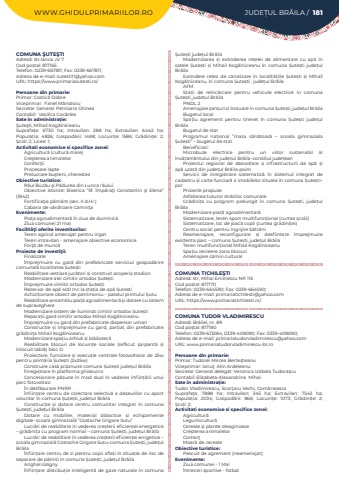 WWW.GHIDULPRIMARIILOR.RO JUDE%u021aUL BR%u0102ILA / 181COMUNA %u015eUTE%u015eTIAdres%u0103: str.Ianca ,nr 7Cod po%u0219tal: 817165Telefon: 0239-667811; Fax: 0239-667811; Adresa de e-mail: sutesti11@yahoo.comURL: https://www.primariasutesti.ro/Persoane din primarie:Primar: Costic%u0103%u00a0Dobre%u00a0Viceprimar:%u00a0 Fanel%u00a0M%u00e2ndroiuSecretar General: Petrioara%u00a0Ghinea%u00a0Contabil:%u00a0 Vasilica%u00a0Coc%u00e2rlea%u00a0Sate %u00een administra%u021bie:%u015eute%u015fti, Mihail Kog%u0103lniceanuSuprafa%u021ba:%u00a0 6730 ha; Intravilan:%u00a0 288 ha; Extravilan:%u00a0 6442 ha; Popula%u021bia:%u00a0 4826; Gospod%u0103rii:%u00a0 1498; Locuin%u021be:%u00a0 1586; Gr%u0103dini%u021be:%u00a0 2; %u0218coli:%u00a02; Licee:%u00a01; Activitati economice si specifice zonei:Agricultur%u0103 (cultur%u0103 mare)Cre%u015fterea animalelorConfec%u0163iiProcesare laptePrelucrare bu%u015fteni, cherestea%u00a0Obiective turistice:R%u00e2ul Buz%u0103u %u015fi P%u0103durea din Lunca r%u0103uluiObiective istorice: Biserica %u201cSf. %u00cemp%u0103ra%u0163i Constantin %u015fi Elena%u201d (1842)Fortifica%u0163ie p%u0103m%u00e2nt (sec. II d.Hr.)Cabana de v%u00e2n%u0103toare Camni%u0163aEvenimente:Pia%u0163a agroalimentar%u0103 %u00een ziua de duminic%u0103Ziua comunei 21 maiFacilit%u00e3%u0163i oferite investitorilor:Teren agricol amenajat pentru irigatTeren intravilan - amenajare obiective economiceFor%u0163%u0103 de munc%u0103Proiecte de investi%u0163ii:Finalizate%u00cemprejmuire cu gard din prefabricate serviciul gospod%u0103rire comunal%u0103%u00a0localitatea %u0218ute%u0219tiReabilitare vestiare juc%u0103tori %u0219i construit acoperi%u0219%u00a0stadionModernizare alei cimitir ortodox %u0218ute%u0219ti%u00cemprejmuire cimitir ortodox %u0218ute%u0219tiRezervor de ap%u0103 400 mc la sta%u021bia de ap%u0103%u00a0%u0218ute%u0219tiAchizi%u021bionare obiect de patrimoniu %u2013 palatul printului %u0218utuReabilitare ansamblu pia%u021b%u0103%u00a0agroalimentar%u0103%u00a0%u0219i dotare cu sistem de supraveghereModernizare sistem de iluminat cimitir ortodox %u0218ute%u0219tiRepara%u021bii gard cimitir ortodox Mihail Kog%u0103lniceanu%u00cemprejmuire cu gard din prefabricate dispensar umanConstruc%u021bie %u0219i %u00eemprejmuire cu gard, par%u021bial, din prefabricate gr%u0103dini%u021ba Mihail Kog%u0103lniceanuModernizare spa%u021biu arhiv%u0103%u00a0%u0219i bibliotec%u0103Reabilitare blocuri de locuin%u021be sociale (ref%u0103cut %u0219arpant%u0103%u00a0 %u0219i %u00eenlocuit tabl%u0103) bloc DProiectare, furnizare %u0219i execu%u021bie centrale fotovoltaice de 25w pentru prim%u0103ria %u0218ute%u0219ti (2x25w)Construire cas%u0103%u00a0pr%u0103znuire comuna %u0218ute%u0219ti jude%u021bul Br%u0103ila%u00cenregistrare %u00een platforma ghiseul.roConcesionare p%u0103%u0219une %u00een mod dual %u00een vederea %u00eenfiin%u021b%u0103rii unui parc fotovoltaic%u00cen desf%u0103%u0219urare PNRR%u00cenfiin%u021bare centru de colectare selectiv%u0103 a de%u0219eurilor cu aport voluntar %u00een comuna %u0218u%u021be%u0219ti, jude%u021bul Br%u0103ilaConstruc%u021bie %u0219i dotare centru comunitar integrat %u00een comuna %u0218ute%u0219ti, jude%u021bul Br%u0103ilaDotare cu mobilier, material didactice %u0219i echipamente digitale- %u0219coala gimnazial%u0103%u00a0%u201dCostache Grigore Sutu%u201dLucr%u0103ri de reabilitare %u00een vederea cre%u0219terii eficien%u021bei energetice %u2013 gr%u0103dini%u021ba cu program normal %u2013 comuna %u0218ute%u0219ti, jude%u021bul Br%u0103ilaLucr%u0103ri de reabilitare %u00een vederea cre%u0219terii eficien%u021bei enrgetice %u2013 %u0219coala gimnazial%u0103%u00a0Costache Grigore Sutu-comuna %u0218ute%u0219ti, jude%u021bul Br%u0103ila%u00cenfiin%u021bare centru de zi pentru copii afla%u021bi %u00een situa%u021bie de risc de separare de p%u0103rin%u021bi %u00een comuna %u0218ute%u0219ti, jude%u021bul Br%u0103ilaAnghel saligny%u00cenfiin%u021bare distribu%u021bie inteligent%u0103%u00a0de gaze naturale %u00een comuna %u0218ute%u0219ti jude%u021bul Br%u0103ilaModernizarea %u0219i extinderea re%u021belei de alimentare cu ap%u0103%u00a0 %u00een satele %u0218ute%u0219ti %u0219i Mihail Kog%u0103lniceanu %u00een comuna %u0218ute%u0219ti jude%u021bul Br%u0103ilaExtindere re%u021bea de canalizare %u00een localit%u0103%u021biile %u0218ute%u0219ti %u0219i Mihail Kog%u0103lniceanu, %u00een comuna %u0218ute%u0219ti , jude%u021bul Br%u0103ilaAFMSta%u021bii de re%u00eenc%u0103rcare pentru vehicule electrice %u00een comuna %u0218ute%u0219ti, jude%u021bul Br%u0103ilaPNDL 2Amenajare %u0219an%u021buri %u0219i trotuare %u00een comuna %u0218ute%u0219ti, jude%u021bul Br%u0103ilaBugetul localSpa%u021biu agrement pentru tineret %u00een comuna %u0218ute%u0219ti jude%u021bul Br%u0103ilaBugetul de statProgramul na%u021bional %u201dmasa s%u0103n%u0103toas%u0103%u00a0 %u2013 %u0219coala gimnaziala %u0218ute%u0219ti%u201d %u2013 bugetul de stat Beneficiari:Microbuze electrice pentru un viitor sustenabil al %u00eenv%u0103%u021b%u0103m%u00e2ntului din jude%u021bul Br%u0103ila%u2013consiliul jude%u021beanProiectul regional de dezvoltare a infrastructurii de ap%u0103%u00a0 %u0219i ap%u0103%u00a0uzat%u0103%u00a0din jude%u021bul Br%u0103ila-poimServicii de %u00eenregistrare sistematic%u0103%u00a0 %u00een sistemul integrat de cadastru %u0219i carte funciar%u0103%u00a0a imobilelor situate %u00een comuna %u0218ute%u0219ti%u2013 porProiecte propuseAsfaltarea tuturor str%u0103zilor comunaleGr%u0103dini%u021ba cu program prelungit %u00een comuna %u0218ute%u0219ti, jude%u021bul Br%u0103ilaModernizare pia%u021b%u0103%u00a0agroalimentar%u0103Sistematizare, teren sport multifunc%u021bional (curtea %u0219colii)Sistematizare, loc de joac%u0103%u00a0copii (curtea gr%u0103dini%u021bei)Centru social pentru %u00eengrijire b%u0103tr%u00e2niReamenajare, reconfigurare %u0219i desfiintare %u00eemprejmuire existenta parc %u2013 comuna %u0218ute%u0219ti, jude%u021bul Br%u0103ilaTeren multifunc%u021bional Mihail Kog%u0103lniceanuSpa%u