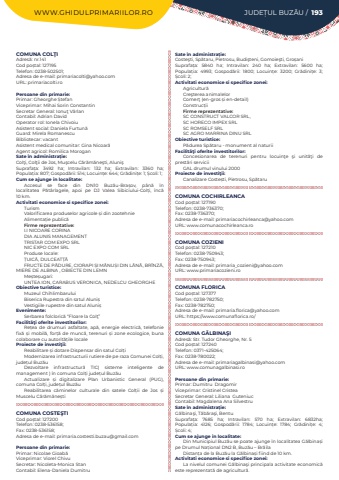 WWW.GHIDULPRIMARIILOR.RO JUDE%u021aUL BUZ%u0102U / 193COMUNA COL%u0162IAdres%u0103: nr.141Cod po%u0219tal: 127195Telefon: 0238-502501; Adresa de e-mail: primariacolti@yahoo.comURL: primariacolti.roPersoane din primarie:Primar: Gheorghe %u0218tefanViceprimar: Mihai Sorin ConstantinSecretar General: Ionu%u0163 V%u00e2rlanContabil: Adrian DavidOperator rol: Ionela ChivoiuAsistent social: Daniela Furtun%u0103Guard: Mirela RomanescuBibliotecar: vacantAsistent medical comunitar: Gina Nicoar%u0103Agent agricol: Romilica MoroganSate %u00een administra%u021bie:Col%u0163i, Col%u0163ii de Jos, Mu%u015fcelu C%u0103r%u0103m%u0103ne%u015fti, Aluni%u015fSuprafa%u021ba:%u00a0 3492 ha; Intravilan:%u00a0 132 ha; Extravilan:%u00a0 3360 ha; Popula%u021bia:%u00a0807; Gospod%u0103rii:%u00a0514; Locuin%u021be:%u00a0644; Gr%u0103dini%u021be:%u00a01; %u0218coli:%u00a01; Cum se ajunge in localitate:Accesul se face din%u00a0 DN10%u00a0 Buz%u0103u-Bra%u0219ov, p%u00e2n%u0103 %u00een localitatea%u00a0 P%u0103t%u00e2rlagele, apoi pe DJ%u00a0 Valea Sibiciului-Col%u021bi, %u00eenc%u0103 10%u00a0km.Activitati economice si specifice zonei:TurismValorificarea produselor agricole %u0219i din zootehnieAlimenta%u021bie public%u0103 Firme reprezentative: I.I NICOARE CORINADIA ALUNIS MANAGEMENTTRISTAR COM EXPO SRLNIC EXPO COM SRLProduse locale:%u021aUIC%u0102, DULCEAT%u021a%u0102FRUCTE DE P%u0102DURE, CIORAPI %u0218I M%u0102NU%u0218I DIN L%u00c2N%u0102, BR%u00ceNZ%u0102, MIERE DE ALBINA , OBIECTE DIN LEMNMe%u0219te%u0219ugari: UNTEA ION, CARABUS VERONICA, NEDELCU GHEORGHEObiective turistice:Muzeul ChihlimbaruluiBiserica Rupestra din satul Aluni%u0219Vestigiile rupestre din satul Aluni%u0219Evenimente:Serbarea folcloric%u0103 %u201cFloare la Col%u0163%u201dFacilit%u00e3%u0163i oferite investitorilor:Re%u021bea de drumuri asfaltate, ap%u0103, energie electric%u0103, telefonie fix%u0103%u00a0 %u0219i mobil%u0103, for%u021b%u0103%u00a0 de munc%u0103, terenuri %u0219i zone ecologice, buna colaborare cu autorit%u0103%u021bile localeProiecte de investi%u0163ii:Reabilitare %u0219i dotare Dispensar din satul Col%u021biModernizarea infrastructurii rutiere de pe raza Comunei Col%u021bi, jude%u021bul Buz%u0103uDezvoltare infrastructur%u0103 TIC( sisteme inteligente de management ) %u00een comuna Col%u021bi jude%u021bul Buz%u0103uActualizare %u0219i digitalizare Plan Urbanistic General (PUG), comuna Col%u021bi, jude%u021bul Buz%u0103uReabilitarea c%u0103minelor culturale din satele Col%u021bii de Jos %u0219i Muscelu C%u0103r%u0103m%u0103ne%u0219tiCOMUNA COSTE%u015eTICod po%u0219tal: 127200Telefon: 0238-536158; Fax: 0238-536158; Adresa de e-mail: primaria.costesti.buzau@gmail.comPersoane din primarie:Primar: Nicolae Gioab%u0103Viceprimar: Viorel ChivuSecretar: Nicoleta-Monica StanContabil: Elena-Daniela DumitruSate %u00een administra%u021bie:Coste%u015fti, Sp%u0103taru,%u00a0Pietrosu,%u00a0Budi%u015fteni, Gomoie%u015fti, Gro%u0219aniSuprafa%u021ba:%u00a0 5840 ha; Intravilan:%u00a0 240 ha; Extravilan:%u00a0 5600 ha; Popula%u021bia:%u00a0 4993; Gospod%u0103rii:%u00a0 1800; Locuin%u021be:%u00a0 3200; Gr%u0103dini%u021be:%u00a0 3; %u0218coli:%u00a02; Activitati economice si specifice zonei:Agricultur%u0103Cre%u015fterea animalelorComer%u0163 (en-gros %u0219i en-detail)Construc%u021biiFirme reprezentative:SC CONSTRUCT VALCOR SRL,SC HORECO IMPEX SRLSC ROMSELF SRLSC AGRO MARRINA DINU SRLObiective turistice:P%u0103durea Sp%u0103taru - monument al naturiiFacilit%u00e3%u0163i oferite investitorilor:Concesionarea de terenuri pentru locuin%u0163e %u015fi unit%u0103%u0163i de prest%u0103ri serviciiGAL drumul vinului 2000Proiecte de investi%u0163ii:Canalizare Coste%u0219ti, Pietrosu, Sp%u0103taruCOMUNA COCHIRLEANCACod po%u0219tal: 127190Telefon: 0238-736370; Fax: 0238-736370; Adresa de e-mail: primariacochirleanca@yahoo.comURL: www.comunacochirleanca.roCOMUNA COZIENICod po%u0219tal: 127210Telefon: 0238-750943; Fax: 0238-750943; Adresa de e-mail: primaria_cozieni@yahoo.comURL: www.primariacozieni.roCOMUNA FLORICACod po%u0219tal: 127377Telefon: 0238-782750; Fax: 0238-782750; Adresa de e-mail: primaria.florica@yahoo.comURL: https://www.comunaflorica.ro/COMUNA G%u0102LBINA%u015eIAdres%u0103: Str. Tudor Gheorghe, Nr. 5Cod po%u0219tal: 127240Telefon: 0371-425064; Fax: 0238-780022; Adresa de e-mail: primariagalbinasi@yahoo.comURL: www.comunagalbinasi.roPersoane din primarie:Primar: Dumitru%u00a0%u00a0Dragomir%u00a0Viceprimar:%u00a0Cristinel%u00a0Cristea%u00a0Secretar General:%u00a0Liliana%u00a0%u00a0GuteniucContabil: Magdalena Ana Silvestru%u00a0Sate %u00een administra%u021bie:G%u0103lbina%u015fi, T%u0103b%u0103ra%u015fi, BentuSuprafa%u021ba:%u00a0 7685 ha; Intravilan:%u00a0 570 ha; Extravilan:%u00a0 6832ha; Popula%u021bia:%u00a0 4126; Gospod%u0103rii:%u00a0 1784; Locuin%u021be:%u00a0 1784; Gr%u0103dini%u021be:%u00a0 4; %u0218coli:%u00a04; Cum se ajunge in localitate:Din Municipiul Buz%u0103u se poate ajunge %u00een localitatea G%u0103lbina%u0219i pe Drumul Na%u021bional DN2 B, Buz%u0103u %u2013 Br%u0103ilaDistan%u021ba de la Buz%u0103u la G%u0103lbina%u0219i fiind de 10 km.Activitati economice si specifice zonei:La nivelul comunei G%u0103lbina%u015fi principala activitate economic%u0103 este reprezentat%u0103 de agricultur%u0103.