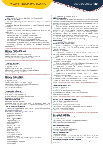 WWW.GHIDULPRIMARIILOR.RO JUDE%u021aUL BUZ%u0102U / 201Evenimente:Ziua localit%u0103%u0163ii, %u00een prima duminic%u0103 a lunii octombrieProiecte de investi%u0163ii:%u00cenfiin%u021bare re%u021bea de gaze naturale %u00een ora%u0219ul Pogoanele %u0219i satul C%u0103ld%u0103r%u0103%u0219tiAsfaltare drumuri de interes local %u00een ora%u0219ul Pogoanele %u0219i satul C%u0103ld%u0103r%u0103%u0219tiCentura ora%u0219%u00a0Pogoanele %u2013 tronson 1Dotare cu mobilier %u0219i echipamente digitale a unit%u0103%u021bilor de %u00eenv%u0103%u021b%u0103m%u00e2ntConstruire de locuin%u021be nZEB%u00a0pentru tineriDezvoltarea serviciilor de educa%u021bie timpurieConstruire baz%u0103%u00a0sportiv%u0103%u00a0tip 1 %u00een ora%u0219ul PogoaneleConstruire %u0219i dotare gr%u0103dini%u021b%u0103%u00a0%u00een satul C%u0103ld%u0103r%u0103%u0219tiConstruire blocuri de locuin%u021be sociale %u00een ora%u0219ul PogoaneleCre%u0219terea eficien%u021bei energetice a sistemului de iluminat publicCre%u0219terea eficien%u021bei energetice a sediului prim%u0103riei ora%u0219%u00a0PogoaneleCOMUNA PO%u015eTA C%u00c2LN%u0102UCod po%u0219tal: 127485Telefon: 0238-521102; Fax: 0238-521873; Adresa de e-mail: primariapostacalnau@gmail.comURL: http://www.comunapostacilnau.ro/COMUNA PUIE%u015eTIAdres%u0103: Strada nr. 1, nr. 44Cod po%u0219tal: 127495Telefon: 0238-730903; Fax: 0238-776109; Adresa de e-mail: secretar@primariapuiesti-bz.roURL: www.primariapuiesti-bz.roCOMUNA RACOVI%u0162ENIAdres%u0103: Str. Principal%u0103, Nr. 59Cod po%u0219tal: 127505Telefon: 0238-798134; Fax: 0238-798134; Adresa de e-mail: primariaracoviteni@yahoo.com primariaracoviteni@racoviteni.roURL: https://racoviteni.ro/Persoane din primarie:Primar: Vergilius%u00a0Luis ManuViceprimar: Costel Vasile Robe%u00a0Secretar General:%u00a0Amalia Cleopatra Ghioca%u00a0Contabil: Mihaela Livia C%u0103linSate %u00een administra%u021bie:Racovi%u0163eni,%u00a0Budrea, Petri%u015foruSuprafa%u021ba:%u00a0 3150 ha; Intravilan:%u00a0 860 ha; Extravilan:%u00a0 2290 ha; Popula%u021bia:%u00a01192; Gospod%u0103rii:%u00a0659; Locuin%u021be:%u00a0657; Gr%u0103dini%u021be:%u00a02; %u0218coli:%u00a02; Cum se ajunge in localitate:Se ajunge din E85, pe DC111 sau pe DS 220 prin comuna Po%u0219ta C%u00e2lnau-comuna Z%u0103rne%u0219tiActivitati economice si specifice zonei:Cultivarea terenuluiCre%u015fterea animalelorComer%u021bFirme reprezentative:TRANS ALIM 2005ALEX MAD COMROXISTROPF BUZAIANU IONAGER LIQUIDE SRLDANISTRO SRLROBALEX SRLPFA LUPU IULIANTARRA SAN LINE SRLProduc%u0103tori locali:Fermieri care produc %u0219i valorific%u0103%u00a0produse lactateProduse locale:Produse apicole organiceMe%u0219te%u0219ugari:Produc%u0103tor de foi%u0219oare de lemnObiective turistice:Dou%u0103 obiective de pe teritoriul comunei Racovi%u021beni sunt incluse pe lista monumentelor istorice din jude%u021bul Buz%u0103u, ca monumente de interes local, ambele clasificate ca situri arheologice %u0219i aflate %u00een preajma satului Petri%u0219oru.Situl de la %u201eMuchia B%u0103jenarului%u201d din latura sud-estic%u0103 a satului, cuprinde o a%u0219ezare din epoca migra%u021biilor (cultura Cerneahov, secolul al IV-lea e.n.); %u0219i o a%u0219ezare mai veche, apar%u021bin%u00e2nd culturii Monteoru din Epoca Bronzului (mileniul al II-lea %u00ee.e.n.), a%u0219ezare emblematic%u0103 pentru un aspect particular al acestei culturi arheologice, aspect denumit %u201ePetri%u0219oru-Racovi%u021beni%u201d. Al doilea sit se afl%u0103 pe dealul %u0218umurdoaia, la sud-est de sat, %u0219i dateaz%u0103 din epoca migra%u021biilor (secolul al V-lea).Evenimente:29 AUGUST-ZIUA COMUNEIFacilit%u00e3%u0163i oferite investitorilor:Drumuri modernizate, energie electric%u0103, iluminat stradal, soluri de caliate, for%u021b%u0103%u00a0 de munc%u0103, spa%u021bii pentru dezvoltare microintreprinderiProiecte de investi%u0163ii:Modernizare, reabilitare %u0219i dotare Scoala Gimnaziala %u00een Comuna Racovi%u021beni, jude%u021bul Buz%u0103uModernizare drumuri locale %u00een comuna Racovi%u021beni, jude%u021bul Buz%u0103uModernizarea %u0219i reabilitarea %u0218coala Gimnazial%u0103 %u00een comuna Racovi%u021beni, jude%u021bul Buz%u0103uDotarea cu mobilier, materiale didactice %u0219i echipamente a %u0218colii Gimnaziale Racovi%u021beni, jude%u021bul Buz%u0103uContinuarea lucr%u0103rilor de cadastru sistematic pentru extravilanul comunei Racovi%u021beniModernizarea %u0219i eficientizarea sistemului de iluminat publicDJ 220Modernizarea %u0219i reabilitarea C%u0103min Cultural %u00een Comuna Racovi%u021beni, jude%u021bul Buz%u0103uDotarea cu echipamente IT necesare unui sistem informaticechipamente It, echipamente pentru comunica%u021bii %u0219i echipamente conexe, inclusiv licen%u021be, Racovi%u021beni, jude%u021bul Buz%u0103uCOMUNA R%u00c2MNICELUAdres%u0103: Str. Unirii, Nr. 11Cod po%u0219tal: 127510Telefon: 0238-775707; Fax: 0238-775708; Adresa de e-mail: primaria_rimnicelu@yahoo.comURL: www.rimnicelu.roMUNICIPIUL R%u00c2MNICU S%u0102RATAdres%u0103: B-dul Nicolae B%u0103lcescu, nr. 1Cod po%u0219tal: 125300Telefon: 0238-561946; Fax: 0238-561947; Adresa de e-mail: primarie_rmsarat@primariermsarat.roprimarie_rmsarat@yahoo.comURL: www.primariermsarat.roCOMUNA ROBEASCAAdres%u0103: %u0218oseaua Buz%u0103ului, nr. 29Cod po%u0219tal: 127515Adresa de e-mail: primaria_robeasca@yahoo.comURL: https://comunarobeasca.ro/Persoane din primarie:Primar: Domnica Vlad:%u00a0Secretar General: Liliana GheorgheContabil: Georgiana CosteaSate %u00een administra%u021bie:Robeasca,%u00a0Mo%u0219e%u0219tiSuprafa%u021ba:%u00a0 2667,05 ha; Intravilan:%u00a0 166 ha; Extravilan:%u00a0 2501,05 ha; Popula%u021bia:%u00a01162; Gospod%u0103rii:%u00a0508; Locuin%u021be:%u00a0572; Gr%u0103dini%u021be:%u00a02; %u0218coli:%u00a01; Activitati economice si specifice zonei:Principala activitate economic%u0103 este dat%u0103 de agricultur%u0103 cu ramurile: