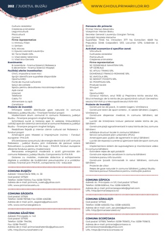 202 / JUDE%u021aUL BUZ%u0102U WWW.GHIDULPRIMARIILOR.ROCultura cerealelorCre%u0219terea animalelorLegumicultur%u0103Piscicultur%u0103Comer%u021bFirme reprezentative:I.I. Mintoiu FilianI.I. %u0218erbanN.N. MirceaI.I. Epura%u0219 Leonard-Lauren%u021biuSC Tarra Madin SRLI.I. Vlad Adela-ValentinaI.I. Vlad Ana-DanielaEvenimente:8 noiembrie - hramul bisericii Robeasca 6 decembrie %u2013 hramul bisericii Mo%u015fe%u015ftiFacilit%u00e3%u0163i oferite investitorilor:Chirii, impozite %u0219i taxe miciSprijin identificare suprafe%u021be disponibileOportunit%u0103%u021bi:For%u021b%u0103 de munc%u0103 suficent%u0103Soluri de calitateSpa%u021biu pentru dezvoltarea micro%u00eentreprinderilorAp%u0103-canalInternetTelefonieCablu TVAlimentare cu ap%u0103CanalizareProiecte de investi%u0163ii:%u00cenfiin%u0163are sistem distribu%u0163ie gaze naturale %u00een comuna Robeasca, jude%u0163ul Buz%u00e3u - finan%u0163are fonduri propriiModernizare drum comunal %u00een comuna Robeasca, jude%u0163ul Buz%u0103u - finan%u0163are program Anghel SalignySchimbare surs%u0103 %u015fi tratarea apei %u00een vederea %u00eembun%u0103t%u0103%u0163irii calit%u0103%u0163ii apei din sistemul centralizat al comunei Robeasca, jude%u0163ul Buz%u0103u - finan%u0163are program Anghel SalignyReabilitare fa%u0163ad%u0103 %u015fi interior c%u0103min cultural sat Robeasca %u2013 fonduri propriiAmenajare parc Mose%u0219ti %u0219i %u00eemprejmuire incinta %u2013 Fonduri europene %u2013P.N.D.R.Eficientizarea consumului de energie electric%u0103%u00a0la UAT comuna Robeasca , jude%u021bul Buzau prin instalarea de panouri solare fotovoltaice cu puterea de 134 kwp %u2013 P.N.R.R. fonduri europene aferente fondului pentru modernizareRenovarea energetic%u0103 moderat%u0103 a %u0219colii gimnaziale din comuna Robeasca, jude%u0163ul Buz%u0103u Componenta 10-P.N.R.R.Dotarea cu mobilier, materiale didactice %u0219i echipamente digitale a unit%u0103%u021bilor de %u00eenv%u0103%u021b%u0103m%u00e2nt preuniversitar %u0219i a unit%u0103%u021bilor conexe, finantat prin P.N.R.R., componenta C15 %u2013 educa%u021bieCOMUNA RU%u015eE%u0162UAdres%u0103: 1 Decembrie 1918, nr. 33Cod po%u0219tal: 127520Telefon: 0238-733104; Fax: 0238-733179; Adresa de e-mail: primarie_rusetu@yahoo.comURL: www.primariarusetu.roCOMUNA S%u0102GEATACod po%u0219tal: 127525Telefon: 0238-781168; Fax: 0338-406338; Adresa de e-mail: prim_sageata@yahoo.comURL: www.comunasageata.roCOMUNA S%u0102H%u0102TENIAdres%u0103: Principal%u0103, nr. 143Cod po%u0219tal: 127535Telefon: 0238- 794136; Fax: 0238-794137; Adresa de e-mail: primariasahatenibz@yahoo.comURL: http://comunasahateni.ro/Persoane din primarie:Primar:%u00a0Marius%u00a0AlexandruViceprimar:%u00a0Marian BratuSecretar General:%u00a0Lauren%u0163iu%u00a0Giorgian%u00a0Tama%u015f%u00a0%u00a0Contabil: Nicoleta%u00a0Matache%u00a0Suprafa%u021ba:%u00a0 7046 ha; Intravilan:%u00a0 377 ha; Extravilan:%u00a0 6669 ha; Popula%u021bia:%u00a0 3248; Gospod%u0103rii:%u00a0 1213; Locuin%u021be:%u00a0 1276; Gr%u0103dini%u021be:%u00a0 2; %u0218coli:%u00a02; Activitati economice si specifice zonei:Viticultur%u0103Cultivarea cerealelorPomicultur%u0103Cre%u015fterea animalelor Firme reprezentative:SC DOMENIILE SAHATENI SRLVP CEREALESC AFILIU TRANS SRLDOMENIILE FRANCO-ROMANE SRLSC AVICOLA SRLSC BANVIT FOODTS SRLSC POMPIGAS SRLProduse locale:StruguriVinOportunit%u0103%u0163i:Conacul Hariton, anul 1930 %u015fi Pepiniera Istrita secolul XIX, Situl Arheologic de la Istrita de jos apar%u0163in%u00e2nd culturii Cerneahov secolul XVI-XVII %u015fi o Mecropol%u0103 secolul XVIII-XIXProiecte de investi%u0163ii:Construire loc de joac%u0103 , %u00een satele Gageni, VintileancaConstruire teren de sport sintetic , %u00een satele S%u0103h%u0103teni ,Gageni, VintileancaConstruire dispensar medical, %u00een comuna S%u0103h%u0103teni, sat S%u0103h%u0103teniLucr%u0103ri de %u00eentre%u021binere trotuar pietonal satele Istrita de jos, S%u0103h%u0103teniConstruire pia%u0163%u0103 agroalimentar%u0103 %u00een satul Istrita de Jos, comuna S%u0103h%u0103teniAsfaltare drumuri locale %u00een comuna S%u0103h%u0103teniServicii actualizare plan urbanistic (PUG)Amenajare parc public de agrement %u00een satul S%u0103h%u0103teniLucr%u0103ri de repara%u0163ii curente %u015fi igienizare Sal%u0103 de sport comuna S%u0103h%u0103teniImplementare sistem de supraveghere %u015fi monitorizare video %u00een comuna S%u0103h%u0103teniExtindere re%u0163ea de ap%u0103 potabil%u0103Construire re%u0163ea de canalizare %u00een comuna S%u0103h%u0103teniInstalare panou info touristicConstruire %u015ecoal%u0103 Gimnazial%u0103 %u00een satul S%u0103h%u0103teni, comuna S%u0103h%u0103teniProiecte de viitor:Re%u0163ea de gaze naturale %u00een comuna S%u0103h%u0103teni, jude%u0163ul Buz%u0103u Montare panouri fotovoltaice pentru institu%u0163iile publiceCOMUNA S%u0102POCAAdres%u0103: str. Principala .nr.121; Cod po%u0219tal: 127540Telefon: 0238-508144; Fax: 0238-508479; Adresa de e-mail: primariasapocabz@gmail.comURL: http://primariasapoca.ro/COMUNA S%u0102RULE%u015eTICod po%u0219tal: 127545Telefon: 0338-405033; Fax: 0338-405033; Adresa de e-mail: com_sarulesti@yahoo.comURL: http://primariasarulesti.ro/COMUNA SCOR%u0162OASACod po%u0219tal: 127555; Telefon: 0238-705613,; Fax: 0238-705613; Adresa de e-mail: primaria@scortoasa.roprimariascortoasabz@yahoo.comURL: https://primaria.scortoasa.ro/