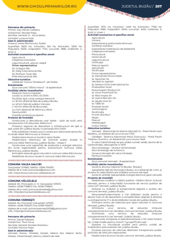 WWW.GHIDULPRIMARIILOR.RO JUDE%u021aUL BUZ%u0102U / 207Persoane din primarie:Primar: Ing.%u00a0Marian%u00a0Galbenu%u00a0Viceprimar: Nicolae PapuSecretar General: Jr.%u00a0%u00a0Ionu%u021b%u00a0%u0218erbuContabil: Luciana H%u00eerjaSate %u00een administra%u021bie:Oreavul, Valea R%u00e2mnicului, RublaSuprafa%u021ba:%u00a0 5625 ha; Intravilan:%u00a0 322 ha; Extravilan:%u00a0 5303 ha; Popula%u021bia:%u00a0 5500; Gospod%u0103rii:%u00a0 1734; Locuin%u021be:%u00a0 1885; Gr%u0103dini%u021be:%u00a0 4; %u0218coli:%u00a03; Activitati economice si specifice zonei:Agricultur%u0103Cre%u015fterea animalelorLegumicultur%u0103: usturoi, ceap%u0103 Firme reprezentative:SC Crisagra SRLSC Daily International SRLSC Profizon Twoo SRLPVB International SRL%u00a0Obiective turistice:Catedrala %u201cIzvorul T%u0103m%u0103duirii%u201d ,sat RublaEvenimente:Ziua comunei %u201cSf%u00e2nta Maria%u201d - 8 septembrieFacilit%u00e3%u0163i oferite investitorilor:Reduceri taxe %u0219i impoziteLoca%u0163ii cu acces la DN2, DJ 203AFacilit%u0103%u0163i: ap%u0103, canal, energie electric%u0103La 30 km distan%u0163%u0103 fa%u0163%u0103 de jude%u0163ul Buz%u0103u,La%u00a040 km fa%u0163%u0103 de jude%u0163ul Vrancea,L 140 km distan%u021b%u0103 de Bucure%u015fti,La%u00a02 km distan%u021b%u0103 de R%u00e2mnicu S%u0103rat.Oportunit%u0103%u021bi:Investi%u021bii proiecte europeneProiecte de investi%u0163ii:Construirea %u0219i dezvoltarea unei re%u021bele %u2013 pilot de %u0219colii verzi Componenta C15: Educatie, Reforma 6Proiectul regional de dezvoltare a infrastructurii de ap%u0103%u00a0 %u0219i ap%u0103%u00a0uzat%u0103%u00a0din jude%u021bul Buz%u0103u %u00een perioada 2014-2020%u00cembun%u0103t%u0103%u021birea infrastructurii rutiere prin betonarea %u0219anturilor %u00een satale Valea R%u00e2mnicului %u0219i OreavulModernizare drumuri locale %u00een satul RublaModernizare sistemului de iluminat public stradal %u00een comuna%u00a0Valea R%u00e2mnicului, jude%u021bul Buz%u0103u %u2013 etapa IIConstruirea unei capacit%u0103%u021bi de produc%u021bie a energiei electrice din surse regenerabile pentru autoconsum Comuna Valea R%u00e2mnicului, jude%u021bul Buz%u0103uExtindere re%u021bea de gaze naturale %u00een comuna Valea R%u00e2mniculuiReabilitare drumuri locale %u00een comuna Valea R%u00e2mniculuiCOMUNA VALEA SALCIEICod po%u0219tal: 127665; Telefon: 0238-700201; Adresa de e-mail: primariavs@yahoo.comURL: https://www.comuna-valeasalciei.ro/COMUNA V%u00c2LCELELEAdres%u0103: Str. Principal%u0103, nr. 9; Cod po%u0219tal: 127670Telefon: 0238-776857; Fax: 0238-776857; Adresa de e-mail: primariavalcelele@yahoo.comURL: http://primariavilcelelebuzau.ro/COMUNA VERNE%u015eTIAdres%u0103: Str. Primariei; Cod po%u0219tal: 127675Telefon: 0238-705007; Fax: 0238-705017; Adresa de e-mail: primariavernesti2018@yahoo.comURL: https://primariavernestibuzau.ro/Persoane din primarie:Primar:%u00a0Daniel%u00a0N%u0103stase%u00a0Viceprimar:%u00a0Titus Ciau%u0219Secretar General:%u00a0Nicolae%u00a0Stoicescu%u00a0Contabil:%u00a0Monica%u00a0Popa%u00a0Sate %u00een administra%u021bie:Verne%u015fti, Niscov, C%u00eende%u015fti, Zore%u015fti, S%u0103senii Noi, S%u0103senii Vechi, Mierea, C%u00e2rlom%u0103ne%u015fti, Nenciu, S%u0103senii de ValeSuprafa%u021ba:%u00a0 9174 ha; Intravilan:%u00a0 1408 ha; Extravilan:%u00a0 7766 ha; Popula%u021bia:%u00a0 9189; Gospod%u0103rii:%u00a0 3500; Locuin%u021be:%u00a0 3455; Gr%u0103dini%u021be:%u00a0 5; %u0218coli:%u00a04; Licee:%u00a01; Activitati economice si specifice zonei:Agricultur%u0103Comer%u0163Exploatarea %u015fi prelucrarea lemnuluiConfec%u0163ii metaliceExploatarea materialului de balastier%u0103Cre%u015fterea animalelorPiscicultur%u0103Horticultur%u0103Legumicultur%u0103Vinifica%u0163iePescuit sportivApicultur%u0103Panifica%u021bieFirme reprezentativeSc Domeniile Prince MateiSc Agromec SaVerne%u0219ti Sc AgrisanSc Danero Chris Interna%u021bional SaProduc%u0103tori localiRusus Expert Product SrlSc Ginar Prod Panif SrlSc Rota Impex SrlSc Gama Ree Serv SrlSc Aaylex One Srl Sc Ti&Bi SrlProduse localeCarmangeriePanifica%u021bieFructe-dulce%u021buriP%u0103s%u0103riPescuitMe%u0219te%u0219ugari Guloiu AdrianObiective turistice:Verne%u015fti - Biserica Buna Vestire (Verne%u015fti II) - Preot Paroh Ioan Nedelcu, ce dateaz%u0103 din jurul anului 1700C%u00e2nde%u015fti - Biserica Adormirea Maicii Domnului - Preot Paroh Tr%u0103istaru Dumitru, ce dateaz%u0103 din jurul anului 1649%u00cen satul C%u00e2rlom%u0103ne%u015fti se pot vedea ruinele cet%u0103%u0163ii dacice de la C%u00e2rlom%u0103ne%u015fti, descoperite %u00een 1970Situl arheologic - Muzeul C%u00e2rlom%u0103ne%u015ftiSitul arheologic de la NenciuConacul Verne%u015fti din satul C%u00e2nde%u015ftiPensiuni turisticeEvenimente:Ziua comunei Verne%u015fti - 8 septembrieFacilit%u00e3%u0163i oferite investitorilor:Acces la drumul na%u0163ional 10 (Buz%u0103u- Bra%u015fov)Apropierea fa%u0163%u0103 de Municipiul Buz%u0103u, la o distan%u0163%u0103 de 4 km, %u015fi accesul la calea ferat%u0103 care str%u0103bate comuna Verne%u015ftiAcces la uitilit%u0103%u0163i: ap%u0103 potabil%u0103, energie electric%u0103, gaze naturaleProiecte de investi%u0163ii:Reabilitare moderat%u00a0a cl%u0103dirii publice- Cl%u0103dire C%u0103min Cultural Verne%u0219ti, pentru a %u00eembun%u0103t%u0103%u021bi furnizarea de servicii publice de catre UAT Verne%u0219ti, jude%u021bul Buz%u0103uDotarea cu mobilier %u0219i echipamente digitale a %u0219colilor din comuna Verne%u0219ti, jude%u021bul Buz%u0103uRenovarea/modernizarea a trei biblioteci locale pentru a deveni hub-uri de dezvoltare a competen%u021belor digitale %u0219i dotarea cu echipamente IT a 26 de biblioteci locale din jude%u021bul Buz%u0103u%u00cenfiin%u021bare centru de colectare prin aport voluntar %u00een Comuna Verne%u0219ti, jude%u021bul Buz%u0103u%u00cenfiin%u021barea unui serviciu de educa%u021bie timpurie complementar%u0103%u00a0%u00een sat C%u00e2nde%u0219ti, Comuna Verne%u0219ti, Jude%u021bul Buz%u0103u%u00cennfin%u021barea unui serviciu de educ