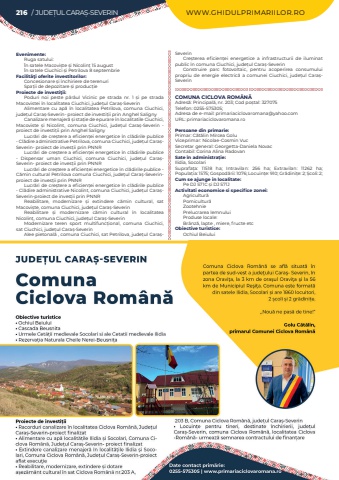 216 / JUDE%u021aUL CARA%u0218-SEVERIN WWW.GHIDULPRIMARIILOR.ROEvenimente:Ruga satului:%u00cen satele Macovi%u0219te %u0219i Nicolin%u021b 15 august%u00cen satele Ciuchici %u0219i Petrilova 8 septembrieFacilit%u00e3%u0163i oferite investitorilor:Concesionare %u0219i %u00eenchiriere de terenuriSpa%u021bii de depozitare %u0219i produc%u021bieProiecte de investi%u0163ii:Poduri noi peste p%u00e2r%u00e2ul Vicinic pe strada nr. 1 %u0219i pe strada Macovistei %u00een localitatea Ciuchici, jude%u021bul Cara%u0219-SeverinAlimentare cu ap%u0103%u00a0 %u00een localitatea Petrilova, comuna Ciuchici, jude%u021bul Cara%u0219-Severin- proiect de investi%u021bii prin Anghel SalignyCanalizare menajer%u0103%u00a0%u0219i sta%u021bie de epurare %u00een localitatile Ciuchici, Macoviste %u0219i Nicolint, comuna Ciuchici, jude%u021bul Cara%u0219-Severin%u00a0 - proiect de investi%u021bii prin Anghel SalignyLucr%u0103ri de cre%u0219tere a eficien%u021bei energetice %u00een cl%u0103dirile publice - Cl%u0103dire administrative Petrilova, comuna Ciuchici, jude%u021bul Cara%u0219Severin- proiect de inves%u021bii prin PNNRLucr%u0103ri de cre%u0219tere a eficien%u021bei energetice %u00een cl%u0103dirile publice - Dispensar uman Ciuchici, comuna Ciuchici, jude%u021bul Cara%u0219Severin- proiect de inves%u021bii prin PNNRLucr%u0103ri de cre%u0219tere a eficien%u021bei energetice %u00een cl%u0103dirile publice - C%u0103min cultural Petrilova comuna Ciuchici, jude%u021bul Cara%u0219-Severinproiect de inves%u021bii prin PNNRLucr%u0103ri de cre%u0219tere a eficien%u021bei energetice %u00een cl%u0103dirile publice - Cl%u0103dire administrative Nicolint, comuna Ciuchici, jude%u021bul Cara%u0219Severin-proiect de inves%u021bii prin PNNRReabilitare, modernizare %u0219i extindere c%u0103min cultural, sat Macovi%u0219te, comuna%u00a0Ciuchici, jude%u021bul%u00a0Cara%u0219-SeverinReabilitare %u0219i modernizare c%u0103min cultural %u00een localitatea Nicolin%u021b, comuna Ciuchici, jude%u021bul Cara%u0219-SeverinModernizare teren sport multifunc%u021bional, comuna Ciuchici, sat Ciuchici, jude%u021bul Cara%u0219-SeverinAlee pietonal%u0103 , comuna Ciuchici, sat Petrilova, jude%u021bul Cara%u0219SeverinCre%u0219terea eficien%u021bei energetice a infrastructurii de iluminat public %u00een comuna Ciuchici, jude%u021bul Cara%u0219-SeverinConstruire parc fotovoltaic, pentru acoperirea consumului propriu de energie electric%u0103 a comunei Ciuchici, jude%u021bul Cara%u0219SeverinCOMUNA CICLOVA ROM%u00c2N%u0102Adres%u0103: Principal%u0103, nr. 203; Cod po%u0219tal: 327075Telefon: 0255-575305; Adresa de e-mail: primariaciclovaromana@yahoo.comURL: primariaciclovaromana.roPersoane din primarie:Primar: C%u0103t%u0103lin Mircea GoluViceprimar: Nicolae-Cosmin%u00a0Vuc%u00a0Secretar general: Georgetta-Daniela%u00a0Novac%u00a0Contabil:%u00a0Corina%u00a0Alina%u00a0Radovan%u00a0Sate %u00een administra%u021bie:Ilidia, SocolariSuprafa%u021ba:%u00a0 11518 ha; Intravilan:%u00a0 256 ha; Extravilan:%u00a0 11262 ha; Popula%u021bia:%u00a01575; Gospod%u0103rii:%u00a01076; Locuin%u021be:%u00a0910; Gr%u0103dini%u021be:%u00a02; %u0218coli:%u00a02; Cum se ajunge in localitate:Pe DJ 571C %u0219i DJ 571JActivitati economice si specifice zonei:Agricultur%u0103Pomicultur%u0103Zootehnie Prelucrarea lemnuluiProduse locale:Br%u00e2nz%u0103, lapte , miere, fructe etcObiective turistice:Ochiul Beiului