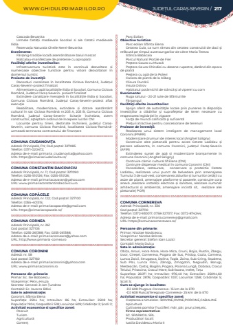 WWW.GHIDULPRIMARIILOR.RO JUDE%u021aUL CARA%u0218-SEVERIN / 217Cascada BeusnitaUrmele Cet%u0103%u021bii medievale Socolari si ale Cetatii medievale IlidiaRezerva%u021bia Naturala Cheile Nerei-BeusnitaEvenimente:F%u0103r%u0219ang-tradi%u021bie local%u0103%u00a0asem%u0103n%u0103toare balul mascatMatcalau-manifestare de prietenie cu apropia%u021biiFacilit%u00e3%u0163i oferite investitorilor:Infrastrusctura turistic%u0103%u00a0 este %u00een continu%u0103%u00a0 dezvoltare %u0219i numeroase obiective turistice pentru viitorii dezvoltatori %u00een domeniul turisticProiecte de investi%u0163ii:Racorduri canalizare %u00een localitatea Ciclova Rom%u00e2n%u0103, Jude%u021bul Cara%u0219-Severin-proiect finalizatAlimentare cu ap%u0103%u00a0localit%u0103%u021bile Ilidia %u0219i Socolari, Comuna Ciclova Rom%u00e2n%u0103, Jude%u021bul Cara%u0219-Severin- proiect finalizatExtindere canalizare menajer%u0103%u00a0%u00een localit%u0103%u021bile Ilidia %u0219i Socolari, Comuna Ciclova Rom%u00e2n%u0103, Jude%u021bul Cara%u0219-Severin-proiect aflat execu%u0163ieReabilitare, modernizare, extindere %u0219i dotare a%u0219ez%u0103m%u00e2nt cultural %u00een sat Ciclova Rom%u00e2n%u0103%u00a0nr.203 A, 203 B, Comuna Ciclova Rom%u00e2n%u0103, jude%u021bul Cara%u0219-Severin- licita%u021bie %u00eencheiata, avem constructor, a%u015fteptam ordinul de %u00eencepere lucr%u0103ri CNILocuin%u021be pentru tineri, destinate %u00eenchirierii, jude%u021bul Cara%u0219Severin, comuna Ciclova Rom%u00e2n%u0103, localitatea Ciclova-Rom%u00e2n%u0103urmeaz%u0103%u00a0semnarea contractului de finan%u021bareCOMUNA CIUDANOVI%u0162AAdres%u0103: Principal%u0103, FN; Cod po%u0219tal: 327085Telefon: 0371-020472; Adresa de e-mail: primaria_ciudanovita@yahoo.comURL: https://primariaciudanovita.ro/COMUNA CONSTANTIN DAICOVICIUAdres%u0103: Principal%u0103, nr. 11; Cod po%u0219tal: 327090Telefon: 0255-510126; Fax: 0255-510126; Adresa de e-mail: primariacavaran@yahoo.comURL: www.primariaconstantindaicoviciu.roCOMUNA COP%u0102CELEAdres%u0103: Principal%u0103, nr. 122; Cod po%u0219tal: 327100Telefon: 0355-401315; Adresa de e-mail: primariacopacele@gmail.comURL: https://primariacopacele.ro/COMUNA CORNEAAdres%u0103: Principal%u0103, nr. 261Cod po%u0219tal: 327105Telefon: 0255-261388; Fax: 0255-261388; Adresa de e-mail: primariacorneacs@yahoo.comURL: http://www.primaria-cornea.roCOMUNA CORONINIAdres%u0103: nr. 58Cod po%u0219tal: 327160Adresa de e-mail: primariacoronini@yahoo.comURL: www.primariacoronini.roPersoane din primarie:Primar: Ec. Ilie Boboescu%u00a0Viceprimar:%u00a0Petru HruzaSecretar General: Jr.Ion %u021aundrea%u00a0Contabil: Ec.%u00a0Iavorca B%u0103loi%u00a0Sate %u00een administra%u021bie:Coronini, Sf%u00e2nta ElenaSuprafa%u021ba:%u00a0 2594 ha; Intravilan:%u00a0 86 ha; Extravilan:%u00a0 2508 ha; Popula%u021bia:%u00a01904; Gospod%u0103rii:%u00a0518; Locuin%u021be:%u00a0609; Gr%u0103dini%u021be:%u00a02; %u0218coli:%u00a02; Activitati economice si specifice zonei:PescuitTurismAgricultur%u0103 Comer%u0163Parc EolianObiective turistice:Parc eolian Sf%u00e2nta ElenaCetatea Cula, ca turn r%u0103mas din cetatea construit%u0103 de daci %u015fi ref%u0103cut%u0103 pe timpul austroungarilor de c%u0103tre Maria TerezaSt%u00e2nca BabacaiaParcul Natural Por%u0163ile de FierPe%u015ftera Gaura cu Musc%u0103Pe%u015ftera Gaura Chindiei cu desene rupestre, dat%u00e2nd din epoca de piatr%u0103Pe%u015ftera cu ap%u0103 de la PoleviCariera de piatr%u0103 de la AlibegClisura Dun%u0103riiInsula OstrovHabitatul pot%u00e2rnichii de st%u00e2nc%u0103 %u015fi al viperei cu cornEvenimente:Ruga satului - 20-21 iulie de Sf%u00e2ntul IlieF%u0103r%u015fangulFacilit%u00e3%u0163i oferite investitorilor:Sprijin oferit de autorit%u0103%u0163ile locale prin punerea la dispozi%u0163ia investi%u0163iilor a cl%u0103dirilor %u015fi suprafe%u0163elor de teren necesare cu respectarea legisla%u0163iei %u00een vigoareFor%u0163%u0103 de munc%u0103 calificat%u0103 %u015fi suficent%u0103Pre%u0163uri atractive pentru concesionare de terenuriProiecte de investi%u0163ii:Realizarea unui sistem inteligent de management local Coronini.(PNRR)Modernizare drumuri de interes local (Anghel Saligny)Construire alee pietonal%u0103 pentru acces Cetate Ladislau %u0219i parcare adiacenta, %u00een comuna Coronini, jude%u021bul Cara%u0219-Severin (AFIR)Extinderea sursei de ap%u0103%u00a0 %u0219i modernizare bran%u0219amente %u00een comuna Coronini (Anghel Saligny)Contruire c%u0103min cultural Sf.Elena (CNI)Contruire dispensar medical %u00een comuna Coronini (CNI)Consolidare, restaurare,%u00a0 conservare %u0219i protectie Cetate Ladislau, realizarea unui punct de belvedere prin amenajarea Turnului 3 de sud-vest, conservarea zidurilor %u0219i turnurilor cet%u0103%u021bii cu asize de piatr%u0103, amenajare platforme %u0219i pasarele, construire corp anex%u0103 ,realizare instala%u021bii electrice %u0219i sanitare, realizare iluminat arhitectural %u0219i ambiental, amenajare incint%u0103%u00a0 sit,%u00a0 realizare alei pietonale( POR)COMUNA CORNEREVAAdres%u0103: Principal%u0103, nr. 330Cod po%u0219tal: 327110Telefon: 0372-930017, 0758-327317; Fax: 0372-874244; Adresa de e-mail: primaria.cornereva@gmail.comURL: https://comunacornerevacs.ro/Persoane din primarie:Primar: Nicolae Nov%u0103cescu%u00a0Viceprimar: Nicolae Br%u00eenzeiSecretar general: %u0218tefan Ioan Lozici%u00a0Contabil: Maria DuicuSate %u00een administra%u021bie:Obi%u021ba, Arsuri, Hora-Mare, Hora-Mica, Gruni, Bojia, Rustin, Zbegu, Izvor, Cire%u0219el, Cornereva, Pogara de Sus, Prislop, Cozia, Camena, Lunca Zaicii, Strugasca, Dolina, Topla, Zoina, Sub Cring, Studena, Sub Plai, Lunca Florii, Z%u0103nogi, Zmogotin, Negiudin, Borugi, Mesteac%u0103n, Costi%u015f, Bogilin, Pogara, Poiana Lung%u0103, Dobraia, Cracul Teiului, Prisacina, Cracul Mare, Sc%u00e2risoara, Inele%u021b, Ta%u021buSuprafa%u021ba:%u00a0 26071 ha; Intravilan:%u00a0 976,40 ha; Extravilan:%u00a0 25094,60 ha; Popula%u021bia:%u00a02876; Gospod%u0103rii:%u00a01031; Locuin%u021be:%u00a01258; Gr