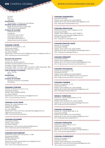238 / JUDE%u021aUL C%u0102L%u0102RA%u0218I WWW.GHIDULPRIMARIILOR.ROComer%u0163ServiciiIndustrieEvenimente:%u201cZiua Eroilor%u201d, %u00een fiecare an de %u00cen%u0103l%u0163areFacilit%u00e3%u0163i oferite investitorilor:Re%u0163ea de alimentare cu ap%u0103 100%Str%u0103zi pietruite %u015fi asfaltateProiecte de investi%u0163ii:Modernizare str%u0103ziCanalizareIntroducere gaz metanAmenajare spa%u0163ii verziAmenajare baz%u0103 sportiv%u0103Modernizare iluminat publicCOMUNA CRIV%u0102%u021aAdres%u0103: Str. Principal%u0103. nr. 119Cod po%u0219tal: 915103Telefon: 0374-091271; Fax: 0374-091285; Adresa de e-mail: primariacrivat@yahoo.com, crivat@cl.e-adm.roURL: http://www.comunacrivat.ro/Persoane din primarie:Primar: Ion Catan%u0103Viceprimar: Niculae ValentinSecretar General: %u0218tefania Cristina FloreaContabil: Cristian Petri%u0219or BrutuSuprafa%u021ba:%u00a0 2569; Intravilan:%u00a0 280; Extravilan:%u00a0 2289; Popula%u021bia:%u00a0 1815; Gospod%u0103rii:%u00a0960; Locuin%u021be:%u00a0960; Gr%u0103dini%u021be:%u00a01; %u0218coli:%u00a01; Cum se ajunge in localitate:DN 4 %u2013DJ 301 DJ 411Evenimente:Ziua comuneiProiecte de investi%u0163ii:%u00cenfiin%u021bare trotuare %u00een localitate CanalizareCOMUNA CURCANIAdres%u0103: str.Penes Curcanul ,nr 45Cod po%u0219tal: 917040Telefon: 0242-526258, 526153; Fax: 0242-526070; Adresa de e-mail: primariacurcani@gmail.comURL: www.primariacurcani.roCOMUNA CUZA VOD%u0102Adres%u0103: Str. Calea C%u00e2l%u00e2ra%u015fi, nr 24Cod po%u0219tal: 917045Telefon: 0242-339397; Fax: 242-339397; Adresa de e-mail: primariacuzavodacalarasi@gmail.comcl@primariacuzavoda.roURL: www.primariacuzavoda.roCOMUNA DICHISENICod po%u0219tal: 917050Telefon: 0242-313637; Fax: 0242-700401; Adresa de e-mail: primaria.dichiseni@yahoo.roURL: http://www.primariadichiseni.roCOMUNA DOR M%u0102RUNTAdres%u0103: Sos. Bucuresti-Constanta , nr 229Cod po%u0219tal: 917055Telefon: 0242-644111; Fax: 0242-644111; Adresa de e-mail: primariadormarunt@yahoo.comdormarunt@cl.e-adm.roURL: www.comunadormarunt.roCOMUNA DOROBAN%u0162UCod po%u0219tal: 917065Telefon: 0242-335103; Fax: 0242-335103; Adresa de e-mail: primariadorobantu@yahoo.comURL: https://primariadorobantu.ro/COMUNA DRAGALINAAdres%u0103: B-dul Gen. Ioan Dragalina ,nr 46Cod po%u0219tal: 917080Telefon: 0242-708073; Fax: 0242-708074; Adresa de e-mail: pdragalina@gmail.compdragalina@yahoo.comURL: http://comunadragalina.ro/COMUNA DRAGO%u015e VOD%u0102Adres%u0103: str PrincipalaCod po%u0219tal: 917085Telefon: 0242-345711; Fax: 0242-345711; Adresa de e-mail: secretar@primariadragosvoda.roURL: http://primariadragosvoda.roCOMUNA FR%u0102SINETCod po%u0219tal: 917090Telefon: 0242-645908; Fax: 0242-645908; Adresa de e-mail: primariafrasinet2008@yahoo.comURL: http://www.primariacomuneifrasinet.ro/COMUNA FRUMU%u015eANIAdres%u0103: str.Principala , nr 81Cod po%u0219tal: 917100Telefon: 0242-516012; Fax: 0242-516007; Adresa de e-mail: office@primaria-frumusani.roURL: https://www.primaria-frumusani.ro/COMUNA FUNDENIAdres%u0103: Trandafirilor, nr. 25Cod po%u0219tal: 917110Telefon: 0242-516306; Fax: 0242-516306; Adresa de e-mail: primariafundenicl@yahoo.comURL: https://primariafundeni.ro/ORA%u0218UL FUNDULEAAdres%u0103: str. Mihail Kogalniceanu, nr. 18Cod po%u0219tal: 915200Telefon: 0242-642084; Fax: 0242-642030; Adresa de e-mail: primariafundulea@yahoo.comURL: www.primaria-fundulea.roCOMUNA G%u0102LBINA%u015eIAdres%u0103: str. 1 Decembrie 1918, nr 16Cod po%u0219tal: 917285Telefon: 0242-516814; Fax: 0242-516814; Adresa de e-mail: primaria.galbinasi@yahoo.comURL: https://primaria-galbinasi.ro/COMUNA GR%u0102DI%u015eTEAAdres%u0103: str.Calea C%u0103l%u0103ra%u0219i ,nr 54Cod po%u0219tal: 917115Telefon: 0242-336017; Fax: 0242-336164; Adresa de e-mail: primaria@primariagradistea.roURL: www.primariagradistea.roCOMUNA GURB%u0102NE%u015eTIAdres%u0103: Principal%u0103, nr. 3Cod po%u0219tal: 917120Telefon: 0242-317138; Fax: 0242-317320; Adresa de e-mail: primaria_gurbanesti@yahoo.comURL: http://www.gurbanesti.ro/