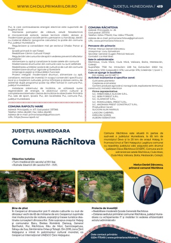WWW.GHIDULPRIMARIILOR.RO JUDE%u021aUL HUNEDOARA / 419Pui, la care contravaloarea energiei electrice este suportat%u0103 de bugetul localMontarea pompelor de c%u0103ldur%u0103, celul%u0103 fotoelectric%u0103 %u015fi microcentral%u0103 eolian%u0103, izolare termic%u0103 cl%u0103diri, dotare %u015fi modernizare grupuri sociale pentru persoane cu handicap, dot%u0103ri cu material didactic (programe calculator) la %u015fcolile din comuna Pui, jude%u0163ul HunedoaraRegularizare %u015fi consolidare mal pe sectorul Ohaba Ponor %u015fi Ponor%u015ecoal%u0103 primar%u0103 %u00een sat Fize%u015ftiReabilitare C%u0103min Cultural Fize%u015ftiRegulariz%u0103ri ale cursurilor de ap%u0103 %u00een vederea prevenirii efectelor inunda%u0163iilorAlimentare cu ap%u0103 %u015fi canalizare la toate satele din comun%u0103Modernizarea drumurilor din comun%u0103 care nu sunt asfaltateReabilitarea unit%u0103%u0163ilor %u015fcolare de cultur%u0103 %u015fi de cult din comun%u0103Modernizare drumuri agricole %u015fi forestiereAmenajare paji%u015fti %u015fi %u00eembun%u0103t%u0103%u0163iri funciareProiect integrat: modernizare drumuri, alimentare cu ap%u0103, canalizare, realizare de investi%u0163ii %u00een scopul conserv%u0103rii specificului local %u015fi a mo%u015ftenirii culturale, prima %u00eenfiin%u0163are %u015fi dotare centru de asisten%u0163%u0103 dup%u0103 programul %u015fcolar tip After School %u00een comuna Pui, jude%u0163ul HunedoaraInstalarea sistemului de %u00eenc%u0103lzire, ce utilizeaz%u0103 surse regenerabile de energie, la obiectivul c%u0103min cultural %u015fi completarea sistemelor clasice de %u00eenc%u0103lzire la obiectivele: Prim%u0103ria Pui, sala de sport, %u015ecoala Pui, din localitatea Pui, comuna Pui, jude%u0163ul HunedoaraCOMUNA RAPOLTU MAREAdres%u0103: Principal%u0103, nr. 67; Cod po%u0219tal: 337365Telefon: 0254-264181; Fax: 0254-264181; Adresa de e-mail: primariarapolt@yahoo.comURL: https://www.rapolt.ro/COMUNA R%u0102CHITOVAAdres%u0103: Principal%u0103, nr. 25Cod po%u0219tal: 337370Telefon: 0254-775410; Fax: 0254-775409; Adresa de e-mail: primariarachitova@gmail.comURL: www.primariarachitova.roPersoane din primarie:Primar: Marius Daniel D%u0103ncescuViceprimar: Liviu SimedroniSecretar General: Eugen Petric%u0103 NeiconiContabil: Lia Mali BaicSate %u00een administra%u021bie:R%u0103chitova, Ciula Mare, Ciula Mic%u0103,%u00a0 Valioara,%u00a0 Boita, Mesteac%u0103n, Gote%u015ftiSuprafa%u021ba:%u00a0 7150 ha; Intravilan:%u00a0 228 ha; Extravilan:%u00a0 6922 ha; Popula%u021bia:%u00a01210; Gospod%u0103rii:%u00a0576; Locuin%u021be:%u00a0576; Gr%u0103dini%u021be:%u00a01; %u0218coli:%u00a01; Cum se ajunge in localitate:Din Ha%u021beg, pe DJ 687 CActivitati economice si specifice zonei:Cultivarea plantelorCre%u015fterea animalelorComer%u021b%u00a0produse agricole %u0219i nonagricole, exploatarea lemnului, construc%u021bii, instala%u021bii electriceFirme reprezentative:S.C. IMBATABILII ALICOM S.R.L.S.C. SEBI FOREST S.R.L.S.C. CLAINHOF S.R.L.S.C. ROMGLOBAL PREST S.R.L.S.C. ANDMAN PREST CONSTRUCT S.R.L.Produc%u0103tori locali:SUCIONI ALIN MARIUSLASCONI GABRIELIORGONI SORINALBONI SEBASTIAN
