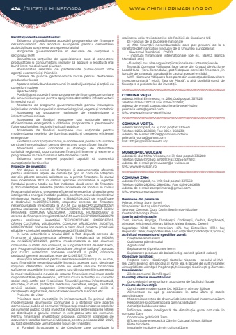 424 / JUDE%u021aUL HUNEDOARA WWW.GHIDULPRIMARIILOR.ROFacilit%u00e3%u0163i oferite investitorilor:Existen%u021ba %u0219i posibilitatea acces%u0103rii programelor de finan%u021bare nerambursabil%u0103 din Fonduri Europene pentru dezvoltarea activit%u0103%u021bii sau sus%u021binerea antreprenorialuluiPrograme guvernamentale %u00een derulare de sus%u021binere a sectorului IMMDezvoltarea lan%u021burilor de aprovizionare care s%u0103 conecteze produc%u0103torii %u0219i consumatorii, inclusiv s%u0103 asigure o leg%u0103tur%u0103 mai bun%u0103 %u00eentre mediul rural %u0219i urbanPosibilitatea realiz%u0103rii de parteneriate public-privat %u00eentre agen%u021bii economici %u0219i Prim%u0103rieCrearea de puncte gastronomice locale pentru desfacerea produselor locale A%u0219ezare relativ bun%u0103 a comunei %u00een cadrul jude%u021bului %u0219i a %u021b%u0103rii, cu conexiuni rutiereOportunit%u0103%u021bi:Posibilitatea acces%u0103rii unor programe de finan%u021bare comunitare ale Uniunii Europene pentru sprijinirea dezvolt%u0103rii infrastructurii %u00een mediul ruralAccesarea de programe guvernamentale pentru %u00eencurajarea ini%u021biativelor locale, %u00een special %u00een domeniul agricol, vegetal %u0219i zootehnicAccesarea de programe na%u021bionale de modernizare a infrastructurii rutiereAccesarea de fonduri europene sau na%u021bionale pentru eficientizarea energetic%u0103 a cl%u0103dirilor proprietate a persoanelor fizice sau juridice, inclusiv institu%u021bii publiceAccesarea de fonduri europene sau na%u021bionale pentru modernizarea re%u021belelor de iluminat public %u0219i cre%u0219terea eficien%u021bei energeticeExisten%u0163a unor spa%u021bii si cl%u0103diri, %u00een conservare, posibil a fi utilizate de c%u0103tre %u00eentreprinz%u0103tori pentru demararea unor afaceri localeAbordarea unor concepte %u0219i strategii de dezvoltare turistic%u0103 regional%u0103, oportunitatea finan%u021b%u0103rii interne %u0219i externe a programelor %u00een care turismul este domeniu %u021bint%u0103 Existen%u021ba unor me%u0219teri populari capabili s%u0103 transmit%u0103 cuno%u0219tin%u021bele lor tinerilorProiecte de investi%u0163ii:Am depus o cerere de finan%u021bare %u0219i documenta%u021bia aferent%u0103 pentru realizarea re%u021belei de distribu%u021bie gaz %u00een comuna V%u0103li%u0219oara dar din p%u0103cate aceast%u0103 solicitare nu a primit finan%u021bare. %u00cen cursul lunii noiembrie 2021 %u00een cadrul aplica%u021biei informatice a Agen%u021biei Fondului pentru Mediu au fost %u00eenc%u0103rcate dou%u0103 cereri de finan%u021bare %u0219i documenta%u021biile aferente pentru accesarea de fonduri %u00een cadrul Programului privind cre%u0219terea eficien%u021bei energetice %u0219i gestionarea inteligent%u0103 a energiei %u00een cl%u0103diri publice, conform prevederilor Ordinul Ministerului Apelor %u0219i P%u0103durilor nr.1548/07.09.2021 de modificare a Ordinului nr.2057/16.11.2020, respectiv cererea de finan%u021bare nerambursabil%u0103 %u00eenregistrat%u0103 la A.F.M. cu nr.EECP01202152200571 pentru realizarea investi%u021biei %u201dEFICIENTIZARE ENERGETIC%u0102 SEDIU PRIM%u0102RIE COMUNA V%u0102LI%u0218OARA, JUDE%u021aUL HUNEDOARA%u201d %u0219i cererea de finan%u021bare %u00eenregistrat%u0103 la A.F.M. cu nr.EECP01202152200570 pentru realizarea investi%u021biei %u201dEFICIENTIZARE ENERGETIC%u0102 C%u0102MIN CULTURAL V%u0102LI%u0218OARA, COMUNA V%u0102LI%u0218OARA, JUDE%u021aUL HUNEDOARA%u201d. Valoarea %u00eensumat%u0103 a celor dou%u0103 proiecte (cheltuieli eligibile + cheltuieli neeligibile) este de 2.975.436,17 lei.%u00cen luna octombrie a anului 2021 a fost depus%u0103 cererea de finan%u021bare %u0219i documenta%u021bia aferent%u0103, %u00eenregistrat%u0103 la MDLPA cu nr.122516/12.10.2021, pentru modernizarea a opt drumuri comunale %u0219i str%u0103zi din comun%u0103, %u00een lungime total%u0103 de 6,803 km., prin Programul Na%u021bional de Dezvoltare %u201eAnghel Saligny%u201d, aprobat prin O.U.G. nr.95/2021. Valoarea solicitat%u0103 la plat%u0103, conform devizului general actualizat este de 12.093.127,73 lei.Principala alternativ%u0103 pentru realizarea investi%u021biilor %u0219i nu numai, sunt finan%u021b%u0103rile nerambursabile %u00eentruc%u00e2t acestea sunt destinate sprijinirii dezvolt%u0103rii locale unde nu exist%u0103 resurse financiare suficiente accesibile %u00een mod curent sau din domenii %u00een care exist%u0103 %u00een mod tradi%u021bional o nevoie de resurse financiare mai mare dec%u00e2t disponibilit%u0103%u021bile (de exemplu, infrastructur%u0103 activit%u0103%u021bi cu caracter social etc.). Astfel pot fi solicitate finan%u021b%u0103ri pentru infrastructur%u0103, educa%u021bie, cultur%u0103, protec%u021bia mediului, cercetare, religie, s%u0103n%u0103tate, servicii sociale, cooperare interna%u021bional%u0103, drepturi civile si cet%u0103%u021bene%u0219ti, digitalizare, dezvoltare economic%u0103 si social%u0103 etc.Proiecte de viitorPrioritare sunt investi%u021biile %u00een infrastructur%u0103. %u00cen primul r%u00e2nd, modernizarea drumurilor comunale %u0219i a str%u0103zilor care apar%u021bin domeniului public al comunei V%u0103li%u0219oara %u0219i modernizarea re%u021belelor de iluminat public. O alt%u0103 investi%u021bie necesar%u0103 este realizarea re%u021belei de distribu%u021bie a gazului metan %u00een cele patru sate ale comunei. Pentru finan%u021barea investi%u021biilor propuse, conform Strategiei de dezvoltare local%u0103 a Comunei V%u0103li%u0219oara, pentru perioada 2021-2027, au fost identificate urm%u0103toarele tipuri de finan%u021b%u0103ri:a) Fonduri Structurale si de Coeziune care contribuie la realizarea celor trei obiective ale Politicii de Coeziune UEb) Fonduri de la bugetele na%u021bionalec) Alte finan%u021b%u0103ri nerambursabile care pot proveni de la o varietate de finan%u021batori (inclusiv de la Uniunea European%u0103):- Guvernul Rom%u00e2niei %u2013 PNRR- institu%u021bii financiare interna%u021bionale (de ex.: BERD, Banca Mondial%u01