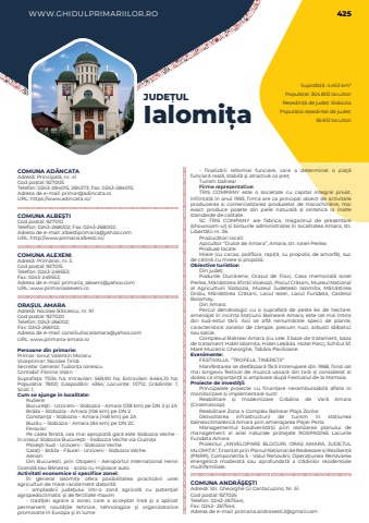 WWW.GHIDULPRIMARIILOR.RO 425Suprafa%u021b%u0103: 4.453 km%u00b2Popula%u021bie: 304.803 locuitoriRe%u0219edin%u021b%u0103 de jude%u021b: SloboziaPopula%u021bia re%u0219edin%u021bei de jude%u021b: 56.913 locuitoriJUDE%u021aULIalomi%u021baCOMUNA AD%u00c2NCATAAdres%u0103: Principal%u0103, nr. 41Cod po%u0219tal: 927005Telefon: 0243-284015, 284373; Fax: 0243-284015; Adresa de e-mail: primar@adincata.roURL: https://www.adincata.ro/COMUNA ALBE%u015eTICod po%u0219tal: 927010Telefon: 0243-268002; Fax: 0243-268002; Adresa de e-mail: albestiprimaria@yahoo.comURL: http://www.primariaalbesti.ro/COMUNA ALEXENIAdres%u0103: Prim%u0103riei, nr. 5Cod po%u0219tal: 927015Telefon: 0243-249553; Fax: 0243-249553; Adresa de e-mail: primaria_alexeni@yahoo.comURL: www.primariaalexeni.roORA%u0218UL AMARAAdres%u0103: Nicolae B%u0103lcescu, nr. 91Cod po%u0219tal: 927020Telefon: 0243-266102; Fax: 0243-266102; Adresa de e-mail: consiliullocalamara@yahoo.comURL: www.primaria-amara.roPersoane din primarie:Primar: Ionu%u021b Valentin MoraruViceprimar: Nicolae %u021aint%u0103Secretar General: Tudori%u021ba IonescuContabil: Florina Vi%u0219anSuprafa%u021ba:%u00a0 7034 ha; Intravilan:%u00a0 569,90 ha; Extravilan:%u00a0 6464,10 ha; Popula%u021bia:%u00a0 7800; Gospod%u0103rii:%u00a0 4364; Locuin%u021be:%u00a0 10712; Gr%u0103dini%u021be:%u00a0 1; %u0218coli:%u00a01; Cum se ajunge in localitate:Rutiere:Bucure%u015fti - Urziceni %u2013 Slobozia - Amara (138 km) pe DN 2 %u015fi 2ABr%u0103ila %u2013 Slobozia - Amara (106 km) pe DN 2Constan%u0163a - Slobozia %u2013 Amara (148 km) pe 2ABuz%u0103u %u2013 Slobozia - Amara (84 km) pe DN 2CFeroviar:Pe calea ferat%u0103, cea mai apropiat%u0103 gar%u0103 este Slobozia Veche - %u00een ora%u0219ul Slobozia Bucure%u015fti - Slobozia Veche via Ciulni%u0163aPloie%u015fti Sud - Urziceni - Slobozia VecheGala%u0163i - Br%u0103ila - F%u0103urei - Urziceni - Slobozia Veche.Aerian: Din Bucure%u0219ti, prin Otopeni - Aeroportul Interna%u021bional Henri Coand%u0103 sau B%u0103neasa - acolo cu mijloace auto.Activitati economice si specifice zonei:%u00cen general Ialomi%u021ba ofera posibilitatea practic%u0103rii unei agriculturi de mare randament datorit%u0103:- amplas%u0103rii jude%u0163ului %u00eentr-o zon%u0103 agricol%u0103 cu poten%u0163ial agropedoclimatic %u015fi de fertiliate maxim- tradi%u0163iei agrare a zonei, care a acceptat %u00eens%u0103 %u015fi a aplicat permanent nout%u0103%u0163ile tehnice, tehnologice %u015fi organizatorice promovate %u00een Europa %u015fi %u00een lume- finaliz%u0103rii reformei funciare, care a determinat o pia%u0163%u0103 funciar%u0103 real%u0103, stabil%u0103 %u015fi atractiv%u0103 ca pre%u0163Turism balnearFirme reprezentative:TRIS COMPANY este o societate cu capital integral privat, %u00eenfiin%u021bat%u0103 %u00een anul 1993, firma are ca principal obiect de activitate producerea %u0219i comercializarea produselor de marochin%u0103rie, mai exact produce po%u0219ete din piele natural%u0103 %u0219i sintetic%u0103 la %u00eenalte standarde de calitate.SC TRIS COMPANY are fabrica, magazinul de prezentare (showroom-ul) %u0219i birourile administra%u021biei %u00een localitatea Amara, str. Libert%u0103%u021bii nr. 36.Produc%u0103tori locali:Apicultor %u201cDulce de Amara%u201d, Amara, str. Ionel PerleaProduse locale: Miere (cu cacao, poliflora, rapi%u021b%u0103, cu propolis, de amorf%u0103), suc de c%u0103tin%u0103 cu miere %u0219i propolis.Obiective turistice:Din jude%u021b:Podurile Dun%u0103rene, Ora%u0219ul de Floci, Casa memorial%u0103 Ionel Perlea, M%u0103n%u0103stirea Sfin%u021bii Voievozi, Piscul Cr%u0103sani, Muzeul Na%u021bional al Agriculturii Slobozia, Muzeul Jude%u021bean Ialomi%u021ba, M%u0103n%u0103stirea Dridu, M%u0103n%u0103stirea Cr%u0103sani, Lacul Iezer, Lacul Fundata, Castelul Bolomey.Din Amara:Parcul dendrologic cu o suprafa%u021b%u0103 de peste 64 de hectare, amenajat %u00een incinta Sta%u021biunii Balneare Amara, este cel mai %u00eentins din sud-estul %u021b%u0103rii. Aici se afl%u0103 nenum%u0103rate specii de plante, caracteristice zonelor de c%u00e2mpie, precum nuci, arbu%u0219ti s%u0103lbatici sau salcie. Complexul Balnear Amara (cu cele 3 baze de tratament, baza de tratament Hotel Ialomi%u021ba, Hotel Leb%u0103da, Hotel Parc), Schitul Sf. Mare Mucenic Gheorghe, Tab%u0103ra Pavilioane.Evenimente:FESTIVALUL %u201cTROFEUL%u00a0TINERE%u021aII%u201d Manifestarea se desf%u0103%u0219oar%u0103 f%u0103r%u0103 %u00eentrerupere din 1968, fiind cel mai longeviv festival de muzic%u0103 u%u0219oar%u0103 din %u021bar%u0103 %u0219i considerat al doilea ca importan%u021b%u0103 %u0219i amploare dup%u0103 Festivalul de la Mamaia.Proiecte de investi%u0163ii:Principalele proiecte cu finan%u021bare nerambursabil%u0103 aflate %u00een monitorizare %u0219i implementare sunt:Reabilitare %u0219i modernizare Gr%u0103dina de Var%u0103 Amara (Cinemascop)Reabilitare Zona 4 Complex Balnear Plaja ZorilorDezvoltarea infrastructurii de turism %u00een sta%u021biunea balneoclimateric%u0103 Amara prin amenajarea Plajei PerlaManagementul biodiversit%u0103%u021bii prin realizarea planului de management al ariei naturale protejate ROSPA0065 Lacurile Fundata Amara Proiectul %u201eANVELOPARE BLOCURI, ORA%u0218 AMARA, JUDE%u021aUL IALOMI%u021aA%u201d, finan%u021bat prin Planul Na%u021bional de Redresare %u0219i Rezilien%u021b%u0103 (PNRR), Componenta 5 - Valul Renov%u0103rii, Opera%u021biunea Renovarea energetic%u0103 moderat%u0103 sau aprofundat%u0103 a cl%u0103dirilor reziden%u021biale multifamiliale.COMUNA ANDR%u0102%u015eE%u015eTIAdres%u0103: Str. Gheorghe Gr.Cantacuzino, Nr. 51Cod po%u0219tal: 927025Telefon: 0243-267544; Fax: 0243- 267544; Adresa de e-mail: primaria.andrasesti.il@gmail.com