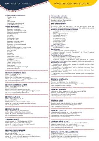 428 / JUDE%u021aUL IALOMI%u021aA WWW.GHIDULPRIMARIILOR.ROFacilit%u00e3%u0163i oferite investitorilor:P%u0103m%u00e2nt fertilGazeAp%u0103ElectricitateConexiune logistic%u0103 bun%u0103 For%u021b%u0103 ieftin%u0103 de munc%u0103Proiecte de investi%u0163ii:Extindere iluminat publicExtindere canalizareExtindere alimentare cu ap%u0103Asfaltarea par%u021bial%u0103%u00a0a comuneiParc%u0103ri -finalizatTrotuareSpa%u021bii verziModernizare parcProiecte de viitor: Extindere iluminat publicExtindere canalizareExtindere alimentare cu ap%u0103WiFi gratuitReabilitarea energetic%u0103 a institu%u021biilorAsfaltarea par%u021bial%u0103%u00a0a comuneiPist%u0103 Bicicli%u0219tiParc%u0103riTrotuareSpa%u021bii verziModernizare parcParc panouri fotovoltaice%u00cemp%u0103duririBiciclete copii/tineriC%u0103min socio-culturalCentru formare tineriAfter-schoolGr%u0103dini%u021ba cu program prelungitAtragere investitoriCOMUNA GHEORGHE DOJAAdres%u0103: Gr%u0103dini%u0163ei, nr. 15Cod po%u0219tal: 927125Telefon: 0372-783344; Fax: 0371-609873; Adresa de e-mail: primaria_gh_doja@yahoo.comURL: www.gheorghedojail.ro COMUNA GHEORGHE LAZ%u0102RAdres%u0103: Matei Basarab, nr. 46Cod po%u0219tal: 927130Telefon: 0243-206074; Fax: 0243-241510; Adresa de e-mail: primariagheorghelazar@gmail.comURL: www.primariagheorghelazar.roCOMUNA GIURGENIAdres%u0103: Mihai Viteazul, nr. 36Cod po%u0219tal: 927135Telefon: 0243-277010; Fax: 0243-277010; Adresa de e-mail: comunagiurgeni@gmail.comURL: www.giurgeni.roCOMUNA GRINDUAdres%u0103: Prim%u0103riei; Cod po%u0219tal: 927140Telefon: 0243-248001; Fax: 0243-248001; Adresa de e-mail: primgrindu@yahoo.comURL: https://www.grindu.ro/COMUNA GRIVI%u0162AAdres%u0103: Strada 6, nr. 33; Cod po%u0219tal: 927145Telefon: 0243-243001; Fax: 0243-243001; Adresa de e-mail: primariagrivita@yahoo.comURL: www.primariagrivita.roCOMUNA GURA IALOMI%u0162EIAdres%u0103: 1 Decembrie, nr. 165Cod po%u0219tal: 927166Telefon: 0243-272825; Fax: 0243-272825; Adresa de e-mail: primaria_guraialomitei@yahoo.comURL: https://www.gura-ialomitei.ro/Persoane din primarie:Primar: Alexandru FloreaViceprimar: Gheorghe ChiriacSecretar General:%u00a0%u015etefana%u00a0Iva%u015fcu%u00a0Contabil:%u00a0R%u0103di%u0163a Radu%u00a0Sate %u00een administra%u021bie:Gura Ialomi%u0163ei, LuciuSuprafa%u021ba:%u00a0 6285 ha; Intravilan:%u00a0 236 ha; Extravilan:%u00a0 6589 ha; Popula%u021bia:%u00a02890; Gospod%u0103rii:%u00a0950; Locuin%u021be:%u00a0950; Gr%u0103dini%u021be:%u00a02; %u0218coli:%u00a02; Activitati economice si specifice zonei:Activit%u0103%u0163i de mecanizare a culturilorComer%u0163Firme reprezentative:SC.GREEN HARVESTProduc%u0103tori locali:I.I. JIPA CRISTIAN,I.I.CLOSCA MIRCEAI.I.NICULAE JEANProduse locale:Legume %u0219i cerealeObiective turistice:Popasul turistic ChiranaEvenimente:Zilele comunei - %u00een luna octombrieHramul bisericii %u201cIzvorul T%u0103m%u0103duirii%u201d %u015fi %u201cSfin%u0163ii%u00a0 %u00cemp%u0103ra%u0163i Constantin %u015fi Elena%u201dFacilit%u00e3%u0163i oferite investitorilor:Drumuri jude%u0163ene %u015fi comunale reparateSistem de alimentare cu ap%u0103 performantComuna noastr%u0103 face leg%u0103tura %u00eentre Moldova %u015fi Litoralul Rom%u00e2nesc al M%u0103rii Negre, fiind situat%u0103 la 1500 m de drumul DN 2AProiecte de investi%u0163ii:Reabilitare %u0219i modernizare %u0219coala gimnazial%u0103, comuna Gura Ialomi%u021bei, jude%u021bul Ialomi%u021baReabilitare %u0219i modernizare c%u0103min cultural, comuna Gura Ialomi%u021bei, jude%u021bul Ialomi%u021baReabilitare %u0219i modernizare sediu prim%u0103rie, comuna Gura Ialomi%u021bei, jude%u021bul Ialomi%u021baConstruire teren multifunc%u021bional %u0219coala Luciu, comuna Gura Ialomi%u021beiCOMUNA ION ROAT%u0102Cod po%u0219tal: 927150Telefon: 0243-269300; Fax: 0243-269300; Adresa de e-mail: primaria_ionroata@yahoo.comURL: www.primariaionroata.roCOMUNA JILAVELEAdres%u0103: str. Calea Urziceni , nr.100; Cod po%u0219tal: 927155Telefon: 0243-288001; Fax: 0243-288001; Adresa de e-mail: jilavele@yahoo.comURL: http://comunajilavele.ro/COMUNA MAIACod po%u0219tal: 927055Telefon: 0243- 282163 , 282512; Fax: 0243-282167; Adresa de e-mail: primariamaia@yahoo.comURL: www.primariamaia.roCOMUNA MANASIAAdres%u0103: Biserica Veche, nr. 1; Cod po%u0219tal: 927160Telefon: 0243-255681; Fax: 0243-254441; Adresa de e-mail: primmanasia@gmail.comURL: http://www.manasia.ro/COMUNA M%u0102RCULE%u015eTIAdres%u0103: Dumitru N. Seceleanu, nr. 1; Cod po%u0219tal: 927092Telefon: 0243-279384; Fax: 0243-279384; Adresa de e-mail: primariamarculesti@yahoo.comURL: www.primariamarculesti.roCOMUNA MIHAIL KOG%u0102LNICEANUAdres%u0103: %u015ecolii, nr. 21Cod po%u0219tal: 927165; Telefon: 0343-801946; Adresa de e-mail: primariakogalniceanu@yahoo.comURL: www.primariamihailkogalniceanu.ro