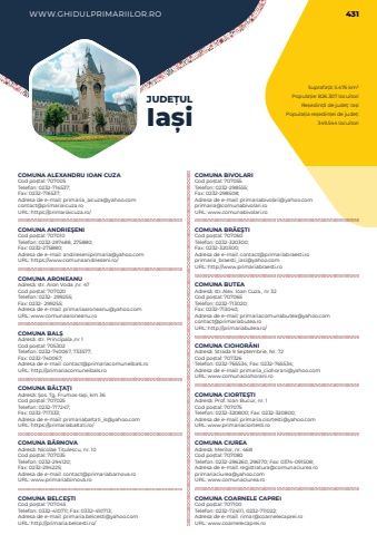 WWW.GHIDULPRIMARIILOR.RO 431Suprafa%u021b%u0103: 5.476 km%u00b2Popula%u021bie: 826.307 locuitoriRe%u0219edin%u021b%u0103 de jude%u021b: Ia%u0219iPopula%u021bia re%u0219edin%u021bei de jude%u021b: 349.544 locuitoriJUDE%u021aULIa%u0219iCOMUNA ALEXANDRU IOAN CUZACod po%u0219tal: 707005Telefon: 0232-716537; Fax: 0232-716537; Adresa de e-mail: primaria_aicuza@yahoo.comcontact@primariaicuza.roURL: https://primariaicuza.ro/COMUNA ANDRIE%u015eENICod po%u0219tal: 707010Telefon: 0232-297488, 275880; Fax: 0232-275880; Adresa de e-mail: andrieseniprimaria@yahoo.comURL: https://www.comunaandrieseni.ro/COMUNA ARONEANUAdres%u0103: str. Aron Voda ,nr. 47Cod po%u0219tal: 707020Telefon: 0232- 299255; Fax: 0232- 299255; Adresa de e-mail: primariaaroneanu@yahoo.comURL: www.comunaaroneanu.roCOMUNA BAL%u0218Adres%u0103: str. Principala ,nr 1Cod po%u0219tal: 705302Telefon: 0232-740067, 733577; Fax: 0232-740067; Adresa de e-mail: contact@primariacomuneibals.roURL: http://primariacomuneibals.roCOMUNA B%u0102L%u0162A%u0162IAdres%u0103: %u015eos. Tg. Frumos-Ia%u015fi, km 36Cod po%u0219tal: 707025Telefon: 0232-717247; Fax: 0232-717333; Adresa de e-mail: primariabaltati_is@yahoo.comURL: https://primariabaltati.ro/COMUNA B%u00c2RNOVAAdres%u0103: Nicolae Titulescu, nr. 10Cod po%u0219tal: 707035Telefon: 0232-294120; Fax: 0232-294225; Adresa de e-mail: contact@primariabarnova.roURL: www.primariabirnova.roCOMUNA BELCE%u015eTICod po%u0219tal: 707045Telefon: 0332-410711; Fax: 0332-410713; Adresa de e-mail: primaria.belcesti@yahoo.comURL: http://primaria.belcesti.ro/COMUNA BIVOLARICod po%u0219tal: 707055Telefon: 0232-298555; Fax: 0232-298508; Adresa de e-mail: primariabivolari@yahoo.comprimaria@comunabivolari.roURL: www.comunabivolari.roCOMUNA BR%u0102E%u015eTICod po%u0219tal: 707060Telefon: 0232-320300; Fax: 0232-320300; Adresa de e-mail: contact@primariabraesti.roprimaria_braesti_iasi@yahoo.comURL: http://www.primariabraesti.roCOMUNA BUTEAAdres%u0103: str.Alex. Ioan Cuza., nr 32Cod po%u0219tal: 707065Telefon: 0232-713020;Fax: 0232-713040; Adresa de e-mail: primariacomunabutea@yahoo.comcontact@primariabutea.roURL: http://primariabutea.ro/COMUNA CIOHOR%u0102NIAdres%u0103: Strada 9 Septembrie, Nr. 72Cod po%u0219tal: 707326Telefon: 0232-765534; Fax: 0232-765534; Adresa de e-mail: primaria_ciohorani@yahoo.comURL: www.comunaciohorani.roCOMUNA CIORTE%u015eTIAdres%u0103: Prof. Ioan Bucur, nr. 1Cod po%u0219tal: 707075Telefon: 0232-320800; Fax: 0232-320800; Adresa de e-mail: primaria.ciortesti@yahoo.comURL: www.primariaciortesti.roCOMUNA CIUREAAdres%u0103: Merilor, nr. 468Cod po%u0219tal: 707080Telefon: 0232-296260, 296170; Fax: 0374-091508; Adresa de e-mail: registratura@comunaciurea.roprimariaciurea@yahoo.comURL: www.comunaciurea.roCOMUNA COARNELE CAPREICod po%u0219tal: 707100Telefon: 0232-724111, 0232-711022; Adresa de e-mail: rimar@coarnelecaprei.roURL: www.coarnelecaprei.ro