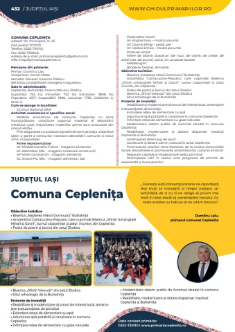 432 / JUDE%u021aUL IA%u0218I WWW.GHIDULPRIMARIILOR.ROCOMUNA CEPLENI%u0162AAdres%u0103: Str. Principala, nr. 25Cod po%u0219tal: 707070Telefon: 0232-730110; Fax: 0232-730840; Adresa de e-mail: primariaceplenita@yahoo.comURL: http://primariaceplenita.roPersoane din primarie:Primar: Dumitru LaiuViceprimar: Cornel MateiSecretar General: Geanina P%u00eeslariu%u015eef birou contabilitate: Georgeta UngureanuSate %u00een administra%u021bie:Cepleni%u0163a, Buhalni%u0163a, Poiana M%u0103rului, ZlodicaSuprafa%u021ba:%u00a0 752 ha; Intravilan:%u00a0 752 ha; Extravilan:%u00a0 3808 ha; Popula%u021bia:%u00a0 4517; Gospod%u0103rii:%u00a0 1890; Locuin%u021be:%u00a0 1736; Gr%u0103dini%u021be:%u00a0 2; %u0218coli:%u00a03; Cum se ajunge in localitate:Drumul Na%u021bional 28 BActivitati economice si specifice zonei:Rela%u021biile economice ale comunei Cepleni%u021ba cu zona %u00eenconjur%u0103toare, constituie suportul material al dezvolt%u0103rii mediului rural, majoritatea materiilor prime sunt procurate din ora%u0219ul H%u00e2rl%u0103u.Prin asigurarea cu produse agroalimentare pe pia%u021ba urban%u0103 se ob%u021bin o parte a veniturilor necesare dezvolt%u0103rii comunei %u0219i traiul zilnic al popula%u021bieiFirme reprezentative:AF Mih%u0103il%u0103 Camelia-Felicia - magazin alimentarSC Adamatec SRL %u2013 magazin materiale construc%u021biiAF Matei Constantin - magazin alimentarSC Antoni Piu SRL %u2013 magazin alimentar, barProduc%u0103tori locali:AF Anghel Ioan %u2013 moar%u0103 porumbAF Ciornei Mihai %u2013 pres%u0103 uleiAF Halibei Emilia %u2013 moar%u0103 porumbProduse locale:Miere de albine, dulce%u021buri (de nuci, de vi%u0219ine, de cire%u0219e, de ardei iute, de prune), %u021buic%u0103, vin, produse lactateMe%u0219te%u0219ugari:Broderie, fier%u0103rie, lemn%u0103rieObiective turistice:Biserica %u201eNa%u0219terea Maicii Domnului%u201d Buhalni%u021baAnsamblul Cantacuzino-Pa%u0219canu care cuprinde Biserica %u201eSfin%u021bii Arhangheli Mihail %u0219i Gavril%u201d, turnul clopotni%u021bei %u0219i zidul%u00a0 incintei, din Cepleni%u021baPodul de piatr%u0103 %u0219i beciul din satul ZlodicaBiserica %u201eSfin%u021bii Voievozi%u201d din satul ZlodicaSitul arheologic de la Buhalni%u021baProiecte de investi%u0163ii:Reabilitare %u0219i modernizare drumuri de interes local, amenajare trotuare/piste de bicicli%u0219tiExtindere re%u021bea de alimentare cu ap%u0103Aduc%u021biune ap%u0103%u00a0potabil%u0103%u00a0%u0219i canalizare %u00een comuna Cepleni%u021ba%u00cenfiin%u021bare re%u021bea de alimentare cu gaze naturaleModernizare sistem public de iluminat stradal %u00een comuna Cepleni%u021baReabilitare, modernizare %u0219i dotare dispensar medical Cepleni%u021ba %u0219i Buhalni%u021baAmenajarea terenuluji de sportConstruire %u0219i dotare c%u0103min cultural %u00een satul Cepleni%u021baPromovarea valorilor etno-folclorice de la nivelul comunit%u0103%u021bii locale, dezvoltarea %u0219i promovarea ansamblurilor cultural-artisticeRepara%u021bii capitale %u0219i modernizare sediu prim%u0103rieParticiparea UAT %u00een cadrul unor programe de schimb de experien%u021b%u0103 %u0219i bune practici