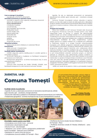 450 / JUDE%u021aUL IA%u0218I WWW.GHIDULPRIMARIILOR.ROCum se ajunge in localitate:Coordonate: 47%u00b007%u203207%u2033N 27%u00b042%u203248%u2033EActivitati economice si specifice zonei:Activit%u0103%u021bi cu specific auto: repara%u021bii, %u00eentre%u021binere, mecanic%u0103Fabrici de medicamenteFirme reprezentative:FITERMAN PHARMALIS AFFAIR SRLMULTIMARKET BUCIUM SRLProduc%u0103tori locali:DASTE MOBILI SRLDOVIS IMPEX SRLIASICARN SRLProduse locale:MobilierPanifica%u021bie Preparate din carneObiective turistice:Stejarul secular de la Vl%u0103diceni, %u00een v%u00e2rst%u0103 de 785 aniEvenimente:Zilele comunei - 8 septembrieSimpozioane(sculptur%u0103 etc)Facilit%u00e3%u0163i oferite investitorilor:Utilit%u0103%u021bi asigurate, pentru desf%u0103%u0219urarea %u00een condi%u021bii optime a activit%u0103%u021bilor acestoraDrumurile Na%u021bionale %u0219i Jude%u021bene ce faciliteaz%u0103 transportul personalului %u0219i al m%u0103rfurilorPozi%u021bionarea geografic%u0103 %u2013 la limita municipiului Ia%u0219i, %u00een zona metropolitan%u0103%u00a0a acestuiaOportunit%u0103%u021biComuna este tranzitat%u0103 de: DN28, DJ248D, DJ249E, care faciliteaz%u0103 transportul %u00een %u0219i din teritoriul comunei Tome%u0219ti.Spa%u021biile, fie ele cu destina%u021bie economic%u0103 ori domestic%u0103, beneficiaz%u0103 de utilit%u0103%u021bi: gaze naturale, ap%u0103 %u2013 canalizare, energie electric%u0103. Comuna Tome%u0219ti %u00eencurajeaz%u0103 cultura, educa%u021bia %u0219i sportul, pentru ca mai ales copiii %u0219i tinerii s%u0103%u00a0aib%u0103 parte de o dezvoltare propice. A%u0219adar, ace%u0219tia beneficiaz%u0103 de spa%u021bii destinate activit%u0103%u021bilor sportive %u00een interior %u0219i exterior ( fotbal, dans, baschet, arte mar%u021biale etc. ).Proiecte de investi%u0163ii:Planul de investi%u021bii al UAT Comuna Tome%u0219ti este structurat %u00een Programul Primarului Comunei Tome%u0219ti pentru anul 2025. Obiectivele mele, ca Primar, %u0219i, implicit, ale administra%u021biei publice locale vor urm%u0103ri acelea%u0219i direc%u021bii ca %u00een anii preceden%u021bi, %u00eenveder%u00e2nd %u00een principal: %u00eembun%u0103t%u0103%u021birea infrastructurii existente %u00een comuna Tome%u0219ti, siguran%u021ba cet%u0103%u021beanului, cur%u0103%u021benia, salubritatea, %u00eembun%u0103t%u0103%u021birea condi%u021biilor de via%u021b%u0103, %u00eenv%u0103%u021b%u0103m%u00e2ntul, cultura, religia, sportul %u0219.a. Aceste investi%u021bii vor fi realizate prin abilitatea %u0219i implicarea noastr%u0103 %u00een a atrage finan%u021b%u0103ri nerambursabile europene, prin diferite programe na%u021bionale (guvernamentale), prin Ministerul Dezvolt%u0103rii, Compania Na%u021bional%u0103 de Investi%u021bii, prin programul adresat regiunii Nord-Est, prin colaborarea dintre Comuna Tome%u0219ti %u0219i Consiliul Jude%u021bean Ia%u0219i, prin Asocia%u021bia Zona Metropolitan%u0103 Ia%u0219i si prin intermediul GAL Poiana Vl%u0103dic%u0103i, dar %u0219i prin %u00eembun%u0103t%u0103%u021birea colect%u0103rii veniturilor proprii, un element esen%u021bial %u00een realizarea unei administra%u021bii publice moderne %u0219i func%u021bionale. A%u0219 dori s%u0103 subliniez c%u0103 pe toate acestea le voi putea realiza doar cu sprijinul %u00eentregii echipe a Consiliului Local Tome%u0219ti, care, prin votul s%u0103u, aprob%u0103 aceast%u0103 list%u0103 de investi%u021bii, %u0219i printr-o alocare eficient%u0103 a resurselor bugetare, cu implicarea %u0219i sprijinul angaja%u021bilor Prim%u0103riei, astfel %u00eenc%u00e2t bugetul Comunei s%u0103 fie investit corect, prioritizat %u0219i eficientAstfel, am reu%u0219it s%u0103 v%u0103 prezint o list%u0103 cu principalele investi%u021bii