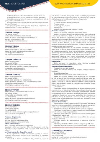 452 / JUDE%u021aUL IA%u0218I WWW.GHIDULPRIMARIILOR.ROProfilarea drumului: strada Salc%u00e2mului %u2013 strada CodruluiProfilarea drumului: strada Tineretului %u2013 strada Prim%u0103veriiAchizi%u021bionarea unui teren %u00een vederea construirii unei s%u0103li de sport pentru %u0218coala ChicereaAchizi%u021bionarea unei autospeciale de pompieri pentru SVSU al Comunei Tome%u0219tiSolu%u021bionarea problemelor privind dreptul de proprietate %u00een zonele Comtom %u2013 cartierul de blocuriCOMUNA TRIFE%u015eTICod po%u0219tal: 707520Telefon: 0232-298033; Fax: 0232-298033; Adresa de e-mail: contact@primariatrifestiiasi.roprimaria_trifesti@yahoo.comURL: https://primariatrifestiiasi.ro/COMUNA %u0162IBANACod po%u0219tal: 707530Telefon: 0232-325900, ; Fax: 0232-325900; Adresa de e-mail: primar@primariatibana.rosecretar@primariatibana.roURL: www.primariatibana.roCOMUNA %u0162IB%u0102NE%u015eTIAdres%u0103: str. PrincipalaCod po%u0219tal: 707545Telefon: 0232-326400; Fax: 0232-326269; Adresa de e-mail: primaria_tibanesti@yahoo.comcontact@primariatibanesti.roURL: www.primariatibanesti.roCOMUNA %u0162IG%u0102NA%u015eIAdres%u0103: Principal%u0103, nr. 162Cod po%u0219tal: 707555Telefon: 0232- 299072; Fax: 0232-299072; Adresa de e-mail: primaria_com_tiganasi@yahoo.comcontact@primariatiganasi.roURL: http://www.primariatiganasi.ro/COMUNA %u0162U%u0162ORAAdres%u0103: str. Inv. Dumitru Sima Setraru, nr. 45Cod po%u0219tal: 707560Telefon: 0332-428.173,0232-298777; Fax: 0232-298811; Adresa de e-mail: primariatutora@yahoo.comURL: http://www.primariatutora.roCOMUNA UNGHENICod po%u0219tal: 707566Telefon: 0232-295333; Fax: 0232-295333; Adresa de e-mail: primariaungheniiasi@yahoo.comURL: www.comunaungheni.roPersoane din primarie:Primar: Iulian MarcuSecretar General: Juverdeanu GeluContabil: R%u0103duianu Cristina MihaelaSate %u00een administra%u021bie:Bosia, Ungheni, M%u00e2nz%u0103te%u015fti, Coada St%u00e2nciiSuprafa%u021ba:%u00a0 4614 ha; Intravilan:%u00a0 3744 ha; Extravilan:%u00a0 4416 ha; Popula%u021bia:%u00a0 4451; Gospod%u0103rii:%u00a0 1253; Locuin%u021be:%u00a0 1410; Gr%u0103dini%u021be:%u00a0 3; %u0218coli:%u00a04; Activitati economice si specifice zonei:Av%u00e2nd o pondere de 81,8% a terenurilor agricole, %u00een comuna Ungheni principalele activit%u0103%u021bi sunt agricultura %u0219i cre%u0219terea animalelorDac%u0103 ar fi s%u0103 facem o clasificare din punctul de vedere al activit%u0103%u021bilor cu cel mai mare profit, pentru anul 2021, pe primul loc se afl%u0103 lucr%u0103rile de construc%u021bii, urmate de transporturi rutiere de m%u0103rfuri, comer%u021bul cu ridicata a fructelor %u0219i legumelor. Produc%u0103tori locali:I.I. Galb%u0103u Bogdan (ferm%u0103 zootehnic%u0103)Produse locale:Fructe, legume, cerealeMe%u0219te%u0219ugari:Andrie%u0219 Cristian %u0219i Andrie%u0219 Valentin - fierariObiective turistice:Biserica %u201cSf Nicolae%u201d, sat Bosia, monument istoricBiserica parohial%u0103 din satul Bosia cu hramul Sf%u00e2ntul Nicolae a fost construit%u0103 %u00een anul 1858, cu cheltuiala arenda%u015fului grec al mo%u015fiei, Ilie Paminian. Legendele povestesc c%u0103 acest arenda%u015f, nepl%u0103tind c%u00e2%u0163iva ani arenda mo%u015fiei, a fost obligat de administra%u0163ia m%u0103n%u0103stirii Sf. Sava s%u0103 fac%u0103 o biseric%u0103 pe mo%u015fie, %u00een schimbul sumelor de bani datorate, - %u015fi a%u015fa arenda%u015ful ar fi zidit aceast%u0103 biseric%u0103. Deasupra u%u015fii de intrare se afl%u0103 pisania, %u00een grece%u015fte, care atest%u0103 ctitorul %u015fi anul construirii. Podul Eiffel, pod metalic de cale ferat%u0103 %u00een localitatea Ungheni, peste Prut, se afl%u0103 %u015fi ast%u0103zi %u00een exploatare, fiind traversat zilnic de trenurile de pasageri %u015fi de m%u0103rfuri ce asigur%u0103 leg%u0103tura %u00eentre Rom%u00e2nia %u015fi Republica Moldova. A fost construit dup%u0103 proiectul arhitectului francez Gustave Eiffel. Podul este cunoscut %u0219i sub denumirea Podul de flori , nume %u00eemprumutat de la ac%u021biunile intreprinse %u00eencep%u00e2nd cu anii 90, pe ambele maluri ale Prutului, c%u00e2nd fontiera a putut fi traversat%u0103 f%u0103r%u0103 acteEvenimente:Zilele comunei: 8 Noiembrie, c%u00e2nd Biserica ortodox%u0103 pr%u0103znuie%u0219te Sfin%u021bii Arhangheli Mihail %u0219i GavrilFacilit%u00e3%u0163i oferite investitorilor:Re%u0163ea alimentare ap%u0103 potabil%u0103Re%u0163ea de energie electric%u0103 ce acoper%u0103 integral teritoriul comuneiServicii de salubritateRe%u021bea de telecomunica%u021bii %u00een toate satele comuneiRe%u021bea de iluminat stradal bine dezvoltat%u0103 UAT Ungheni se afl%u0103 la doar 21 de kilometri de ora%u0219ul Ia%u0219i, f%u0103c%u00e2nd parte din zona metropolitan%u0103, comuna ofer%u0103 condi%u021bii foarte bune pentru investi%u021bii, posibilit%u0103%u021bi de concesionare terenuri, oportunit%u0103%u021bi de afaceri asem%u0103n%u0103toare Ia%u0219ului %u0219i avantajul unor impozite %u0219i taxe reduse fa%u021b%u0103 de ora%u0219.Oportunit%u0103%u021biPoten%u021bialul agricol ofer%u0103 posibili%u021b%u0103%u021bi de dezvoltare a sistemului microfermelor %u00een domeniul cre%u0219terii animalelor, viticulturii sau pomiculturii. Dezvoltarea apiculturii, este, de asemenea, posibil%u0103, %u00een zon%u0103 exist%u00e2nd, deja apicultori, amplasa%u021bi pe l%u00e2ng%u0103 suprafe%u021bele %u00eemp%u0103durite. Exist%u0103, de asemenea, posibilit%u0103%u021bi de dezvoltare a industriei mici %u0219i de artizanat %u2013 prelucrarea l%u00e2nii, ol%u0103rit, mor%u0103rit %u0219i panifica%u021bie, prelucrarea pieilor, conserve din legume %u0219i fructe dup%u0103 re%u021bete tradi%u021bionaleProiecte de investi%u0163ii:Reabilitarea %u0219i modernizarea infrastructurii rutiere afectate de fenomene hidrometeorologice periculoase din comuna Ungheni, jude%u021bul Ia%u0219i%u2013 satele M%u00e2nz%u0103te%u0219ti %u0219i Coada St%u00e2ncii (finalizat)Modernizare drumuri de interes local %u00een comuna UngheniReabilitare,