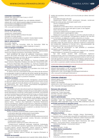 WWW.GHIDULPRIMARIILOR.RO JUDE%u021aUL ILFOV / 459COMUNA DOMNE%u015eTIAdres%u0103: %u0218os. Alexandru Ioan Cuza, nr. 25-27Cod po%u0219tal: 077090Telefon: 021-3515256, 3515257; Fax: 021-3515256, 3515257; Adresa de e-mail: relatiicupublicul@primariadomnesti.ro,primariadomnestiif@primariadomnesti.roprimariadomnestiif@yahoo.comURL: www.primariadomnesti.roPersoane din primarie:Primar: Ioan Adrian Ghi%u021b%u0103Viceprimar: Costel %u0218tefanSecretar General: Ramona Maria NiculaeContabil: Cornelia %u0218erban%u0218ef serviciu achizi%u021bii publice investi%u021bii: Violeta Bab%u0103 VioletaCoordonator Proiecte %u0219i Pres%u0103: Doina Maria ScripaSate %u00een administra%u021bie:Domne%u0219ti, %u021aeghe%u0219Suprafa%u021ba:%u00a0 3742 ha; Intravilan:%u00a0 2434 ha; Extravilan:%u00a0 1308 ha; Popula%u021bia:%u00a012861; Gospod%u0103rii:%u00a06396; Gr%u0103dini%u021be:%u00a02; %u0218coli:%u00a01; Cum se ajunge in localitate:Comuna are acces direct la c%u0103i de comunica%u0163ie foarte importante: A1/ E81, %u015fi inelul de centur%u0103 al Municipiului Bucure%u015fti. Toate accesate recent prin Pasajul suprateran ultramodern Domnesti. Este str%u0103b%u0103tut%u0103 de dou%u0103 c%u0103i jude%u021bene importante DJ602 Centura Bucure%u015fti Domne%u015fti aflat %u00een continuarea Bulevardului Prelungirea Ghencea, la 15 km de centrul capitalei %u015fi DJ401A ce leaga localitatea Vidra de Ciorog%u0103rla).Comuna Domne%u0219ti este %u00eenfr%u0103%u021bit%u0103%u00a0 cu: Comuna Ruse%u0219tii Noi. Raion Ialoveni, Republica Moldova, din data de 1 Decembrie 2017.Comuna Domne%u0219ti este %u00eenfr%u0103%u021bit%u0103%u00a0 cu: Comuna Rusestii Noi, Raion Ialoveni, Republica Moldova, din data de 1 Decembrie 2017Activitati economice si specifice zonei:Specifice zonei, dar %u00een prezent cu o pondere mai mic%u0103, sunt agricultura, zootehnia %u015fi micile servicii %u00cen ultimii cinci ani, autorita%u021bile locale, prin eforturile de aliniere la standardele moderne %u015fi g%u0103sirea de solu%u021bii rapide de dezvoltare, au reu%u015fit s%u0103 acopere cea mai mare parte din cerin%u021bele sutelor de cet%u0103%u021beni care au investit %u00een proiecte imobiliare.Obiective turistice:Sunt consolidate infrastructurile, transportul, comunica%u021biile, se dezvolt%u0103 re%u021bele comerciale, se promoveaz%u0103 micul turism ce are ca obiectiv p%u0103durile limitrofe, Biserica Sf. Parascheva - monument de patrimoniu sau situl Curtea Domneasc%u0103-Ciorog%u00e2rleanuIpsilanti care este %u00een curs de restaurareEvenimente:Identitatea comunei, dezvoltarea spiritual-religioas%u0103 a locuitorilor, formarea unui viitor cet%u0103%u021bean complex din punct de vedere cultural %u015fi social-educa%u0163ional, constituie o preocupare constant%u0103, concretizat%u0103 anual prin proiecte punctuale sau pe termen lung, cu caracter anual, din care amintim: Obiceiuri vechi din Vatra Satului, Lumea artelor la sat (%u015fcoli de coregrafie si art%u0103 teatral%u0103 si de papusi), cursuri de Robotica, Genera%u021bia de Aur - 50 de ani de casatorie, Bisericile satelor noastre, Tineretul domnestean descoper%u0103%u00a0 Rom%u00e2nia, Bisericile satului nostru - hramuri, Ziua Na%u021bionala a Rom%u00e2niei, Parteneriat cultural, etnofolcloric, religios %u0219i educa%u021bional cu Republica Moldova/ Comuna Ruse%u015ftii Noi, Raionul Ialoveni %u00een cadrul Tratatului de infr%u0103%u021bire semnat %u00een 2017, localitate pe care o sus%u021binem cu dona%u021bii, financiar la extinderea %u0219colilor %u015fi gr%u0103dini%u021belor.Facilit%u00e3%u0163i oferite investitorilor:Pentru investitori exist%u0103 facilit%u0103%u021bi si oportunit%u0103%u021bi finalizate:-%u00a0o atitudine deschis%u0103, prietenoas%u0103 a autorita%u021bilor-%u00a0nivel sc%u0103zut al taxelor %u0219i impozitelor locale-%u00a0cre%u015fterea interesului pentru programe de dezvoltare economic%u0103-%u00a0 acces la c%u0103i de comunica%u0163ii: rutiere, feroviare, extindere iluminat public pe 13 str%u0103zi-%u00a0modernizare sistem rutier- semnalizare rutier%u0103%u00a0pe 6 artere, STB, maxi-taxi-%u00a0 infrastructur%u0103%u00a0 medical%u0103%u00a0 (cabinete medicale individuale, farmacii), educa%u0163ionala (%u015fcoala %u015fi gradini%u021be ultramoderne, ), baza %u015fi clubul sportiv %u201eVointa Domnesti%u201d, C%u0103min cultural %u00een Teghes, Cl%u0103dire dispensar modern, Po%u0219ta modern%u0103%u00a0%u00een cl%u0103dire nou%u0103- parc de recreere %u00een sat Teghe%u0219-%u00a0 Centru Operativ pentru situa%u021bii de Urgen%u021ba (Pompieri %u0219i SMURD)Proiecte de investi%u0163ii:Principalele obiective/proiecte de investi%u021bii 2024 2028, aflate la stadiul de aprobare, derulare, sunt structurate pe c%u0103teva domenii prioritare:Extindere de gaze naturaleModernizare sistem rutier, amenajare trotuare, construire imobil locuin%u021be sociale, amenajare spa%u021bii verziCentru multifunc%u021bionalCasa de c%u0103s%u0103toriiReabilitare %u0219i extindere C%u0103min cultural din sat Domne%u0219tiConstruire %u015fcoala, cre%u0219%u0103, sal%u0103%u00a0sport %u0219i parc %u00een sat TeghesSta%u021bii re%u00eenc%u0103rcare autoConstruire cl%u0103dire birouri %u0219i spa%u021bii comercialeExtindere sistem supreveghere videoRestaurare %u0219i punere %u00een valoare %u00een circuitul cultural-turistic al Ansamblului cur%u021bii boiere%u0219ti Ciorogarleanu Ipsilanti din sec.XVII ce, la finalizare, va ad%u0103posti un sediu cultural %u0219i un muzeuCentru de asisten%u021b%u0103%u00a0medical%u0103%u00a0comunitara %u00een regim permanent, reabilitare %u015fi extindere poduri, sta%u021bii de re%u00eenc%u0103rcare electric%u0103, extindere re%u021bea de joas%u0103%u00a0tensiune, dotarea modern%u0103%u00a0a institu%u021biilor de %u00eenv%u0103%u021b%u0103m%u00e2nt, elaborare %u00een format GIS a documentat%u021bilor de Amenajare a teritoriului %u0219i de planificare urban%u0103Noi re%u021bele de alimentare cu ap%u0103%u00a0 potabil%u0103%u00a0 %u015fi canaliza