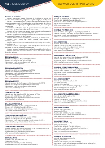 460 / JUDE%u021aUL ILFOV WWW.GHIDULPRIMARIILOR.ROProiecte de investi%u0163ii:Proiect canalizare satele Piteasca %u0219i %u0218indrili%u021ba cu sta%u021bie de epurare %u00een satul Piteasca%u00a0 ,programul Anghel Saligny %u00een desf%u0103%u0219urareProiect canalizare satele Cozieni-G%u0103neasa-Moara Domneasc%u0103 cu sta%u021bie de epurare la%u00a0 Afuma%u021bi, ap%u0103%u00a0%u0219i canal Ilfov stadiu de avizareGr%u0103dini%u021ba cu program prelungit satul G%u0103neasa, asociere cj, %u00een desf%u0103%u0219urareExtindere %u0219i %u00eenfiin%u021bare re%u021bea de gaze %u00een satele G%u0103neasa %u0219i Moara Domneasc%u0103%u00a0cu%u00a0 bran%u0219amente, stadiu de avizareProiect eficientizare energetic%u0103%u00a0 pentru dou%u0103%u00a0 %u0219coli respectiv %u0219coala Piteasca %u0219i%u00a0 G%u0103neasa, %u00een desf%u0103%u0219urare AFMProiect sistematic %u00eempreun%u0103%u00a0cu oficiu de cadastru %u0219i %u00eent%u0103bulare pentru satul%u00a0 Piteasca, %u00een desf%u0103%u0219urareProiect dispensar satul %u0218indrili%u021ba, asociere cj, %u00een desf%u0103%u0219urareProiect mini teren de sport, Moara Domneasc%u0103 %u0219i Cozieni,avizareProiect dispensar medic de familie satul %u0218indrili%u021ba asociere cj, %u00een desf%u0103%u0219urareProiect camere supravegere %u0219i dou%u0103 sta%u021bii de %u00eenc%u0103rcare ma%u0219ini electrice, fondul de%u00a0 Mediu, %u00een desf%u0103%u0219urareProiect panouri fotovoltaic pentru iluminat public, AFM avizareProiect elaborare puz loturi de cas%u0103 %u0219i zona industriala %u00een satul %u0218indrili%u021ba, avizare%u00a0COMUNA GLINAAdres%u0103: Libert%u0103%u0163ii, nr. 292; Cod po%u0219tal: 077105Telefon: 021-4671214; Fax: 021-4671198; Adresa de e-mail: contact@primaria-glina.roURL: www.primaria-glina.roCOMUNA GR%u0102DI%u015eTEAAdres%u0103: Prim%u0103riei, nr. 29; Cod po%u0219tal: 077110Telefon: 021-2662760; Fax: 021-2662009; Adresa de e-mail: primariagradisteaif@yahoo.com gradistea2007@yahoo.comURL: https://comunagradisteaif.ro/COMUNA GRUIUAdres%u0103: %u015eoseaua Gruiu-Snagov, nr. 152; Cod po%u0219tal: 077115Telefon: 021-3508008, 3508009; Fax: 021-3671729; Adresa de e-mail: contact@primariagruiu.roURL: www.primariagruiu.roCOMUNA JILAVAAdres%u0103: %u015eos. Giurgiului, nr. 279; Cod po%u0219tal: 077120Telefon: 021-4570115; Fax: 021-4571171; Adresa de e-mail: primariajilava@primariajilava.roURL: http://primariajilava.roORA%u0218UL M%u0102GURELEAdres%u0103: C%u0103lug%u0103reni, nr. 2-4; Cod po%u0219tal: 077125Telefon: 021-4574098; Fax: 021-4574504; Adresa de e-mail: office@primariamagurele.roURL: www.primariamagurele.roCOMUNA MOARA VL%u0102SIEIAdres%u0103: str. Eroilor, nr. 199; Cod po%u0219tal: 077130Telefon: 021-2672135; Fax: 021-2672056; Adresa de e-mail: registratura@primariamoara-vlasiei.roURL: https://www.primariamoara-vlasiei.ro/COMUNA MOGO%u015eOAIAAdres%u0103: %u015eoseaua Bucure%u015fti-T%u00e2rgovi%u015fte, nr. 51; Cod po%u0219tal: 077135Telefon: 021-3516692; Fax: 021-3516695; Adresa de e-mail: primaria@mogosoaia.roURL: www.primaria.mogosoaia.roCOMUNA NUCIAdres%u0103: Calea Bucure%u015fti, nr. 201; Cod po%u0219tal: 077140Telefon: 021-2696010; Fax: 021-2696010; Adresa de e-mail: contact@primarianuciilfov.roORA%u0218UL OTOPENIAdres%u0103: 23 August, nr. 10; Cod po%u0219tal: 075100Telefon: 021-3520033; Fax: 021-3520034; Adresa de e-mail: vladconstantin@otopeniro.ro secretariat@otopeniro.roURL: www.otopeniro.roORA%u0218UL PANTELIMONAdres%u0103: Sf%u00e2ntu Gheorghe, nr. 32; Cod po%u0219tal: 077145Telefon: 021-9202, 3502442, 3502444; Fax: 021-3502442, 3017075; Adresa de e-mail: secretariat@primariapantelimon.roURL: www.primariapantelimon.roCOMUNA PERI%u015eAdres%u0103: Principal%u0103, nr. 211; Cod po%u0219tal: 077150Telefon: 021-2670210; Fax: 021-2670245; Adresa de e-mail: rimar@primaria-peris.rosecretariat-peris@primaria-peris.roURL: www.primaria-peris.roCOMUNA PETR%u0102CHIOAIAAdres%u0103: %u015eos. V%u00e2n%u0103tori, nr. 300; Cod po%u0219tal: 077155Telefon: 021-3617444; Fax: 021-3617443; Adresa de e-mail: primaria_petrachioaia@yahoo.comURL: http://primaria-petrachioaia.roORA%u0218UL POPE%u015eTI LEORDENIAdres%u0103: P-%u0163a Sf%u00e2nta Maria, nr. 1; Cod po%u0219tal: 077160Telefon: 0374-408818; Fax: 0374-408822;; Adresa de e-mail: relatiipublice@ppl.roURL: www.ppl.roCOMUNA SNAGOVAdres%u0103: %u015eos. Gherm%u0103ne%u015fti, nr. 49Cod po%u0219tal: 077165Telefon: 0729-916746; Adresa de e-mail: primaria_snagov@yahoo.comsecretariat@primaria-snagov.roURL: www.primaria-snagov.roCOMUNA %u015eTEF%u0102NE%u015eTII DE JOSAdres%u0103: %u015eos. %u015etef%u0103ne%u015fti, nr. 116Cod po%u0219tal: 077175Telefon: 021-3613529; Fax: 021-3613529; Adresa de e-mail: office@primariastefanesti.roURL: www.primariastefanesti.roCOMUNA TUNARIAdres%u0103: Mihai Eminescu, nr. 1Cod po%u0219tal: 077180Telefon: 021-2675310; Fax: 021-2675300; Adresa de e-mail: contact@primaria-tunari.roURL: www.primaria-tunari.roCOMUNA VIDRAAdres%u0103: Principal%u0103, nr. 80; Cod po%u0219tal: 077185Telefon: 021-3612265; Fax: 021-3612264; Adresa de e-mail: secretariat@primaria-vidra.roprimariavidra@yahoo.comURL: http://www.primaria-vidra.ro/ORA%u0218UL VOLUNTARIAdres%u0103: B-dul Voluntari, nr. 74Cod po%u0219tal: 077190Telefon: 031-4036110; Fax: 031-4036179; Adresa de e-mail: primaria-voluntari@primaria-voluntari.roURL: www.primaria-voluntari.ro