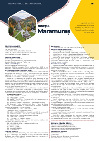 WWW.GHIDULPRIMARIILOR.RO 461Suprafa%u021b%u0103: 6.304 km%u00b2Popula%u021bie: 533.162 locuitoriRe%u0219edin%u021b%u0103 de jude%u021b: Baia MarePopula%u021bia re%u0219edin%u021bei de jude%u021b: 149.735 locuitoriJUDE%u021aULMaramure%u0219COMUNA ARDUSATAdres%u0103: Principal%u0103, nr. 30Cod po%u0219tal: 437005Telefon: 0262- 265241; Fax: 0262- 265242; Adresa de e-mail: primaria@comuna-ardusat.roURL: http://www.comuna-ardusat.ro/Persoane din primarie:Primar: Ciprian Vasile Rus:Secretar General: Oana Augusta Teodora M%u0103rie%u0219Contabil: Consilier superior Florica MicSate %u00een administra%u021bie:Ardusat, Arie%u015ful de C%u00e2mp, Col%u0163ireaSuprafa%u021ba:%u00a0 3109 ha; Intravilan:%u00a0 723,02 ha; Extravilan:%u00a0 2385, 98 ha; Popula%u021bia:%u00a02738; Gospod%u0103rii:%u00a01818; Locuin%u021be:%u00a0902; Gr%u0103dini%u021be:%u00a01; %u0218coli:%u00a01; Activitati economice si specifice zonei:Comuna Ardusat beneficiaz%u0103 de zone cu teren arabil fiind una dintre cele mai fertile din cadrul jude%u021bului Maramure%u0219, acestea reg%u0103sindu-se mai mult %u00een solurile formate din cernoziomuri care fac obiectul unor intense exploat%u0103ri agricoleComuna s-a dezvoltat de-a lungul anilor baz%u00e2ndu-se pe resursele proprii %u2013 terenurile agricole, zonele de prund ale r%u00e2ului Some%u0219ului din care s-au extras nisip, pietri%u0219 %u0219i alte agregate pentru betoane care ulterior au fost folosite ca materiale de construc%u021bii, precum %u0219i for%u021ba de munc%u0103 %u0219i produc%u021bia ob%u021binut%u0103 din diversele activit%u0103%u021bi agricole sau economiceActivit%u0103%u021bile economice ale comunei Ardusat s-au dezvoltat %u00een concordan%u021b%u0103 cu poten%u021bialul %u0219i resursele locale, economia av%u00e2nd un caracter preponderent agricol. Specificul activit%u0103%u021bilor zonei sunt cultivarea cerealelor, legumicultura %u0219i cre%u0219terea animalelorFirme reprezentative:S.C. MEZEL CO S.R.L. - AbatorS.C. GHITTA S.R.L. - AbatorS.C. SELECT FERM S.R.L. - Ferma suine, ferma ingrasare taurineS.C. AVELANA S.R.L. - FarmacieS.C. AGROGEX GS SRL - Agricultur%u0103 + cre%u0219terea animalelorS.C. Drumuri Poduri MARAMURES S.A. %u2013 Punct de lucru Ardusat - Administrarea %u0219i intretinerea drumurilor jude%u021bene ,produse de balastiera,mixturi asfalticePOPAS COMOARA S.R.L. - Alimentatie poblicaCABANA SOME%u0218 - Alimentatie poblicaS.C. ALEN CONSTRUCT S.R.L. - Depozit materiale de construc%u021biiS.C. SCHINDLER S.R.L. - Construc%u021bii civile %u0219i industrialeS.C. VARGA S.R.L. - Comer%u021b,alimentatie publicaS.C. LEON S.R.L. - ComertS.C. CANSTAR S.R.L. - Ferma BovineS.C. BEGU TRANS S.R.L. - Sta%u021bie de sortare, produse de balastiera-Punct de lucru ArdusatS.C. MDI-RODNEI S.R.L. - Produse de balastieraProduc%u0103tori locali:S.C. MEZEL CO S.R.LS.C. AGROGEX GS SRLS.C. CANSTAR S.R.LObiective turistice:Atrac%u021biile turistice definitorii pentru comun%u0103 sunt reprezentate de sit-ul arheologic %u201eSub P%u0103dure%u201d cu dou%u0103 a%u0219ez%u0103ri care dateaz%u0103 din Epoca bronzului %u0219i Arborele Sequoia Giganteea monument al naturii, vechi de peste 200 aniEvenimente:Zilele comunei Ardusat %u2013 Sf%u0103r%u0219itul lunii AugustFacilit%u00e3%u0163i oferite investitorilor:Terenuri agricole %u015fi neagricoleFor%u0163a de munc%u0103 existent%u0103 calificat%u0103 %u015fi necalificat%u0103Materii prime pentru industrializarea laptelui %u015fi a c%u0103rniiMaterii prime pentru industrializarea lemnuluiRe%u0163ele de ap%u0103 curent%u0103, de drumuri comunale, jude%u0163ene, na%u0163ionale (%u00een stare bun%u0103) - sprijin %u0219i colaborare din partea conducerii Administra%u021biei Publice Locale %u0219i a Consiliului Local Ardusat pentru investitoriProiecte de investi%u0163ii:Grupuri sanitare interioare noi la %u0219coala gimnazial%u0103 Ardusat, %u00een localitatea Ardusat, comuna Ardusat jude%u021bul Maramure%u0219-execu%u021bie lucr%u0103ri construc%u021bie grupuri sanitare noi buget local, ministerul educa%u021biei %u0219i cercet%u0103riiModernizare infrastructur%u0103%u00a0rutier%u0103 %u00een comuna Ardusat, jude%u021bul Maramure%u0219- modernizare infrastuctura rutier%u0103%u00a0 %u00een comun%u0103%u00a0 6433 m-PNI Anghel SalignyDotarea cu mobilier materiale didactice %u0219i echipamente digitale a unit%u0103%u021bilor de %u00eenv%u0103%u021b%u0103m%u00e2nt din comuna Ardusat jude%u021bul Maramure%u0219%u00a0dotare unit%u0103%u021bi %u00eenv%u0103%u021b%u0103m%u00e2nt - PNRR microbuze electrice pentru elevi microbuz electric 16+1 locuri-PNRR C15 educa%u021bie%u00cenfiin%u021bare re%u021bea de distrubu%u021bie gaze naturale %u00een comuna Ardusat-30 km re%u021bea de distribu%u021bie %u0219i sta%u021bie de presurizare-PNI Anghel SalignySal%u0103%u00a0 de sport %u0219colar%u0103 cu tribun%u0103 de 102 locuri %u00een localitatea Ardusat-sal%u0103 de sport scolar%u0103 dup%u0103 un proiect tip,%u00een cadrul subprogramului s%u0103li de sport-program na%u021bional de interes public sau social subprogramul s%u0103li de sportExtindere re%u021bele de ap%u0103 %u0219i canalizare %u00een localitatea Ardusatextindere re%u021bea de ap%u0103%u00a0%u0219i canal existent%u0103 cu aprox. 3 km-POM %u0219i buget localSta%u021bii re%u00eenc%u0103rcare pentru vehiculele electrice %u00een comuna Ardusat, jude%u021bul Maramure%u0219-4 amplasamente de re%u00eenc%u0103rcare prin montarea a 4 sta%u021bi de re%u00eenc%u0103rcare pentru vehicule electriceadministra%u021bia fondului de mediuCre%u0219terea eficien%u021bei energetice la c%u0103min cultural localitatea Ardusat, jude%u021bul Maramure%u0219Cre%u0219terea eficien%u021bei energetice la c%u0103min cultural localitatea Coltirea, jude%u021bul Maramure%u0219Cre%u0219terea eficien%u021bei energetice la %u0219coala din localitatea Arie%u0219u de c%u00e2mp, judetul Maramure%u0219%u00cenfiin%u021bare parc fotovoltaic %u00een comuna Ardusat, jude%u021bul Maramure%u0219- programul-cheie 1: surse regenerabile