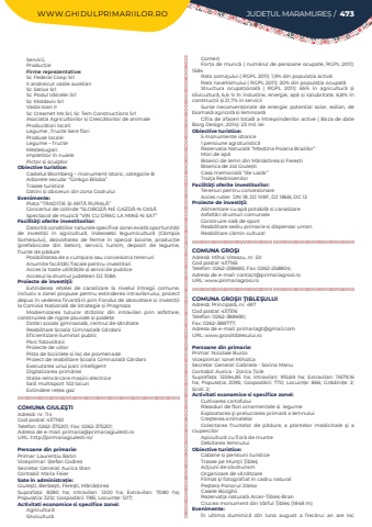 WWW.GHIDULPRIMARIILOR.RO JUDE%u021aUL MARAMURE%u0218 / 473Servicii,Produc%u021bieFirme reprezentative:Sc Federal Coop SrlII andreicut vasile aurelianSc Sativa SrlSc Podul V%u00e2lcelei SrlSc Moldaviv SrlVaida Ioan IISc Creamet Ms Srl, Sc Tem Constructions SrlAsocia%u021bia Agricultorilor %u0219i Cresc%u0103torilor de animaleProduc%u0103tori locali:Legume , fructe Sere floriProduse locale:Legume %u2013 fructeMe%u0219te%u0219ugari:Impletitor %u00een nuielePictor %u0219i sculptorObiective turistice:Castelul Blomberg %u2013 monument istoric, categorie BArborele secular %u201cGinkgo Biloba%u201dTrasee turisticeDatini %u0219i obiceiuri din zona CodruluiEvenimente:Pia%u021ba %u201cTRADI%u021aIE %u0218I ART%u0102%u00a0RURAL%u0102%u201dConcertul de colinde %u201cSLOBOZ%u00c2-NE GAZD%u0102-N CAS%u0102 Spectacol de muzic%u0103 %u201cVIN CU DRAG LA MINE-N SAT%u201dFacilit%u00e3%u0163i oferite investitorilor:Datorit%u0103 condi%u021biilor naturale specifice zonei exist%u0103%u00a0oportunit%u0103%u021bi de investi%u021bii %u00een agricultur%u0103, %u00eendeosebi legumicultur%u0103 (C%u00e2mpia Some%u0219ului), dezvoltarea de ferme %u00een special bovine, produc%u021bie (prefabricate din beton), servicii, turism, depozit de legume, fructe de p%u0103durePosibilitatea de a cumpara sau concesiona terenuriAnumite facilit%u0103%u021bi fiscale pentru investitoriAcces la toate utilit%u0103%u021bile %u0219i serviciile publice Accesul la drumul jude%u021bean DJ 108AProiecte de investi%u0163ii:Extinderea re%u021belei de canalizare la nivelul %u00eentregii comune, inclusiv a zonei propuse pentru extinderea intravilanului, proiect depus %u00een vederea finan%u021b%u0103rii prin Fondul de dezvoltare %u0219i investi%u021bii la Comisia Na%u021bional%u0103%u00a0de Strategie %u0219i PrognozaModernizarea tuturor str%u0103zilor din intravilan prin asfaltare, construirea de rigole pluviale %u0219i pode%u021beDot%u0103ri %u0219coala gimnazial%u0103, centrul de s%u0103n%u0103tateReabilitare %u0218coala Gimnazial%u0103%u00a0G%u00e2rdaniEficientizare iluminat publicParc fotovoltaicProiecte de viitorPista de biciclete %u0219i loc de promenadeProiect de reabilitare %u0218coala Gimnazial%u0103%u00a0G%u00e2rdani Executarea unui parc intelligentDigitalizarea prim%u0103rieiSta%u021bie re%u00eenc%u0103rcare ma%u0219ini electriceSal%u0103 multisport 102 locuriExtindere re%u021bea gazCOMUNA GIULE%u015eTIAdres%u0103: nr. 114Cod po%u0219tal: 437160Telefon: 0262-375201; Fax: 0262-375201; Adresa de e-mail: primaria@primariagiulesti.roURL: http://primariagiulesti.ro/Persoane din primarie:Primar: Lauren%u021biu BatinViceprimar:%u00a0%u0218tefan%u00a0CodreaSecretar General: Aurica StanContabil: Maria FeierSate %u00een administra%u021bie:Giule%u015fti, Berbe%u015fti, Fere%u015fti, M%u0103n%u0103stireaSuprafa%u021ba:%u00a0 8280 ha; Intravilan:%u00a0 1200 ha; Extravilan:%u00a0 7080 ha; Popula%u021bia:%u00a03212; Gospod%u0103rii:%u00a01185; Locuin%u021be:%u00a01217; Activitati economice si specifice zonei:Agricultur%u0103Silvicultur%u0103Comer%u021bFor%u021ba de munc%u0103 ( num%u0103rul de persoane ocupate, RGPL 2011): 1584Rata %u0219omajului ( RGPL 2011): 1,9% din popula%u021bia activ%u0103Rata navetismului ( RGPL 2011): 20% din popula%u021bia ocupat%u0103Structura ocupa%u021bional%u0103 ( RGPL 2011): 65% %u00een agricultur%u0103 %u0219i silvicultur%u0103, 6,6 % %u00een industrie, energie, ap%u0103 %u0219i salubritate, 6,8% %u00een construc%u021bii %u0219i 21,7% %u00een serviciiSurse neconven%u021bonale de energie: poten%u021bial solar, eolian, de biomas%u0103 agricol%u0103 %u0219i lemnoas%u0103Cifra de afaceri total%u0103 a %u00eentreprinderilor active ( Baza de date Borg Design, 2014): 23 mil. leiObiective turistice:5 monumente istorice1 pensiune agroturistic%u0103Rezerva%u021bia Natural%u0103 %u201cMla%u0219tina Poiana Brazilor%u201dMori de ap%u0103Biserici de lemn din M%u0103n%u0103stirea %u0219i Fere%u0219tiBiserica de zid Giule%u0219tiCasa memorial%u0103 %u201cIlie Laz%u0103r%u201dTroi%u0163a RednicenilorFacilit%u00e3%u0163i oferite investitorilor:Terenuri pentru concesionareAcces rutier %u00a0DN 18, DJ 109F, DJ 186B, DC 12Proiecte de investi%u0163ii:Alimentare cu ap%u0103 potabil%u0103 si canalizareAsfalt%u0103ri drumuri comunaleConstruire sal%u0103 de sportReabilitare sediu primarie si%u00a0dispensar umanReabilitare c%u0103min culturalCOMUNA GRO%u015eIAdres%u0103: Mihai Viteazu, nr. 50Cod po%u0219tal: 437165Telefon: 0262-258685; Fax: 0262-258804; Adresa de e-mail: contact@primariagrosi.roURL: www.primariagrosi.roCOMUNA GRO%u015eII %u0162IBLE%u015eULUIAdres%u0103: Principal%u0103, nr. 497Cod po%u0219tal: 437316Telefon: 0262-388690; Fax: 0262-388777; Adresa de e-mail: primariagt@gmail.comURL: www.grosiitiblesului.roPersoane din primarie:Primar: Nicolaie BurzoViceprimar: Ionel MiholcaSecretar General: Gabriela - Sorina ManuContabil: Aurica - Zorica %u021aicleSuprafa%u021ba:%u00a0 12594,85 ha; Intravilan:%u00a0 915,69 ha; Extravilan:%u00a0 11679,16 ha; Popula%u021bia:%u00a0 2095; Gospod%u0103rii:%u00a0 770; Locuin%u021be:%u00a0 866; Gr%u0103dini%u021be:%u00a0 2; %u0218coli:%u00a02; Activitati economice si specifice zonei:Cultivarea cartofuluiR%u0103saduri de flori ornamentale %u0219i%u00a0 legumeExploatarea %u015fi prelucrarea primar%u0103 a lemnuluiCre%u015fterea animalelorColectarea fructelor de p%u0103dure, a plantelor medicinale %u015fi a ciupercilorApicultur%u0103 cu flor%u0103 de munteDebitarea lemnului%u00a0Obiective turistice:Cabane %u0219i pensiuni turisticeTrasee pe Mun%u0163ii %u0162ible%u015fAc%u0163iuni de silvoturismOrganizare de v%u00e2n%u0103toareFilmat %u015fi fotografiat %u00een cadru naturalPe%u015ftera Ponorul JitelorCasele BozghiiRezerva%u021bia natural%u0103 Arcer-%u021aible%u0219-BranCrucea monument din V%u00e2rful %u021aible%u0219 (1848 m)Evenimente:%u00cen ultima duminic%u0103 din luna august a fiec%u0103rui an are loc