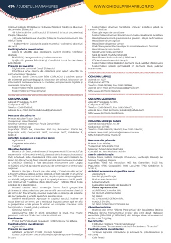 474 / JUDE%u021aUL MARAMURE%u0218 WWW.GHIDULPRIMARIILOR.ROHramul Bisericii Ortodoxe %u0219i Festivalul folcloric Tradi%u021bii %u015fi obiceiuri de pe Valea %u021aible%u015fului-19 iulie %u00eent%u00e2lnire cu fii satului ,fii bisericii la locul de pelerinaj Ple%u0219ca %u021aible%u0219ului- 20 iulie S%u0103rb%u0103toarea Mun%u021bilor %u021aible%u0219 la Crucea Monument din V%u00e2rful %u021aible%u0219-%u00a0 6 decembrie%u00a0 Cr%u0103ciun la poala muntelui - colinde %u015fi obiceiuri de iarn%u0103Facilit%u00e3%u0163i oferite investitorilor:Acces la utilit%u0103%u0163i: ap%u0103, canalizare, curent electric, telefonie digital%u0103Posibilit%u0103%u0163i de agroturism %u015fi turism montanSprijin din partea Prim%u0103riei %u015fi Consiliului Local %u00een derularea activit%u0103%u021bilorProiecte de investi%u0163ii:Digitaliarea comunei Gro%u0219ii %u021aible%u0219ului%u00cenfiin%u021barea unui centru de colectare prin aport voluntar %u00een comuna Gro%u0219ii %u021aible%u0219uluiDotarea %u0218colii Gimnaziale BEN CORLACIU ( cabinet %u0219colar de asisten%u021b%u0103 psihopedagogic%u0103, laborator de %u0219tiin%u021b%u0103, laborator de informatic%u0103 dotarea acestora cu mobilier, echipamente digitale %u0219i materiale didactice)Modernizare Valea Goronesei Modernizare centru comunalCOMUNA IEUDAdres%u0103: Principal%u0103, nr. 147Cod po%u0219tal: 437170Telefon: 0262-336205; Adresa de e-mail: primariadinieud@yahoo.comPersoane din primarie:Primar: Nicolae Traian%u00a0DavidViceprimar: Ioan%u00a0Chindri%u0219Secretar General interimar: Paula Dana%u00a0Micle%u00a0Contabil:%u00a0Ileana%u00a0IugaSuprafa%u021ba:%u00a0 11000 ha; Intravilan:%u00a0 500 ha; Extravilan:%u00a0 10500 ha; Popula%u021bia:%u00a0 4211; Gospod%u0103rii:%u00a0 1407; Locuin%u021be:%u00a0 1407; Gr%u0103dini%u021be:%u00a0 3; %u0218coli:%u00a03; Activitati economice si specifice zonei:Agricultur%u0103Cre%u015fterea animalelorTurismObiective turistice:Biserica din Deal, av%u00e2nd hramul %u201cNa%u015fterea Maicii Domnului%u201d (8 septembrie - Sf%u00e2nta M%u0103rie Mic%u0103), dateaz%u0103 de la %u00eenceputul secolului XVII, ortodox%u0103. Este considerat%u0103 %u00eentre cele mai vechi biserici de lemn din Maramure%u015f, fiind %u00eenscris%u0103 pe lista patrimoniului mondial al UNESCO. Biserica a fost declarat%u0103 monument prin Legea nr.5/2000 privind aprobarea planului de amenajare a teritoriului na%u0163ional.Biserica din %u015ees - Josani (sau din vale) - %u201cCatedrala din lemn%u201d a Maramure%u015fului istoric, greco-calolic%u0103. A fost ridicat%u0103 %u00een anul 1712 sau 1717. A fost construit%u0103 din lemn, dup%u0103 un plan dreptunghiular cu absid%u0103 poligonal%u0103 %u015fi decro%u015fat%u0103. Acoperi%u015ful este cu dubl%u0103 poal%u0103. Are Hramul tot %u201cNa%u015fterea Maicii Domnului%u201d - Sf%u00e2nta M%u0103rie Mic%u0103 celebrat la 8 septembrie.Muzeul satului Ieud. Amenajat %u00eentr-o fost%u0103 gospod%u0103rie %u0163%u0103r%u0103neasc%u0103, la baza dealului pe care se afl%u0103 cea mai veche biseric%u0103 de lemn din Maramure%u015f, muzeul cuprinde o colec%u0163ie de obiecte de port popular %u015fi unelte specifice acestei zone.Ateliere tradi%u0163ionale Aproape %u00een cap%u0103tul satului, %u00eenainte de noua biseric%u0103 de lemn, pe o str%u0103du%u0163%u0103 %u00eengust%u0103 peste ap%u0103 se afl%u0103 o gospod%u0103rie unde poate fi vizitat un complex mecanic %u00eenc%u0103 func%u0163ional cu moar%u0103, piv%u0103 %u015fi v%u00e2ltoare.Cimitirul evreiescAgroturismul este %u00een plin%u0103 dezvoltare la Ieud, mai multe pensiuni turistice fiind construite %u00een ultimii aniEvenimente:Prima duminic%u0103 dupa 15 august - %u00cent%u00e2lnirea cu Fiii satuluiFacilit%u00e3%u0163i oferite investitorilor:AgroturismProiecte de investi%u0163ii:Asfaltare - program PNDR - 11,3 km-finalizatConstruc%u0163ie sistem de canalizare %u015fi sta%u0163ie de epurare - investi%u0163ie %u00een cursModernizare drumuri forestiere inclusiv asfaltare p%u00e2n%u0103 la canton- finalizatExecu%u0163ie re%u0163ea de canalizareModernizare drumuri l%u0103turalnice inclusiv canalizarea acestoraReabilitarea termic%u0103 %u015fi exterioar%u0103 a %u015fcolilor - etapa de finalizareReabilitare drum agricolReabilitare dispensar umanPod Olaru peste R%u00e2ul Ieudi%u015for %u00een localitatea Ieud- finalizatReabilitare %u0218coala SuidicConstruc%u021bie sediu prim%u0103rieSal%u0103 de sport multifunc%u021bional%u0103Reabilitare c%u0103min cultural %u0219i bibliotec%u0103Eficientizare sistemului de ap%u0103Modernizare re%u021bea stadal%u0103 in comuna Ieud, jude%u021bul Maramure%u0219Modernizare %u0219coal%u0103%u00a0 gimnazial%u0103 %u00een comuna Ieud, jude%u021bul Maramure%u0219COMUNA L%u0102PU%u015eAdres%u0103: nr. 1027Cod po%u0219tal: 437175Telefon: 0262-381566; Fax: 0262-381566; Adresa de e-mail: primarialapus@gmail.comURL: www.primaria-lapus.roCOMUNA LEORDINAAdres%u0103: Principal%u0103, nr. 874Cod po%u0219tal: 437180Telefon: 0262-364471; Fax: 0262-364471; Adresa de e-mail: primaria_leordina@yahoo.comURL: www.primaria-leordina.roCOMUNA MIRE%u015eU MAREAdres%u0103: Doroban%u021bilor, nr. 39Cod po%u0219tal: 437185Telefon: 0262-284205, 284001; Fax: 0262-284001; Adresa de e-mail: primaria@miresu-mare.roURL: https://miresu-mare.ro/Persoane din primarie:Primar: Ioan M%u0103tie%u0219Viceprimar: Gheorghe T%u00eencSecretar: Anca Maria Cosmu%u021baContabil: ec. Ana Mariana%u00a0 Achim%u00a0%u00a0Sate %u00een administra%u021bie:Mire%u015fu Mare, Iad%u0103r%u0103, D%u0103ne%u0219tii Chioarului, Luc%u0103ce%u0219ti, Reme%u021bi pe Some%u0219, Tulghie%u015f, StejeraSuprafa%u021ba:%u00a0 7366 ha; Intravilan:%u00a0 963 ha; Extravilan:%u00a0 6403 ha; Popula%u021bia:%u00a0 4766; Gospod%u0103rii:%u00a0 1481; Locuin%u021be:%u00a0 1790; Gr%u0103dini%u021be:%u00a0 6; %u0218coli:%u00a04; Activitati economice si specifice zonei:Agricultur%u0103 Mor%u0103rit %u015fi panifica%u0163iePrelucrarea lemnuluiLegumicultur%u0103Exploatare agregate de