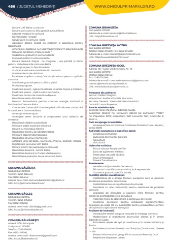 486 / JUDE%u021aUL MEHEDIN%u021aI WWW.GHIDULPRIMARIILOR.RODotare UAT Balta cu tractorDotare parc auto cu titlu gratuit autoutilitar%u0103Cabinet medical %u00een comun%u0103Nomenclator%u00a0 stradalSalubrizare %u00een comuna%u00a0 BaltaAprobare dotare %u0219coal%u0103%u00a0 cu mobilier %u0219i aparatura pentru laboratoareAmenajare ,,Castanul%u00a0 lui Tudor Vladimirescu%u201c %u00een satul Gornovi%u021baReluarea S%u0103rb%u0103torii,,Pe%u0219tera Balta %u201cCadastrare gratuit%u0103 %u00een comuna BaltaIluminat public %u00een comuna BaltaDotare biseric%u0103%u00a0 Prejna%u00a0 cu magazie , u%u0219a pictat%u0103 %u0219i b%u0103nci pentru%u00a0toate bisericile comunei BaltaAmenajare parc %u00een fa%u021ba Prim%u0103rieiCur%u0103%u021bat anual toate cimitirele din comun%u0103Iluminat festiv de s%u0103rb%u0103tori%u00cent%u00e2lnirea%u00a0 copiilor cu Mo%u0219 Cr%u0103ciun %u0219i cadouri pentru copiii din comunaSterilizare gratuit%u0103 pentru c%u00e2ini %u0219i pisici Proiecte propuseFinalizare poiect ,, Ap%u0103%u00a0%u0219i Canalizare %u00een satele Prejna %u0219i%u00a0Coste%u0219ti,,Finalizare poiect ,, Ap%u0103%u00a0%u00een satul Gornovi%u021ba ,,Finalizare Centru de colectare de%u0219euriReabilitare sediu Prim%u0103riePanouri Fotovoltaice pentru consum energie institu%u021bii %u0219i iluminat %u00een Comuna BaltaContinuare Cadastr%u0103rii Gratuite p%u00e2n%u0103%u00a0la finalizarea cadastr%u0103rii %u00een totalitate a Comunei BaltaAmenajare teren sportAmenjare teren brutarie %u0219i amplasarea unui obiectiv de investi%u021bieReabilitare cl%u0103dire %u0219coala Balta%u00cenfin%u021bare sta%u021bie %u00eenc%u0103rcare electric%u0103Dotare cu microbuz electricReabilitare Centru de S%u0103n%u0103tate Balta%u00cenfin%u021bare cabinet stomatologicReabilitare drumuri RomanioriAsfaltare uli%u021be sat Balta , Gornovi%u021ba , Prejna , Coste%u0219ti , SfodeaDigitalizare la nivelul UAT BaltaDotare sistem de supravegere comunalReabilitare biseric%u0103%u00a0, cimitir BaltaReabilitare biserica lui Tudor Vladimirescu Reabilitarea podurilor de pe raza UAT BaltaCOMUNA B%u0102L%u0102CI%u0162ACod po%u0219tal: 227040Telefon: 0252-356444; Fax: 0252-356444; Adresa de e-mail: comuna.balacitamh@yahoo.roURL: http://primaria-balacita.ro/COMUNA B%u00c2CLE%u015eCod po%u0219tal: 227045Telefon: 0252-375263; Fax: 0252-375263; Adresa de e-mail: clbicles@gmail.comURL: https://primariabacles.ro/COMUNA B%u00c2LV%u0102NE%u015eTIAdres%u0103: STR. PrincipalaCod po%u0219tal: 227055Telefon: 0252-216091; Fax: 0252-216091; Adresa de e-mail: clbalvanesti@gmail.comURL: https://balvanesti.ro/COMUNA BRANI%u015eTEACod po%u0219tal: 227491Adresa de e-mail: secretar@clbranistea.roURL: http://clbranistea.ro/COMUNA BREZNI%u0162A MOTRUCod po%u0219tal: 227060Telefon: 0252-374001; Fax: 0252-374001; Adresa de e-mail: contact@breznitamotru.roURL: http://www.breznitamotru.ro/COMUNA BREZNI%u0162A-OCOLAdres%u0103: Str. Tudor Vladimirescu, Nr. 18Cod po%u0219tal: 227070Telefon: 0252-210146; Fax: 0252-210246; Adresa de e-mail: comunabreznitaocol@yahoo.comcontact@breznitaocolprimaria.roURL: www.breznitaocolprimaria.roPersoane din primarie:Primar: C%u0103t%u0103lin Dr%u0103ghiciViceprimar: Anidora Daniela MucioniuSecretar General : Valeria Nicoleta MuschiciContabil: Laura PopescuSate %u00een administra%u021bie:Brezni%u0163a-Ocol, Magheru, Jido%u015fti%u0163a, %u015eu%u015fi%u0163aSuprafa%u021ba:%u00a0 8168,73 ha; Intravilan:%u00a0 380,03 ha; Extravilan:%u00a0 7788,7 ha; Popula%u021bia:%u00a0 3972; Gospod%u0103rii:%u00a0 1621; Locuin%u021be:%u00a0 1621; Gr%u0103dini%u021be:%u00a0 3; %u0218coli:%u00a04; Cum se ajunge in localitate:Intrarea se face din Centura Ocolitoare Drobeta-Turnu Severin, pe DJ 607BActivitati economice si specifice zonei:Cre%u015fterea animalelorCultivarea terenurilor agricoleApicultur%u0103 Viticultur%u0103Obiective turistice:Parcul natural Por%u0163ile de FierZona de agrement V%u0103r%u0103nicRezerva%u0163ia natural%u0103 V%u0103r%u0103nicSituri arheologiceTraseul TransilvanicaEvenimente:Nedeile tradi%u0163ionale din fiecare satFiii satului - de Sf%u00e2nta Maria Mic%u0103, %u00een 8 septembrieCiumarca (praznic specific zonei)Facilit%u00e3%u0163i oferite investitorilor:Posibilitatea de a atrage fonduri europene care va permite accesarea proiectelor structuralePosibilitatea de a atrage fonduri structuraleAsocierea cu alte comunit%u0103%u021bi pentru realizarea de proiecte comuneLegisla%u021bia de stimulare a asocierii %u00eentre fermieri pentru cre%u0219terea profitabilit%u0103%u021bii %u00een agricultur%u0103Poten%u021bial mare de dezvoltare a sectorului serviciilorCre%u0219terea cerin%u021belor pentru produsele agroalimentare ecologice pe pia%u021ba UE cu posibilit%u0103%u021bi pentru produc%u0103torii rom%u00e2ni de a practica agricultura ecologic%u0103Proiecte de investi%u0163ii:Introducere re%u021belei de gaze naturale %u00een %u00eentreaga comunaModernizare %u0219i reabilitarea drumurilor s%u0103te%u0219ti %u0219i %u00een satele Jidosti%u021ba %u0219i Su%u0219itaExtinderea re%u021belei de ap%u0103%u00a0%u0219i canalizare %u0219i %u00een satele Jidostita %u0219i Susi%u021baExtindere %u0219i modernizare %u0218coala Jido%u0219ti%u021ba ( Dumbrava ) clasele I %u2013 VIIISistem informational geografic %u00een comuna Brezni%u021ba Ocol Reabilitare dispensar uman