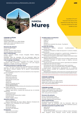 WWW.GHIDULPRIMARIILOR.RO 499Suprafa%u021b%u0103: 6.714 km%u00b2Popula%u021bie: 602.426 locuitoriRe%u0219edin%u021b%u0103 de jude%u021b: T%u00e2rgu Mure%u0219Popula%u021bia re%u0219edin%u021bei de jude%u021b: 165.835 locuitoriJUDE%u021aULMure%u0219COMUNA AC%u0102%u0162ARIAdres%u0103: Nr. 214Cod po%u0219tal: 547005Telefon: 0265-333112; Fax: 0265-333298; Adresa de e-mail: acatari@cjmures.roURL: www.acatari.roPersoane din primarie:Primar: Osv%u00e1th CsabaViceprimar:Secretar General: J%u00f3zsa FerenczContabil %u0219ef birou: F%u00fcl%u00f6p R%u00f3bertSate %u00een administra%u021bie:Ac%u0103%u0163ari, Corbe%u015fti, G%u0103ie%u015fti, Grui%u015for, Murge%u015fti, Roteni, Stejeri%u015f, Suveica, V%u0103leniSuprafa%u021ba:%u00a0 7420 ha; Intravilan:%u00a0 574 ha; Extravilan:%u00a0 6846 ha; Popula%u021bia:%u00a05300; Gospod%u0103rii:%u00a02377; Locuin%u021be:%u00a01934; Gr%u0103dini%u021be:%u00a09; %u0218coli:%u00a07; Cum se ajunge in localitate:Se poate ajunge la Comuna Ac%u0103%u021bari de-a lungul%u00a0 drumului European E-60 %u015fi drumului%u00a0 Jude%u021bean nr. D 151 care asigur%u0103 leg%u0103tura cu ora%u015fele%u00a0 %u015fi comunele%u00a0 %u00eenvecinateActivitati economice si specifice zonei:Activitatea de baz%u0103 a popula%u0163iei%u00a0 este agricultura prin cele dou%u0103%u00a0 activita%u0163i%u00a0 de baz%u0103: cultivarea plantelor si cre%u015fterea animalelor at%u00e2t pentru consum propriu c%u00e2t %u0219i pentru comercializarea excedentului.Datorit%u0103%u00a0 pozi%u0163iei geografice comuna a devenit un loc important pentru investitori.Agricultur%u0103Cre%u0219terea animalelorFabricarea cablurilorPrelucrarea lemnuluiMateriale de construc%u021bieT%u00e2mpl%u0103rieZid%u0103rie etc.Comer%u021b %u0219i prest%u0103ri serviciiFirme reprezentative:Comercializarea en-gross a b%u0103uturilor alcoolice %u0219i non alcoolice SC FAREL IMPEX SRLFabricarea de cabluri SC ROMCAB SAMagazin agro-tehnic, material de construc%u021bii etc. SC SURUB TRADE SRLIndustria lemnuluiProduc%u0103tori locali:Cultivare plante, produc%u0103tori mobileProduse locale: Plante, mobile, cabluriObiective turistice:Monumente istorice:Biserica Reformat%u0103 din Satul V%u0103lenii, Biserica Ortodox%u0103 din satul V%u0103lenii, Casa Toldalaghi din satul Murge%u0219tiRestaurant LyraPensiunea Stejari%u0219Pensiunea Neme%u0219%u0218trandul Tutti WellnessEvenimente:Zilele Comunei Ac%u0103%u021bari Festivalul OctombrieFacilit%u00e3%u0163i oferite investitorilor:Energie Electric%u0103Cablu TVInternetTerenuriConstruc%u021bia autostr%u0103zi Tg. Mure%u0219 %u2013 Tg. Neam%u021b For%u021b%u0103 de munc%u0103Proiecte de investi%u0163ii:Construire centru comunal multifunc%u021bional %u00een localitatea%u00a0G%u0103ie%u0219tiCanalizare menajer%u0103%u00a0%u0219i sta%u021bie de epurare %u00een comuna%u00a0Ac%u0103%u021bari, jude%u021bul Mure%u0219Cre%u0219terea eficien%u021bei energetice %u0219i gestionarea inteligent%u0103 a energiei %u00een %u0218coala Primar%u0103 V%u0103lenii, %u00een Comuna Ac%u0103%u021bariCanalizare menajer%u0103 %u00een satele V%u0103leni, G%u0103ie%u0219ti %u0219i extindere sta%u021bie de epurare Comuna Ac%u0103%u021bariAsfaltare str%u0103zi %u0219i drum comunal %u00een comuna Ac%u0103%u021bari, jude%u021bul Mure%u0219Canalizare menajer%u0103 %u00een satele Grui%u0219or %u0219i Stejeri%u0219, comuna Ac%u0103%u021bari, jud Mure%u0219Construire locuin%u021be de serviciu pentru speciali%u0219ti din s%u0103n%u0103tate %u0219i %u00eenv%u0103%u021b%u0103m%u00e2nt din Comuna Ac%u0103%u021bari%u00cenfiin%u021barea de centru de colectare prin aport voluntaryAlimentare cu ap%u0103%u00a0%u00een localitatiele A%u0103%u021bari, Murge%u0219ti %u0219i Stejeri%u0219Modernizarea infrastructurii educa%u021bionale %u0219i a dot%u0103rilor aferente pentru unit%u0103%u021bile de %u00eenv%u0103%u021b%u0103m%u00e2nt preuniversitare din comuna Ac%u0103%u021bariRealizarea de capacit%u0103%u021bi noi de producere a energiei electrice din surse solare pentru autoconsum %u00een comuna Ac%u0103%u021bari, jude%u021bul Mure%u0219COMUNA AD%u0102MU%u015eAdres%u0103: Livezilor, nr. 78Cod po%u0219tal: 547015Telefon: 0265-450112; Fax: 0265-450133; Adresa de e-mail: adamus@cjmures.roURL: www.primariaadamus.roCOMUNA ALUNI%u015eAdres%u0103: nr. 656; Cod po%u0219tal: 547035Telefon: 0265-553246; Fax: 0265-553112; Adresa de e-mail: alunis@cjmures.roURL: www.primaria-alunis.roPersoane din primarie:Primar: Krist%u00f3f J%u00f3zsef Lor%u00e1ntSecretar General: Kocsis Andr%u00e1sContabil: Zsigmond Piroska KatalinSate %u00een administra%u021bie:Aluni%u015f, Fi%u0163c%u0103u, Lunca Mure%u015fuluiSuprafa%u021ba:%u00a0 4053 ha; Intravilan:%u00a0 230 ha; Extravilan:%u00a0 2540 ha; Popula%u021bia:%u00a03248; Gospod%u0103rii:%u00a01160; Locuin%u021be:%u00a01300; Gr%u0103dini%u021be:%u00a03; %u0218coli:%u00a02; Activitati economice si specifice zonei:Agricultur%u0103ZootehniePrelucrarea lemnului130 de %u00eentreprinz%u0103tori particulari %u00een diferite meserii (t%u00e2mplari, zidari, dulgheri, fierari, faian%u0163ari, morari, brutari, pantofari,