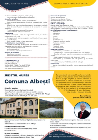 500 / JUDE%u021aUL MURE%u0218 WWW.GHIDULPRIMARIILOR.ROelectricieni, f%u00e2nt%u00e2nari, cojocari, croitori, etc.)O micro%u00eentreprindere de executare pantofiObiective turistice:V%u00e2rful Z%u0103spad - 1241 m %u015fi zona %u00eenconjur%u0103toareRezerva%u0163ia de lalele pestri%u0163e (Fritillaria meleagris) din LuncaMure%u015fuluiCasa Nimrod - centru cultural cu cazare a 40 persoane %u00een Aluni%u015fCasa de copii Tulipan cu cazare a 12 persoane %u00een LuncaMure%u015fuluiPensiunea Brigitta cazare a 15 persoaneCasa cu obiecte specifice comuneiEvenimente:Zilele Aluni%u015fene - care se organizeaz%u0103 anual, %u00een ultimul weekend din luna iunieGy%u00f6ngykoszor%u00fa - dansuri populare tradi%u0163ionale, %u00een luna august la Lunca Mure%u015fuluiZilele satului Fi%u0163c%u0103u - %u00een luna septembrieFacilit%u00e3%u0163i oferite investitorilor:Punerea %u00een valoare a resurselor de ap%u0103 s%u0103rat%u0103 din Lunca Mure%u015fului prin amenajarea unei baze de tratamentAsigurarea for%u0163ei de munc%u0103Scutire de impozitConcensionare teren pe 49 de ani 5 haProiecte de investi%u0163ii:Canalizarea comuneiReabilit%u0103ri de drumuri comunaleCOMUNA ALBE%u015eTIAdres%u0103: Lung%u0103, nr. 123Cod po%u0219tal: 547025Telefon: 0265-778001; Fax: 0265-777168; Adresa de e-mail: albesti@cjmures.roURL: www.comunaalbesti.roPersoane din primarie:Primar: Nicolae %u015eovreaViceprimar: Sergiu Ioan FintocSecretar General: D%u0103nu%u0163 PurcariuContabil: Maria ZirboSate %u00een administra%u021bie:Albe%u015fti, Boiu, %u0162opa, %u015eapartoc, JacuSuprafa%u021ba:%u00a0 8270,39 ha; Intravilan:%u00a0 736,98 ha; Extravilan:%u00a0 7533,41 ha; Popula%u021bia:%u00a06433; Gospod%u0103rii:%u00a01825; Locuin%u021be:%u00a01924; Gr%u0103dini%u021be:%u00a02; %u0218coli:%u00a02; Activitati economice si specifice zonei:Agricultur%u0103ZootehnieIndustrieTurismComer%u0163Prest%u0103ri serviciiProduc%u0163ie confec%u0163ii textilePrelucr%u0103ri metaliceT%u00e2mpl%u0103riePensiuni - hotelIndustrie u%u015foar%u0103%u00a0Obiective turistice:Monumente %u015fi ansambluri de arhitectur%u0103:- Casa Parohial%u0103 a bisericii reformate, sf. sec XIX - Albe%u015fti;- Biserica reformat%u0103- cu elemente gotice, sec XV-XVIII, XIX - Albe%u015fti;- Cas%u0103, strada Principal%u0103 nr. 198, sf. sec. XIX - Boiu.Monumente %u015fi ansambluri de art%u0103 plastic%u0103 %u015fi cu valoare memorial%u0103:- Monumentul lui Pet%u0151fi S%u00e1ndor 1949 - Albe%u015ftiEvenimente:Ultima duminic%u0103 din luna iulie - comemorarea poetului Pet%u0151fi Sandor