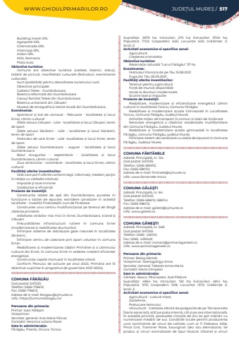 WWW.GHIDULPRIMARIILOR.RO JUDE%u021aUL MURE%u0218 / 517Building Invest SRLAgroprest SRLChemotrade SRLIntercoop SRLArdon SRLMOL RomaniaPia%u021ba Auto Obiective turistice:Comuna are obiective turistice (castele, biserici, statui), tab%u0103r%u0103 de pictur%u0103, manifesta%u021bii culturale (festivaluri, evenimente culturale).Sunt posibilit%u0103%u021bi pentru dezvoltarea turismului rural.Obiective principale:Castelul Teleki - Dumbr%u0103vioaraBiserica reformat%u0103 din Dumbr%u0103vioaraCavoul familiei Teleki din Dumbr%u0103vioaraBiserica unitarian%u0103 din C%u0103lu%u0219eri Muzeul de etnografie %u0219i istorie local%u0103 din Dumbr%u0103vioaraEvenimente:Spectacol %u0219i bal de carnaval - februarie - localitatea %u0219i locul Ernei, c%u0103min culturalZilele satului C%u0103lu%u0219eri - iulie - localitatea %u0219i locul C%u0103lu%u0219eri, teren de sportZilele satului S%u0103c%u0103reni - iulie - localitatea %u0219i locul S%u0103c%u0103reni, teren de sportFestivalul de var%u0103 Ernei - iulie -localitatea %u0219i locul Ernei, teren de sportZilele satului Dumbr%u0103vioara - august - localitatea %u0219i locul Dumbr%u0103vioaraBalul strugurilor - septembrie - localitatea %u0219i locul Dumbr%u0103vioara, c%u0103min cutural Ziua v%u00e2rstnicilor - octombrie - localitatea %u0219i locul Ernei, c%u0103min culturalFacilit%u00e3%u0163i oferite investitorilor:Cele care pot fi oferite conform legii, informa%u0163ii, medieri, sprijin %u00een rela%u0163ia cu celelalte institu%u0163iiImpozite %u015fi taxe minimeColaborare %u015fi eficien%u0163%u0103Proiecte de investi%u0163ii:Construc%u021bia re%u021belei de ap%u0103 din Dumbr%u0103vioara, punerea %u00een func%u021biune a sta%u021biei de epurare, extindere canalizare %u00een aceast%u0103 localitate - investi%u021bii finalizate/%u00een curs de finalizareConstruirea unui centru multifunc%u021bional pe terenul de l%u00e2ng%u0103 cl%u0103direa prim%u0103rieiAsfaltarea str%u0103zilor mai mici %u00een Ernei, Dumbr%u0103vioara, Icland %u0219i C%u0103lu%u0219eri%u00cembun%u0103t%u0103%u021birea infrastructurii rutiere %u00een comuna Ernei (modernizarea %u0219i reabilitarea drumurilor)%u00cenfiin%u021bare sisteme de distribu%u021bie gaze naturale %u00een localitatea S%u0103c%u0103reni,%u00cenfiin%u021bare centru de colectare prin aport voluntar %u00een comuna Ernei,Reabilitarea %u0219i modernizarea cl%u0103dirii Prim%u0103riei %u0219i a c%u0103minului cultural din Ernei, %u00een comuna Ernei %u00een vederea cre%u0219terii eficien%u021bei energetice,Construc%u021bie capel%u0103 mortuar%u0103 %u00een localitatea Icland Conform Planului de ac%u021biune pe anul 2023, Prim%u0103ria are 15 obiective cuprinse %u00een programul de guvernare 2021-2024).COMUNA F%u0102R%u0102G%u0102UCod po%u0219tal: 547225Telefon: 0265-716612; Fax: 0265-716612; Adresa de e-mail: faragau@cjmures.roURL: https://comunafaragau.ro/Persoane din primarie:Primar: Ioan Mil%u0103%u015fanViceprimar:Secretar general: Ana Maria F%u0103rca%u0219Contabil: Veronica Iuliana PavelSate %u00een administra%u021bie:F%u0103r%u0103g%u0103u, Poarta, Onuca, TonciuSuprafa%u021ba:%u00a0 3975 ha; Intravilan:%u00a0 275 ha; Extravilan:%u00a0 3700 ha; Popula%u021bia:%u00a0 1723; Gospod%u0103rii:%u00a0 625; Locuin%u021be:%u00a0 625; Gr%u0103dini%u021be:%u00a0 2; %u0218coli:%u00a02; Activitati economice si specifice zonei:Agricultur%u0103Cre%u015fterea animalelorObiective turistice:Rezerva%u021bia natural%u0103%u00a0%u201cLacul F%u0103r%u0103g%u0103u%u201d 37 haEvenimente:Festivalul Floricica de pe T%u0103u 15.08.2021Fuga din T%u0103u 03.05.2021Facilit%u00e3%u0163i oferite investitorilor:Terenuri pentru agricultur%u0103For%u0163%u0103 de munc%u0103 disponibil%u0103Acces la drumuri modernizateScutire taxe %u015fi impoziteProiecte de investi%u0163ii:Reabilitare, modernizare %u0219i eficientizare energetic%u0103%u00a0 c%u0103min cultural %u00een localitatea Tonciu, Comuna F%u0103r%u0103g%u0103uReabilitare %u0219i modernizare %u0219coala Gimnazial%u0103%u00a0 %u00een Localitatea Tonciu, Comuna F%u0103r%u0103g%u0103u, Jude%u021bul Mure%u0219Achizi%u021bie mijloc de transport %u00een comun %u0219i sta%u021bii de %u00eenc%u0103rcareRenovare energetic%u0103%u00a0 a cl%u0103dirilor reziden%u021biale multifamiliare din Comuna F%u0103r%u0103g%u0103u, Jude%u021bul Mure%u0219Reabilitare %u0219i modernizare %u0219coala gimnazial%u0103%u00a0 %u00een localitatea F%u0103r%u0103g%u0103u, comuna F%u0103r%u0103g%u0103u, jude%u021bul Mure%u0219%u00cenfiin%u021bare sistem de canalizare cu sta%u021bie de epurare %u00een Comuna F%u0103r%u0103g%u0103u, Jude%u021bul Mure%u0219COMUNA F%u00c2NT%u00c2NELEAdres%u0103: Principal%u0103, nr. 124Cod po%u0219tal: 547235Telefon: 0265-580112; Fax: 0265-580112; Adresa de e-mail: fintinele@cjmures.roURL: www.fantanele-ms.roCOMUNA G%u0102LE%u015eTIAdres%u0103: Principal%u0103, nr. 64Cod po%u0219tal: 547245Telefon: 0265-586112, 586114; Fax: 0265-586112; Adresa de e-mail: galesti@cjmures.roURL: www.galesti.roCOMUNA G%u0102NE%u015eTIAdres%u0103: Principal%u0103, nr. 548Cod po%u0219tal: 547255Telefon: 0265- 425101; Fax: 0265- 425049; Adresa de e-mail: contact@primariaganesti.roURL: www.primariaganesti.roPersoane din primarie:Primar: Balog%u00a0Elem%u00e9rViceprimar: Szentgy%u0151rgyi AnnaSecretar General: Tekeres Anna-MariaContabil: Maria C%u00eempeanSate %u00een administra%u021bie:G%u0103ne%u015fti, Seuca, P%u0103uci%u015foara, Sub P%u0103dureSuprafa%u021ba:%u00a0 4964 ha; Intravilan:%u00a0 150 ha; Extravilan:%u00a0 4814 ha; Popula%u021bia:%u00a0 3131; Gospod%u0103rii:%u00a0 1518; Locuin%u021be:%u00a0 1372; Gr%u0103dini%u021be:%u00a0 2; %u0218coli:%u00a03; Activitati economice si specifice zonei:Agricultur%u0103 - cultur%u0103 mare,Zootehnie,Prelucrare lemnuluiViticultur%u0103 - Calitatea oferit%u0103 de podgoriile de pe T%u00e2rnave este foarte apreciat%u0103, at%u00e2t pe pia%u021ba intern%u0103, c%u00e2t %u0219i pe cea interna%u021bional%u0103. %u00cen aceast%u0103 privin%u021b%u0103, produsele vinicole de