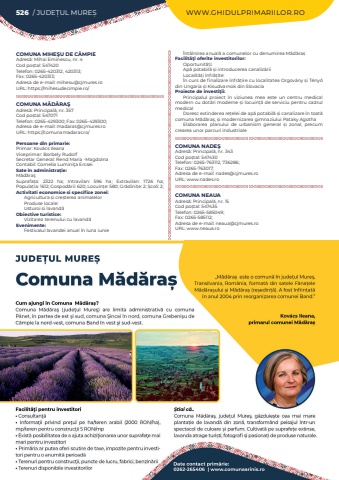 526 / JUDE%u021aUL MURE%u0218 WWW.GHIDULPRIMARIILOR.ROCOMUNA MIHE%u015eU DE C%u00c2MPIEAdres%u0103: Mihai Eminescu, nr. 4Cod po%u0219tal: 547420Telefon: 0265-420312, 420313; Fax: 0265-420313; Adresa de e-mail: mihesu@cjmures.roURL: https://mihesudecimpie.ro/COMUNA M%u0102D%u0102RA%u015eAdres%u0103: Principal%u0103, nr. 357Cod po%u0219tal: 547071Telefon: 0265-429300; Fax: 0265-429300; Adresa de e-mail: madaras@cjmures.roURL: https://comunamadaras.ro/Persoane din primarie:Primar: Kov%u00e1cs IleanaViceprimar: Borbely RudolfSecretar General: Rend Maria -MagdolnaContabil: Cornelia Lumini%u0163a ErcseiSate %u00een administra%u021bie:M%u0103d%u0103ra%u015fSuprafa%u021ba:%u00a0 2322 ha; Intravilan:%u00a0 596 ha; Extravilan:%u00a0 1726 ha; Popula%u021bia:%u00a01612; Gospod%u0103rii:%u00a0620; Locuin%u021be:%u00a0580; Gr%u0103dini%u021be:%u00a02; %u0218coli:%u00a02; Activitati economice si specifice zonei:Agricultura %u0219i cre%u0219terea animalelorProduse locale: Usturoi %u0219i lavand%u0103 Obiective turistice:Vizitarea terenului cu lavand%u0103Evenimente:Festivalul lavandei anual %u00een luna iunie%u00cent%u00e2lnirea anual%u0103 a comunelor cu denumirea M%u0103d%u0103ra%u0219Facilit%u00e3%u0163i oferite investitorilor:Oportunit%u0103%u021bi:Ap%u0103 potabil%u0103 %u0219i introducerea canaliz%u0103riiLocalit%u0103%u021bi %u00eenfr%u0103%u021bite:%u00cen curs de finalizare %u00eenfr%u0103%u021bire cu localitatea Orgov%u00e1ny %u0219i T%u00e9ny%u0151 din Ungaria %u0219i Kisudvarnok din SlovaciaProiecte de investi%u0163ii:Principalul proiect %u00een viziunea mea este un centru medical modern cu dot%u0103ri moderne %u0219i locuin%u021b%u0103 de serviciu pentru cadrul medicalDoresc%u00a0extinderea re%u021belei de ap%u0103 potabil%u0103 %u0219i canalizare %u00een toat%u0103 comuna M%u0103d%u0103ra%u0219, %u0219i modernizarea gimnaziului Pataky AgothaElaborarea planului de urbanism general %u0219i zonal, precum crearea unor parcuri industrialeCOMUNA NADE%u015eAdres%u0103: Principal%u0103, nr. 343Cod po%u0219tal: 547430Telefon: 0265-763112, 736286; Fax: 0265-763017; Adresa de e-mail: nades@cjmures.roURL: www.nades.roCOMUNA NEAUAAdres%u0103: Principal%u0103, nr. 15Cod po%u0219tal: 547435Telefon: 0265-585049; Fax: 0265-585112; Adresa de e-mail: neaua@cjmures.roURL: www.neaua.ro