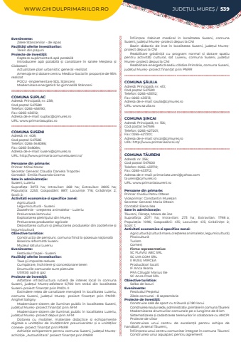 WWW.GHIDULPRIMARIILOR.RO JUDE%u021aUL MURE%u0218 / 539Evenimente:Zilele St%u00e2ncenilor - de ispasFacilit%u00e3%u0163i oferite investitorilor:Teren din p%u0103%u015funiProiecte de investi%u0163ii:Captare suplimentar%u0103 ap%u0103 potabil%u0103Introducere ap%u0103 potabil%u0103 %u0219i canalizare %u00een satele Me%u0219tera %u0219i CiobotaniActualizare plan urbanistic general -realizatAmenajare %u0219i dotare centru Medico-Social %u00een propor%u021bie de 95% realizatPOCU -implementare SDL St%u00e2nceniModernizare energetic%u0103%u00a0Sc.gimnazil%u0103%u00a0St%u00e2nceniCOMUNA SUPLACAdres%u0103: Principal%u0103, nr. 238; Cod po%u0219tal: 547580Telefon: 0265-456190; Fax: 0265-456112; Adresa de e-mail: suplac@cjmures.roURL: www.primariasuplac.roCOMUNA SUSENIAdres%u0103: nr. 408; Cod po%u0219tal: 547585Telefon: 0265-348086; Fax: 0265-348084; Adresa de e-mail: suseni@cjmures.roURL: http://www.primariacomuneisuseni.ro/Persoane din primarie:Primar: Mihai MorarSecretar General: Claudia Daniela%u00a0Tropotei%u00a0Contabil:%u00a0 Emilia Ruxanda%u00a0Grama%u00a0Sate %u00een administra%u021bie:Suseni, LuieriuSuprafa%u021ba:%u00a0 3073 ha; Intravilan:%u00a0 268 ha; Extravilan:%u00a0 2805 ha; Popula%u021bia:%u00a0 2253; Gospod%u0103rii:%u00a0 887; Locuin%u021be:%u00a0 716; Gr%u0103dini%u021be:%u00a0 2; %u0218coli:%u00a02; Activitati economice si specifice zonei:Agricultur%u0103Legumicultur%u0103 - SuseniZootehnie - cre%u015fterea animalelor - LuieriuPrelucrarea lemnuluiExploatarea pietri%u015fului din Mure%u015fPrelucrarea produselor agricoleDezvoltarea culturii %u0219i prelucrarea produselor din zootehnie %u0219i legumicultur%u0103Obiective turistice:Construc%u0163ia de pensiuni, comuna fiind la %u015foseaua na%u0163ional%u0103Biserica reformat%u0103 SuseniMuzeul satului LuieriuEvenimente:Festivalul Cepei - SuseniFacilit%u00e3%u0163i oferite investitorilor:Taxe %u015fi impozite reduseCump%u0103rare, %u00eenchiriere %u015fi concesionare terenDrumurile comunale sunt pietruite Utilit%u0103%u021bi ap%u0103 %u0219i gazProiecte de investi%u0163ii:Asfaltare infrastructura rutier%u0103%u00a0 de interes local %u00een comuna Suseni, jude%u021bul Mure%u0219-asfaltare 6,700 km str%u0103zi din localitatea Suseni-proiect finan%u021bat prin PNDL IIExtindere re%u021bea de canalizare menajer%u0103%u00a0%u00een localitatea Luieriu, comuna Suseni, jude%u021bul Mure%u0219- proiect finan%u021bat prin PNRRAnghel SalignyModernizare sistem de iluminat public %u00een localitatea Suseni, jude%u021bul Mure%u0219- proiect finan%u021bat prin AFMModernizare sistem de iluminat public %u00een localitatea Luieriu, jude%u021bul Mure%u0219- proiect depus prin AFMDotarea cu mobilier, materiale didactice %u0219i echipamente digitale a unit%u0103%u021bilor de %u00eenv%u0103%u021b%u0103m%u00e2nt preuniversitar %u0219i a unit%u0103%u021bilor conexe-%u00a0proiect finan%u021bat prin PNRRAchizi%u021bie echipament pentru comuna Suseni, jude%u021bul Mure%u0219achizi%u021bie ,,Autoutilitara%u2019%u2019 proiect finan%u021bat prin PNRR%u00cenfiin%u021bare Cabinet medical %u00een localitatea Suseni, comuna Suseni, jude%u021bul Mure%u0219- proiect depus la CNIBazin didactic de %u00eenot %u00een localitatea Suseni, jude%u021bul Mure%u0219proiect depus la CNIReabilitare gr%u0103dini%u021b%u0103%u00a0 cu program normal %u0219i dotare spa%u021biu pentru activit%u0103%u021bi cultural, sat Luieriu, comuna Suseni, jude%u021bul Mures- proiect depus la CNIReabilitare energetic%u0103 sediu cl%u0103dire Prim%u0103rie, comuna Suseni, jude%u021bul Mure%u0219- proiect finan%u021bat prin PNRRCOMUNA %u015e%u0102ULIAAdres%u0103: Principal%u0103, nr. 413; Cod po%u0219tal: 547590Telefon: 0265-435112; Fax: 0265-435113; Adresa de e-mail: saulia@cjmures.roURL: www.saulia.roCOMUNA %u015eINCAIAdres%u0103: Principal%u0103, nr. 156; Cod po%u0219tal: 547595Telefon: 0265-427201; Fax: 0265-427201; Adresa de e-mail: sincai@cjmures.roURL: http://www.primariasincai.ro/COMUNA T%u0102URENIAdres%u0103: nr. 256; Cod po%u0219tal: 547600Telefon: 0265-433712; Fax: 0265-433712; Adresa de e-mail: primariataureni@yahoo.comtaureni@cjmures.roURL: www.primariataureni.roPersoane din primarie:Primar: Ovidiu Petru OlteanViceprimar: Constantin Mure%u0219anSecretar General: Maria OlteanContabil: Elena IleaSate %u00een administra%u021bie:T%u0103ureni, F%u00e2na%u0163e, Moara de JosSuprafa%u021ba:%u00a0 2071 ha; Intravilan:%u00a0 273 ha; Extravilan:%u00a0 1798 a;Popula%u021bia:%u00a0 1096; Gospod%u0103rii:%u00a0 415; Locuin%u021be:%u00a0 415; Gr%u0103dini%u021be:%u00a0 2; %u0218coli:%u00a01; Activitati economice si specifice zonei:Agricultur%u0103 (cultur%u0103 mare, cre%u0219terea animalelor, legumicultur%u0103)Piscicultur%u0103TurismComer%u021b Firme reprezentative:SC FLAVIU ABC SRLSC LYA COM SRLII RUSU MIRCEAProduc%u0103tori locali:IF Anca IleanaPFA C%u0103lug%u0103r Marius Ilie SC Anca Prod SRLObiective turistice:Salba de lacuriEvenimente:Festivalul Pe%u015fteluiZilele comunei - 8 septembrieProiecte de investi%u0163ii:Construire sal%u0103 de sport cu tribun%u0103 %u0219i 180 locuiConstruirea noului sediu administrativ ,prim%u0103rie %u00een comuna T%u0103ureniModernizarea drumurilor comunale pe o lungime de 8 kmSistematizarea %u0219i cadastrarea terenurilor %u00een colaborare cu ANCPIProiecte de viitorConstruirea unui centru de excelen%u021b%u0103 pentru echipa de handball ,,Arsenal T%u0103ureni,,%u00cenfiin%u021barea unui centru comunitar integrat %u00een comuna T%u0103ureni Construirea unui aquaparc pentru agrement