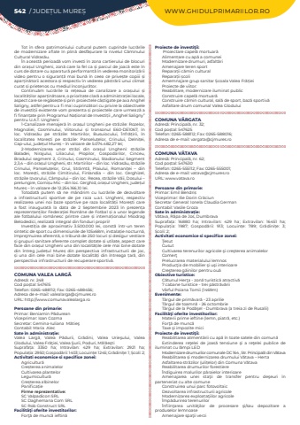 542 / JUDE%u021aUL MURE%u0218 WWW.GHIDULPRIMARIILOR.ROTot %u00een sfera patrimoniului cultural putem cuprinde lucr%u0103rile de modernizare aflate %u00een plin%u0103 desf%u0103%u0219urare la nivelul C%u0103minului Cultural Vidras%u0103u.%u00cen aceast%u0103 perioad%u0103 vom investi %u00een zona cartierului de blocuri din ora%u0219ul Ungheni, zon%u0103 care la fel ca %u0219i parcul de joac%u0103 este %u00een curs de dotare cu aparatur%u0103 performant%u0103 %u00een vederea monitoriz%u0103rii video pentru o siguran%u021b%u0103 mai bun%u0103 %u00een ceea ce prive%u0219te copiii %u0219i apar%u021bin%u0103torii acestora %u0219i respectiv %u00een vederea p%u0103str%u0103rii unui climat curat %u0219i prietenos cu mediul %u00eenconjur%u0103tor.Continu%u0103m lucr%u0103rile la re%u021beaua de canalizare a ora%u0219ului %u0219i localit%u0103%u021bilor apar%u021bin%u0103toare, o prioritate clar%u0103 a administra%u021biei locale, aspect care se reg%u0103se%u0219te %u0219i prin proiectele c%u00e2%u0219tigate pe axa Anghel Saligny, astfel pentru a fi mai cuprinz%u0103tori cu privire la obiectivele de investi%u021bii existente vom prezenta %u0219i proiectele care urmeaz%u0103 a fi finan%u021bate prin Programul Na%u021bional de Investi%u021bii %u201eAnghel Saligny%u201d pentru U.A.T. Ungheni:1-Canalizare menajer%u0103 %u00een ora%u0219ul Ungheni pe str%u0103zile: Rozelor, Magnoliei, Cosminului, Viitorului %u0219i tronsonul E60-DE1067, %u00een loc. Vidras%u0103u pe str%u0103zile: Martirilor, Busuiocului, %u00cenfr%u0103%u021birii, %u00een localitatea%u00a0 More%u0219ti pe str%u0103zile: Panselu%u021belor, Crinului, Delni%u021bei, Cap-ului, jude%u021bul Mure%u0219 %u2013 %u00een valoare de 5.074.482,27 lei;2-Modernizarea unor str%u0103zi din ora%u0219ul Ungheni: str%u0103zile Baladei, Nirajului, Liliacului, Plopilor, Gospodarilor, Cinceu, Bradului segment 2, Crinului, Cosminului, Stadionului Segment 2,3,4 %u2013 din ora%u0219ul Ungheni, str. Martirilor %u2013 din loc. Vidras%u0103u, str%u0103zile Crinului, Panselu%u021belor, Grui, Str%u00e2mt%u0103, Plaiului, Romani%u021bei %u2013 din loc. More%u0219ti, str%u0103zile Cimitirului, Finlandia %u2013 din loc. Cerghizel, str%u0103zile Izvorului, C%u00e2mpului %u2013 din loc. Recea, str%u0103zile V%u0103ii, Dosului %u2013 prelungire, Corni%u0219u Mic %u2013 din loc. Cerghid, ora%u0219ul Ungheni, jude%u021bul Mure%u0219 %u2013 %u00een valoare de 12.254.166,10 lei.Totodat%u0103 putem s%u0103 ne m%u00e2ndrim cu lucr%u0103rile de dezvoltare a infrastructurii sportive de pe raza u.a.t. Ungheni, respectiv realizarea unei noi baze sportive pe raza localit%u0103%u021bii More%u0219ti care a fost inaugurat%u0103 la data de 2 Septembrie 2023 %u00een prezen%u021ba reprezentan%u021bilor Federa%u021biei Rom%u00e2ne de Fotbal %u0219i a unor legende ale fotbalului rom%u00e2nesc printre care %u0219i interna%u021bionalul Miodrag Belodedici, realizat%u0103 integral din fonduri proprii!Investi%u021bia de aproximativ 3.500.000 lei, const%u0103 %u00eentr-un teren sintetic de sport cu dimensiunile de 105x68m, instala%u021bie nocturn%u0103, %u00eemprejmuirea aferent%u0103, o tribun%u0103 de 250 locuri %u0219i desigur vestiare %u0219i grupuri sanitare aferente complet dotate %u0219i utilate, aspect care face din ora%u0219ul Ungheni una din localit%u0103%u021bile cele mai bine dotate din %u00eentreg jude%u021bul Mure%u0219 din perspectiva infrastructurii de joc, %u0219i una din cele mai bine dotate localit%u0103%u021bi din %u00eentreaga %u021bar%u0103, din perspectiva infrastructurii de recuperare sportiv%u0103.COMUNA VALEA LARG%u0102Adres%u0103: nr. 248Cod po%u0219tal: 547615Telefon: 0265-488112; Fax: 0265-488456; Adresa de e-mail: valealarga@cjmures.roURL: http://www.comunavalealarga.roPersoane din primarie:Primar: Beniamin%u00a0P%u0103dureanViceprimar: Ioan CozmaSecretar: Gemina-Iuliana%u00a0%u00a0M%u0103tie%u015fContabil: Maria%u00a0%u00a0AlecSate %u00een administra%u021bie:Valea Larg%u0103,%u00a0 Valea P%u0103durii,%u00a0 Gr%u0103dini,%u00a0 Valea Urie%u015fului,%u00a0 Valea Glodului,%u00a0Valea Fr%u0103%u0163iei, Valea %u015eurii, Poduri,%u00a0M%u0103l%u0103e%u015ftiSuprafa%u021ba:%u00a0 3350 ha; Intravilan:%u00a0 429 ha; Extravilan:%u00a0 2921 ha; Popula%u021bia:%u00a02950; Gospod%u0103rii:%u00a01403; Locuin%u021be:%u00a01245; Gr%u0103dini%u021be:%u00a01; %u0218coli:%u00a02; Activitati economice si specifice zonei:Agricultur%u0103Cre%u0219terea animalelorCultivarea plantelorLegumicultur%u0103Cre%u0219terea albinelorPanifica%u021bieFirme reprezentative:SC Valpadicon SRLSC Daghemana Com%u00a0SRLSC Rob Construct SRLFacilit%u00e3%u0163i oferite investitorilor:For%u0163%u0103 de munc%u0103 ieftin%u0103Proiecte de investi%u0163ii:%u00a0Proiectare capel%u0103 mortuar%u0103Alimentare cu ap%u0103 a comuneiModernizare drumuri, asfalt%u0103riAmenajare teren sportRepara%u021bii c%u0103min culturalRepara%u021bii %u0219coliAmemnajare grup sanitar %u0218coala Valea Fr%u0103%u021bieiProiecte de viitor:Reabilitare, modernizare iluminat publicConstruire capel%u0103 mortuar%u0103Construire c%u0103min cultural, sal%u0103 de sport, baz%u0103 sportiv%u0103Asfaltare drum comunal Valea GloduluiCOMUNA V%u0102RGATAAdres%u0103: Principal%u0103, nr. 32;Cod po%u0219tal: 547625Telefon: 0265-588112; Fax: 0265-588016; Adresa de e-mail: vargata@cjmures.roCOMUNA V%u0102TAVAAdres%u0103: Principal%u0103, nr. 62; Cod po%u0219tal: 547630Telefon: 0265-555112; Fax: 0265-555001; Adresa de e-mail: vatava@cjmures.roURL: www.vatava.roPersoane din primarie:Primar: Emil Bendri%u0219Viceprimar: Ilie Dorin Cr%u0103ciunSecretar General: Ionela Claudia GermanContabil: Vasile GrozaSate %u00een administra%u021bie:V%u0103tava, R%u00e2pa de Jos, DumbravaSuprafa%u021ba:%u00a0 16880 ha; Intravilan:%u00a0 429 ha; Extravilan:%u00a0 16451 ha; Popula%u021bia:%u00a0 1987; Gospod%u0103rii:%u00a0 913; Locuin%u021be:%u00a0 789; Gr%u0103dini%u021be:%u00a0 3; %u0218coli:%u00a02; Activitati economice si specifice zonei:%u0162esutCusut Cultivar