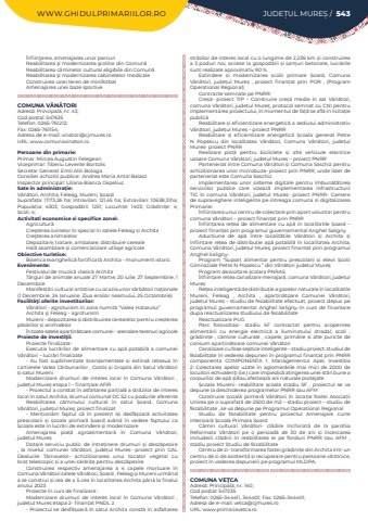 WWW.GHIDULPRIMARIILOR.RO JUDE%u021aUL MURE%u0218 / 543%u00cenfiin%u0163area, amenajarea unor parcuriReabilitarea %u015fi modernizarea %u015fcolilor din Comun%u0103 Reabilitarea c%u0103minelor cultural eligibile din Comun%u0103Reabilitarea %u015fi modernizarea cabinetelor medicaleConstruirea unei teren de minifotbal Amenajarea unei baze sportiveCOMUNA V%u00c2N%u0102TORIAdres%u0103: Principal%u0103, nr. 43; Cod po%u0219tal: 547635Telefon: 0265-761212; Fax: 0265-761154; Adresa de e-mail: vinatori@cjmures.roURL: www.comunavinatori.roPersoane din primarie:Primar:%u00a0Mircea Augustin%u00a0Felegean%u00a0Viceprimar: Tiberiu Levente%u00a0BortolisSecretar General:%u00a0Emil Alin%u00a0BologaConsilier achizitii publice:%u00a0 Andrea Maria%u00a0Antal BalaszInspector principal:%u00a0Liliana-Bianca%u00a0Cepeliuc%u00a0Sate %u00een administra%u021bie:V%u00e2n%u0103tori, Archita, Feleag, Mureni, %u0218oardSuprafa%u021ba:%u00a011173,26 ha; Intravilan:%u00a0121,45 ha; Extravilan:%u00a010638,31ha; Popula%u021bia:%u00a0 4303; Gospod%u0103rii:%u00a0 1251; Locuin%u021be:%u00a0 1403; Gr%u0103dini%u021be:%u00a0 4; %u0218coli:%u00a04; Activitati economice si specifice zonei:Agricultur%u0103Cre%u015fterea ovinelor %u00een special %u00een satele Feleag %u0219i ArchitaCre%u015fterea animalelorDepozitare, tratare, ambalare, distribuire cereale Hal%u0103 asamblare %u0219i comercializare utilaje agricoleObiective turistice:Biserica evanghelic%u0103 fortificat%u0103 Archita - monument istoricEvenimente:Festivalul de muzic%u0103 clasic%u0103 ArchitaT%u00e2rguri de animale anuale 27 Martie, 20 iulie, 27 Septembrie, 1 DecembrieManifest%u0103ri cultural artistice cu ocazia unor s%u0103rb%u0103tori na%u0163ionale (1 Decembrie, 24 Ianuarie, Ziua eroilor neamului, 25 Octombrie)Facilit%u00e3%u0163i oferite investitorilor:V%u00e2n%u0103tori - agroturism %u00een zona numit%u0103 %u201cValea Hotarului%u201dArchita %u015fi Feleag - agroturismMureni - depozitarea %u0219i distribuirea cerealelor pentru cre%u0219terea p%u0103s%u0103rilor %u0219i animalelor%u00cen toate satele apar%u021bin%u0103toare comunei - arendare terenuri agricoleProiecte de investi%u0163ii:Proiecte finalizate :Execu%u021bia lucr%u0103rilor de alimentare cu ap%u0103%u00a0potabil%u0103%u00a0a comunei V%u00e2n%u0103tori %u2013 lucr%u0103ri finalizate- Au fost suplimentate bran%u0219amentele %u0219i extins%u0103%u00a0 re%u021beaua %u00een cartierele Valea C%u0103rbunarilor , Costis %u0219i Gropila din Satul V%u00e2n%u0103tori %u0219i satul MureniModernizare drumuri de interes local %u00een Comuna V%u00e2n%u0103tori , jude%u021bul Mure%u0219%u00a0etapa 1 %u2013 finan%u021bare AFIR- Proiectul a constat %u00een asfaltarea par%u021bial%u0103%u00a0a str%u0103zilor de interes local %u00een satul Archita, drumul comunal DC 52 cu podurile aferenteReabilitarea c%u0103minului cultural %u00een satul %u0218oard, Comuna V%u00e2n%u0103tori, jude%u021bul Mure%u0219, proiect finalizat- Men%u021bion%u0103m faptul c%u0103%u00a0 %u00een prezent %u00ee%u0219i desf%u0103%u0219oar%u0103%u00a0 activitatea pre%u0219colarii %u0219i %u0219coala primar%u0103%u00a0 %u0218oard av%u00e2nd %u00een vedere faptului ca %u0218coala este %u00een lucr%u0103ri de extindere %u0219i modernizareAmenajarea pia%u021b%u0103%u00a0 agroalimentar%u0103%u00a0 %u00een Comuna V%u00e2n%u0103tori, jude%u021bul Mure%u0219Dotare serviciu public de %u00eentre%u021binere drumuri %u0219i desz%u0103pezire , la nivelul comunei V%u00e2n%u0103tori, jude%u021bul Mure%u0219- proiect prin GAL Dealurile T%u00e2rnavelor- achizi%u021bionarea unui tocator vegetal cu bra%u021b%u00a0telescopic %u0219i a unei s%u0103r%u0103ri%u021be pentru desz%u0103pezireConstruirea respectiv amenajarea a 4 capele mortuare %u00een Comuna V%u00e2n%u0103tori satele V%u00e2n%u0103tori, %u0218oard , Feleag %u0219i Mureni urm%u00e2nd a se construi %u0219i cea de a 5 cea %u00een localitatea Archita p%u00e2n%u0103%u00a0la finalul anului 2023Proiecte %u00een curs de finalizare :Modernizare drumuri de interes local %u00een Comuna V%u00e2n%u0103tori , jude%u021bul Mure%u0219%u00a0etapa 2- finan%u021bat PNDL 2-%u00a0Proiectul se desf%u0103%u0219oar%u0103%u00a0%u00een satul Archita const%u0103%u00a0%u00een asfaltarea str%u0103zilor de interes local cu o lungime de 2,236 km %u0219i construirea a 3 poduri noi, accese la gospod%u0103rii %u0219i %u0219an%u021buri betonate, lucr%u0103rile sunt realizate aporximativ 90 %.Extindere %u0219i modernizarea %u0219colii primare %u0218oard, Comuna V%u00e2n%u0103tori, jude%u021bul Mure%u0219%u00a0 , proiect finan%u021bat prin POR , (Program Operational Regional)Contracte semnate pe PNRR:Cre%u0219%u0103- proiect TIP %u2013 Construire cre%u0219%u0103%u00a0 medie %u00een sat V%u00e2n%u0103tori, comuna V%u00e2n%u0103tori, jude%u021bul Mure%u0219, protocol semnat cu CNI pentru implementarea proiectului, %u00een momentul de fa%u021b%u0103%u00a0se afl%u0103%u00a0%u00een licita%u021bie public%u0103Reabilitare %u0219i eficientizare energetic%u0103%u00a0a sediului administrativ V%u00e2n%u0103tori, jude%u021bul Mure%u0219%u00a0%u2013 proiect PNRRReabilitare %u0219i eficientizare energetic%u0103%u00a0 %u0218coala general Petre N Popescu din localitatea V%u00e2n%u0103tori, Comuna V%u00e2n%u0103tori, jude%u021bul Mure%u0219- proiect PNRRRealizare pist%u0103%u00a0 pentru bicilclete %u0219i alte vehicule electrice u%u0219oare Comuna V%u00e2n%u0103tori, jude%u021bul Mure%u0219%u00a0%u2013 proiect PNRRParteneriat %u00eentre Comuna V%u00e2n%u0103tori %u0219i%u00a0Comuna Saschiz pentru achizi%u021bionarea unor microbuze- proiect prin PNRR, unde lider de parteneriat este Comuna SaschizImplementarea unor sisteme digitale pentru %u00eembun%u0103t%u0103%u021birea serviciilor publice care vizeaz%u0103%u00a0 implementarea infrastructurii TIC %u00een comuna V%u00e2n%u0103tori, jude%u021bul Mure%u0219- proiect PNRR- Camere de supraveghere inteligente pe intreaga comuna si digitalizarea Primariei%u00cenfiin%u021barea unui centru de colectare prin aport vol