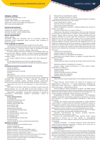 WWW.GHIDULPRIMARIILOR.RO JUDE%u021aUL ARAD / 53ORA%u0218UL LIPOVA Adres%u0103: Nicolae B%u0103lcescu, nr. 26Cod po%u0219tal: 315400Telefon: 0257-561133; Fax: 0257-563067; Adresa de e-mail: contact@primarialipova.roURL: www.primarialipova.roPersoane din primarie:Primar: Florin Fabius%u00a0Pera%u00a0Viceprimar: Adrian%u00a0 Cristian AntocheSecretar General:%u00a0 Corina C%u0103t%u0103lina%u00a0Pop%u00a0Contabil: Camelia%u00a0BlidariSate %u00een administra%u021bie:Radna, %u015eoimo%u015fSuprafa%u021ba:%u00a0 13400 ha; Intravilan:%u00a0 901 ha; Extravilan:%u00a0 12499 ha; Popula%u021bia:%u00a0 10313; Gospod%u0103rii:%u00a0 3493; Locuin%u021be:%u00a0 4169; Gr%u0103dini%u021be:%u00a0 5; %u0218coli:%u00a03; Licee:%u00a02; Cum se ajunge in localitate:%u00cen jude%u0163ul Arad, Lipova ocup%u0103 o pozi%u021bie central-sudic%u0103.Lipova este traversat%u0103 de dou%u0103 c%u0103i de comunica%u0163ie importante: Drumul Na%u0163ional 7, situat pe malul drept al Mure%u015fului %u015fi Calea Ferat%u0103 Arad - Radna - Simeria - Bra%u015fov - Bucure%u015fti.Pe malul st%u00e2ng al Mure%u015fului se afl%u0103 Drumul Jude%u0163ean 682, care trece prin Arad - Z%u0103brani - Lipova - Usus%u0103u, continu%u00e2nd spre F%u0103getDin Usus%u0103u se desprinde Drumul Comunal 83, spre Belotin%u0163 - Laba%u015fin%u0163 - BataDin Lipova pleac%u0103 Drumul Jude%u0163ean 572 spre %u015ei%u015ftarov%u0103%u0163 - LugojDin Dorgo%u015f pleac%u0103 Drumul Comunal 85 spre P%u0103t%u00e2r%u015fLipova se afla la 30 de kilometri est fa%u0163%u0103 de Capitala jude%u0163ului - AradActivitati economice si specifice zonei:Industria u%u015foar%u0103Industria lemnului%u00cembutelierea apei mineraleComer%u0163Agricultur%u0103 Principala resurs%u0103 a Lipovei o constituie apa mineral%u0103Societ%u0103%u0163ile comerciale , prezente pe raza ora%u015fului, desf%u0103%u015foar%u0103 activit%u0103%u0163i de %u00eembuteliere a apei minerale, produc%u0163ie de %u00eenc%u0103l%u0163%u0103minte, confec%u0163ii textile, confec%u0163ii lenjerie, prelucrarea lemnului, produc%u0163ie de subansamble electrocasnice, transport.Agricultura are %u00eenc%u0103 un rol important %u00een via%u0163a economic%u0103 a ora%u015fului.Cele 3000 ha de teren arabil sunt cultivate cu gr%u00e2u, porumb, floarea-soarelui, orz, iar cele 1900 ha de livezi produc o mare varietate de fructe, %u00een special afine, c%u0103tin%u0103, alune, struguri %u0219i mere.Majoritatea societ%u0103%u0163ilor comerciale activeaz%u0103 %u00een domeniul comer%u0163ului, alimenta%u0163iei publice, panifica%u0163iei, intern %u015fi interna%u0163ional.Firme reprezentative:PL NORIS SRLNATURANA ROMANIA SCSEVEREL ROMANIA SRLROBAC INDUSTRIES SRLALCO KRAFT SRLSC COHLINE SRLWEGLAND ALPIN SRLSC OECHSLER ROMANIA SRLSC LIPOMIN SASC APEMIN B%u0102ILE LIPOVA SRLProduc%u0103tori locali:SC LIPOMIN SASC APEMIN B%u0102ILE LIPOVA SRLProduse locale: Apa mineral%u0103 de Lipova, produse de panfica%u021bieObiective turistice:Obiective de pe raza localit%u0103%u0163ii Lipova:Cetatea %u201c%u015eOIMO%u015e%u201dBasilica %u201cMARIA RADNA%u201dSta%u0163iunea balneo-climateric%u0103 %u201cB%u0103ile Lipova%u201dBazarul Turcesc ( unic pe teritoriul rom%u00e2nesc )Biserica romano-catolic%u0103 din LipovaBiserica ortodox%u0103 %u201cAdormirea Maicii Domnului%u201d din LipovaMuzeul or%u0103%u015fenesc Lipova ( casa lui Sever Bocu )Monumentul %u201cCrucea lui Bocu%u201d ( pe Dealurile Lipovei )Podul vechi de peste Mure%u015fPia%u0163a %u0219i Parcul Libert%u0103%u0163ii din LipovaLiceul %u201cAtanasie Marinescu%u201d Lipova%u015ecoala rom%u00e2neasc%u0103 din cadrul Ansamblului Bisericii Ortodoxe %u201cAdormirea Maicii Domnului%u201d din LipovaLiceul %u201cSever Bocu%u201d LipovaCasa de cultur%u0103 a ora%u0219ului LipovaMonumentul Eroilor Rom%u00e2niSediul Pompierilor Voluntari ( cl%u0103direa dateaz%u0103 din secolul al XIX-lea, anul 1867 )Crucea lui Sever Bocu ( Crucea lui Bocu )Cl%u0103direa tip %u201cSeccesion%u201d ast%u0103zi sediu al Centrului de Informare %u015fi Promovare Turistic%u0103 Lipova - situat%u0103 %u00een zona central%u0103 a ora%u015fului, aceast%u0103 cl%u0103dire, al%u0103turi de alte c%u00e2teva cl%u0103diri emblematice ale ora%u015fului, prezint%u0103 un anumit gen de %u201cmanierism%u201d unul specific sf%u00e2r%u015fitului de veac trecut %u015fi celui urm%u0103tor. Nici una dintre aceste cl%u0103diri, %u00een care se pot identifica ecouri de art%u0103 secesionist%u0103, nu prezint%u0103 tr%u0103s%u0103turi comune, fiecare din ele ata%u015f%u00e2ndu-se la un alt model din repertoriul de forme al acestuia. O parte dintre aceste cl%u0103diri sunt %u00eentrebuin%u0163ate ca spa%u0163ii comerciale, bibliotec%u0103 sau chiar locuin%u0163e, %u00een prezent, dar exist%u0103 %u015fi c%u00e2teva cl%u0103diri de acest gen care %u00eenc%u0103 nu sunt utilizate sau renovate, %u00een ciuda arhitecturii unice pe care o au.Obiective din %u00eemprejurimi:Castelul regal de la S%u0103v%u00e2r%u015finPe%u015ftera lui Du%u0163u ( %u00een apropiere de S%u0103v%u00e2r%u015fin )Rezerva%u0163ia locul fosilier Z%u0103bal%u0163 ( se g%u0103sesc molu%u015fte fosile din Pon%u0163ianul mediu )Cetatea %u015eiriaCastelul Bohu%u015f ( %u015eiria, actualmente Muzeul Memorial din %u015eiria )M%u0103n%u0103stirea Bizere ( localitatea Frumu%u015feni )Muzeul %u201cAdam Muller-Guttenbrunn %u015fi Casa Adam MullerGuttenbrunn%u00a0( Z%u0103brani )Castelul Salbek-Pietri%u015fCastelul ConopCastelul Konopy-Kaloman (Odvo%u015f)Castelul Teleki din C%u0103p%u00e2lna%u015fCastelul Mocioni din BulciEvenimente:Zilele Ora%u015fului Lipova (organizate %u00een luna septembrie a fiec%u0103rui an)T%u00e2rgul Bianual %u201eMaria Radna%u201d (%u00een zilele de 15 August %u015fi 8 septembrie, %u00een fiecare an %u2013 cu ocazia s%u0103rb%u0103torilor religioase de Adormirea Maicii Domnului %u2013 %u201eSf%u00e2nta Maria Mare%u201d %u015fi Na%u015fterea Maicii Domnului %u2013 %u201eSf%u00e2nta Maria Mic%u0103%u201d)Hramul Bisericii %u201eSfin