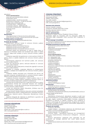 552 / JUDE%u021aUL NEAM%u021a WWW.GHIDULPRIMARIILOR.ROapiculturaFirme reprezentative:CASA DE AJUTOR RECIPROV VENUSProduc%u0103tori locali:COMAN ELENA %u2013 FLORI %u0218I LEGUMEBURGHELIA CRISTINA %u2013 FLORI %u0218I LEGUMEMOISEI DELIA-BR%u00c2NZETURIALUPOAIE NELA %u2013 BR%u00c2NZETURIALUPOAIE LENUTA %u2013 BR%u00c2NZETURIALUPOAIE GHEORGHITA - BR%u00c2NZETURI Produse locale:LEGUMEFLORIBR%u00c2NZETURIEvenimente:T%u00e2rg s%u0103ptam%u00e2nal: %u00een fiecare duminica diminea%u021baZiua comunei Oniceni: a doua duminic%u0103%u00a0din luna iulieFacilit%u00e3%u0163i oferite investitorilor:Impozit 0 pentru diferite perioade de timpProiecte de investi%u0163ii:Modernizare drumuri locale %u00een comuna Oniceni, jude%u021bul Neam%u021b%u00a0pe o lungime de 8.5kmReabilitare %u0218coala Gimnazial%u0103%u00a0PietrosuReabilitare %u0218coala Primara Valea EneiReabilitare %u0218coala Gimnazial%u0103%u00a0Comuna Oniceni%u00cenfiin%u021bare sistem de alimentare cu ap%u0103%u00a0 %u00een satele Solca %u0219i Pietrosu %u0219i %u00eenfiint%u021bare sistem de canalizare ape uzate %u00een satele Oniceni, Valea Enei Linsesti %u0219i lunca, comuna Oniceni, jude%u021bul Neam%u021bCre%u0219terea capacit%u0103%u021bii de gestionare a crizei sanitare COVID-19 pentru elevii %u0219i cadrele didactice din comuna Oniceni jude%u021bul Neam%u021bEficientizarea sistemului de iluminat public, din comuna Oniceni, jude%u021bul Neam%u021bSta%u021bii de re%u00eenc%u0103rcare pentru vehicule electrice %u00een comuna Oniceni, jude%u021bul Neam%u021bAchizi%u021bie de utilaj mobil pentru situa%u021bii de urgen%u021b%u0103%u00a0%u00een comuna Oniceni, jude%u021bul Neam%u021bDotarea cu mobilier, materiale didactice %u0219i echipamente digitale a unit%u0103%u021bilor de %u00eenv%u0103%u021b%u0103m%u00e2nt din comuna Oniceni, jude%u021bul Neam%u021bCresterea calit%u0103%u021bii educa%u021biei prin %u00eenfiin%u021barea de servicii de educa%u021bie timpurie complementare %u00een comuna Oniceni, jude%u021bul Neam%u021b%u00a0(cre%u0219%u0103%u00a0la Poiana Humei pentru satul Solca)Cre%u0219terea eficien%u021bei energetice a cl%u0103dirii publice, corp c1, %u00een comuna Oniceni, jude%u021bul Neam%u021b (reabilitare prim%u0103rie veche; va func%u021biona Eviden%u021ba popula%u021biei %u201ebuletine%u201d %u0219i biblioteca)Achizi%u021bia de microbuze electrice %u0219i sta%u021bii de %u00eenc%u0103rcare %u00een cadrul parteneriatului format din comunele Oniceni, Ion Creang%u0103 %u0219i%u00a0Valea%u00a0Ursului - Lucr%u0103ri de construire parc de joac%u0103%u00a0pentru copii, comuna Oniceni, jude%u021bul Neam%u021bLucr%u0103ri de construire sistem fotovoltaic, (51.5Kw) corp C2, comuna Oniceni, jude%u021bul Neam%u021b%u0218coala Oniceni, %u0218coala Viitorului, (excursii, activitati remediale %u2013 ore suplimentare, dotari, catalog electronic, amenajari etc) prin Programului Na%u021bional pentru Reducerea Abandonului %u0218colar (PNRAS)Sisteme integrate de colectare %u0219i valorificare a gunoilui de grajd %u00een comuna Oniceni, jude%u021bul Neam%u021bCOMUNA P%u0102STR%u0102VENICod po%u0219tal: 617300Telefon: 0233-783005; Fax: 0233-783005; Adresa de e-mail: pastraveni@nt.e-adm.roURL: www.pastraveni.roCOMUNA P%u00c2NCE%u015eTICod po%u0219tal: 17366Telefon: 0233-764766; Fax: 0372-700600; Adresa de e-mail: primariapancesti@gmail.comURL: http://www.primariapancesti.ro/COMUNA P%u00c2NG%u0102RA%u0162IAdres%u0103: strada P%u00e2ng%u0103r%u0103ciorCod po%u0219tal: 617305Telefon: 0233-240317; Fax: 0233- 240317; Adresa de e-mail: secretariat@pangarati.roURL: www.pangarati.roPersoane din primarie:Primar: Cristinel%u00a0%u00a0Croitoriu%u00a0Viceprimar: Bordea Alexandru LunguSecretar General: Gabriel%u00a0 Antoniu%u00a0Contabil: Elena StroiaSate %u00een administra%u021bie:P%u00eeng%u0103r%u0103cior, Stejaru, Oan%u0163u, P%u00eeng%u0103ra%u0163i, Preluca, PoianaSuprafa%u021ba:%u00a0 12166 ha; Intravilan:%u00a0 1231 ha; Extravilan:%u00a0 10935 ha; Popula%u021bia:%u00a0 5385; Gospod%u0103rii:%u00a0 3433; Locuin%u021be:%u00a0 1847; Gr%u0103dini%u021be:%u00a0 4; %u0218coli:%u00a03; Cum se ajunge in localitate:Pe Drumul Na%u021bional 15 la 15 KM distan%u021b%u0103 din Piatra Neam%u021b sau dinspre Bicaz distan%u021b%u0103 de 13 KM.Activitati economice si specifice zonei:Exploatarea %u0219i prelucrarea lemnuluiAgricultur%u0103Producerea de energie electric%u0103Cre%u0219terea animalelorApicultur%u0103Meste%u0219ug%u0103ritFirme reprezentative:NORD ARIN INTERNATIONALS.C. ORNAMENT SRLS.C. HIDROELECTRICAGENERAL ENERGETICProduc%u0103tori locali:COZMA MARINELANEDELCU IZABELA,ASOCIA%u021aIA CRESC%u0102TORILO DE ANIMALE P%u00c2NG%u0102RATIProduse locale:MIEREA DE ALBINEFRUCTE DE P%u0102DUREBRANZ%u0102 DE OAIELAPTEMe%u0219te%u0219ugari:R%u0102ZVAN ALEXANDRUHOPE%u021a DUMITRU BUTUNOI GHEORGHEObiective turistice:Lacul P%u00e2ng%u0103ratiM%u0103n%u0103stirea P%u00e2ng%u0103ra%u021bi CastelEvenimente:Festivalul de folclor %u0219i dansuriFestival de datini %u0219i obiceiuri de iarn%u0103Facilit%u00e3%u0163i oferite investitorilor:OPORTUNIT%u0102%u021aI DE AFACERI:PEISAJELE FRUMOASE %u00ceN SPECIAL %u00ceN APROPIAREA LACULUI , PAJI%u0218TI BINE %u00ceNTRE%u021aINUTEFACILITATI:Dezvoltarea infrastructurii, dezvoltare social%u0103%u00a0 %u0219i rural%u0103 care se concentreaz%u0103%u00a0pe un %u00eentreg sistem: de la utilizarea sistemelor de ap%u0103, iriga%u021bii, canalizare, %u00eembun%u0103t%u0103%u021biri funciare, conexiune excelent%u0103 la internet cu diferite companii, %u0219coli moderne %u0219i utilate cu tehnologie de ultim%u0103 generat%u021be, atragerea de investi%u021bii cu fonduri europene %u00een permanent%u0103 continuitate, dispensare %u0219i gr%u0103dini%u021be standard europeanProiecte de investi%u0163ii:Proiecte %u00een derulare :Anghel Saligny %u2013 extinderea sistemului de distribu%u021bie gaze naturale %u00een comuna P%u00e2ng%u0103ra%u021bi %u0219i satele %u00eenvecinateModernizare DC 143- P%u00e2ng%u0103r%u0103ciorIluminat PNRR %u2013 dezvoltarea 