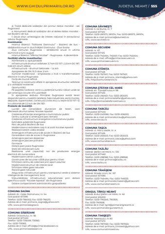 WWW.GHIDULPRIMARIILOR.RO JUDE%u021aUL NEAM%u021a / 555d. Troi%u0163%u0103 dedicat%u0103 solda%u0163ilor din primul r%u0103zboi mondial - sat Ruginoasa%u00a0e. Monument dedicat solda%u0163ilor din al doilea r%u0103zboi mondial - sat Bozienii de Sus%u00a0 f. Dou%u0103 situri arheologice de interes na%u0163ional %u00een extravilanul satului Ruginoasa.Evenimente:Hramul Bisericii %u201c%u00cen%u0103l%u021barea Domnului%u201d - Bozienii de Sus - s%u0103rb%u0103torit%u0103 anual %u00een ziua %u00cen%u0103l%u0163%u0103rii Domnului - Ziua EroilorZiua comunei Ruginoasa - s%u0103rb%u0103torit%u0103 anual %u00een ultima duminic%u0103 a lunii augustHramul Bisericii %u201cSf%u00e2ntul Nicolae%u201d - Ruginoasa - 6 decembrieFacilit%u00e3%u0163i oferite investitorilor:Alimentare cu ap%u0103 potabil%u0103%u00a0Infrastructur%u0103 drumuri asfaltate: 3,7 km DJ 157 I, 2,5 km DC 187, 0,65 km drum s%u0103tesc%u00a0Infrastructur%u0103 %u2013 drumuri betonate %u2013 1,4 km%u00a0Apropierea de DN 15 D doar 2 km%u00a0Iluminat modernizat - amplasarea a %u00eenc%u0103 4 transformatoare electrice %u00een satul Ruginoasa%u00a0For%u0163%u0103 de munc%u0103 ieftin%u0103%u00a0 Terenuri %u015fi construc%u0163ii aflate %u00een aproperea drumurilor asfaltate %u015fi a utilit%u0103%u0163ilor existente.Oportunit%u0103%u021bi:%u00a0Pe paji%u0219tea%u00a0Corboaia: zon%u0103 cu poten%u021bial turistic ridicat unde se pot amenaja circuite ATV, paintball%u00cen apropierea sediului Prim%u0103riei Ruginoasa exist%u0103 teren disponibil pentru investi%u021bii (ateliere, hale industriale, sec%u021bii montaj, depozite, supermarket, construc%u021bii civile, etc) cu ie%u0219ire la DJ 157 I %u0219i la o distan%u021b%u0103 de 2,2 km de DN 15DProiecte de investi%u0163ii:Lucr%u0103ri de consolidare alunecare de teren, care afecteaz%u0103%u00a0drumul satesc Nicolae ApostolCre%u0219terea eficien%u021bei energetice a iluminatului publicCentru cultural %u0219i amenajare parc tematicCre%u0219terea infrastructurii energetice a iluminatului publicExtindere gr%u0103dini%u021b%u0103%u00a0RuginoasaParc de joac%u0103 Bozienii de SusModernizare %u0219i extindere corp A al %u0219colii Nicolae ApostolRealizare sistem video stradalAmenajare infrastructura de acces %u00een Bozienii de SusConsolidare cale de acces %u00een RuginoasaAmenajare parcare dispensarAmenajare parcare prim%u0103rieFarmacieDotare parc joaca RuginoasaSta%u021bii de re%u00eenc%u0103rcare autoRealizarea unei capacita%u021bi%u00a0 noi de producere energie electric%u0103%u00a0din surse solareModernizare c%u0103min culturalConstruirea de locuinte nZEB plus pentru tineri%u00cenfiin%u021bare centru de colectare prin aport voluntarModernizare drumuri de interes local%u00cenfiin%u021bare re%u021bea gaze naturaleRacord gaze naturaleAsigurarea infrastructurii pentru transportul verde %u0219i sisteme inteligente de management local%u00cembun%u0103t%u0103%u021birea infrastructurii educationale prin dotare specifica a %u0219colii %u2018%u2019Nicolae Apostol%u2019%u2019 din RuginoasaDotare compartiment administrativ gospod%u0103rescCOMUNA SAGNAAdres%u0103: str. Calea Romanului, nr. 54Cod po%u0219tal: 617395Telefon: 0233-766002; Fax: 0233-766213; Adresa de e-mail: primaria_sagna@yahoo.comURL: www.primariasagna.roCOMUNA S%u0102B%u0102OANIAdres%u0103: Orizontului, nr. 56Cod po%u0219tal: 617400Telefon: 0233-735009, 735183; Fax: 0233-735183; Adresa de e-mail: office@primariasabaoani.roURL: www.primariasabaoani.roCOMUNA S%u0102VINE%u015eTIAdres%u0103: G-ral Buni%u015f, nr. 7Cod po%u0219tal: 617410Telefon: 0233-281573, 281574; Fax: 0233-281573, 281574; Adresa de e-mail: primaria@savinesti.roURL: www.savinesti.roCOMUNA SECUIENIAdres%u0103: nr. 67Cod po%u0219tal: 617415Telefon: 0233-745004, 745001; Fax: 0233-745004; Adresa de e-mail: office@primariasecuieni.roURL: www.primariasecuieni.roCOMUNA ST%u0102NI%u0162ACod po%u0219tal: 617425Telefon: 0233-767501; Fax: 0233-767501; Adresa de e-mail: primaria_stanita@yahoo.comURL: http://comunastanita.roCOMUNA %u015eTEFAN CEL MAREAdres%u0103: str. Trandafirului,nr 58Cod po%u0219tal: 617435Telefon: 0233-292001; Fax: 0233-292001; Adresa de e-mail: primariastefan@yahoo.comURL: http://primariastefancelmare.roCOMUNA TARC%u0102UCod po%u0219tal: 617445Telefon: 0233-240066; Fax: 0233-206253; Adresa de e-mail: primariatarcau@yahoo.comURL: www.tarcau.roCOMUNA TA%u015eCAAdres%u0103: Lt. Mitru Vasile, nr. 4Cod po%u0219tal: 617455Telefon: 0233-255023; Fax: 0233-255023; Adresa de e-mail: primaria_tasca@yahoo.comURL: www.comunatasca.roCOMUNA TAZL%u0102UAdres%u0103: %u015etefan cel Mare, nr. 130Cod po%u0219tal: 617460Telefon: 0233-298168; Fax: 0233-298168; Adresa de e-mail: primaria@tazlau.roURL: www.tazlau.roCOMUNA T%u0102M%u0102%u015eENIAdres%u0103: Strada Unirii, Nr. 157Cod po%u0219tal: 617085Telefon: 0233-749494; Fax: 0233-749333; Adresa de e-mail: primariatamaseni@yahoo.comURL: www.comunatamaseni.roORA%u0218UL T%u00c2RGU NEAM%u0162Adres%u0103: B-dul %u015etefan cel Mare, nr. 62Cod po%u0219tal: 615200Telefon: 0233-790245, 790305; Fax: 0233-790508; Adresa de e-mail: tgnt@primariatgneamt.roURL: www.primariatarguneamt.roCOMUNA TIMI%u015eE%u015eTIAdres%u0103: Neam%u0163ului, nr.83Cod po%u0219tal: 617470Telefon: 0233-787050; Fax: 0233-787050; Adresa de e-mail: primaria_timisesti@yahoo.comURL: www.comunatimisesti.eu