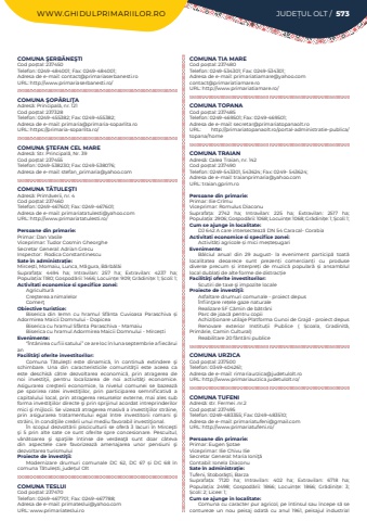 WWW.GHIDULPRIMARIILOR.RO JUDE%u021aUL OLT / 573COMUNA %u015eERB%u0102NE%u015eTICod po%u0219tal: 237450Telefon: 0249-484001; Fax: 0249-484001; Adresa de e-mail: contact@primariaserbanesti.roURL: http://www.primariaserbanesti.ro/COMUNA %u015eOP%u00c2RLI%u0162AAdres%u0103: Principal%u0103, nr. 121Cod po%u0219tal: 237328Telefon: 0249-455382; Fax: 0249-455382; Adresa de e-mail: primaria@primaria-soparlita.roURL: https://primaria-soparlita.ro/COMUNA %u015eTEFAN CEL MAREAdres%u0103: Str. Principal%u0103, Nr. 39Cod po%u0219tal: 237455Telefon: 0249-538230; Fax: 0249-538076; Adresa de e-mail: stefan_primaria@yahoo.comCOMUNA T%u0102TULE%u015eTIAdres%u0103: Prim%u0103verii, nr. 4Cod po%u0219tal: 237460Telefon: 0249-467601; Fax: 0249-467601; Adresa de e-mail: primariatatulesti@yahoo.comURL: http://www.primariatatulesti.ro/Persoane din primarie:Primar: Dan Vasile%u00a0Viceprimar: Tudor Cosmin GheorgheSecretar General:%u00a0Adrian Grecu%u00a0Inspector: %u00a0Rodica Constantinescu%u00a0Sate %u00een administra%u021bie:Mirce%u0219ti, Momaiu, Lunca, M%u0103gura, B%u0103rb%u0103l%u0103iSuprafa%u021ba:%u00a0 4494 ha; Intravilan:%u00a0 257 ha; Extravilan:%u00a0 4237 ha; Popula%u021bia:%u00a01180; Gospod%u0103rii:%u00a01466; Locuin%u021be:%u00a0909; Gr%u0103dini%u021be:%u00a01; %u0218coli:%u00a01; Activitati economice si specifice zonei:Agricultur%u0103Cre%u015fterea animalelorComer%u0163%u00a0Obiective turistice:Biserica din lemn cu hramul Sf%u00e2nta Cuvioasa Paraschiva %u0219i Adormirea Maicii Domnului - DopiceaBiserica cu hramul Sf%u00e2nta Paraschiva - MamaiuBiserica cu hramul Adormirea Maicii Domnului - Mirce%u0219tiEvenimente:%u201c%u00cent%u00e2nirea cu fiii satului%u201d ce are loc %u00een luna septembrie a fiec%u0103rui anFacilit%u00e3%u0163i oferite investitorilor:Comuna T%u0103tule%u015fti este dinamic%u0103, %u00een continu%u0103 extindere %u015fi schimbare. Una din caracteristicile comunit%u0103%u0163ii este aceea ca este deschis%u0103 c%u0103tre dezvoltarea economic%u0103, prin atragerea de noi investi%u0163ii, pentru localizarea de noi activit%u0103%u0163i economice. Asigurarea cre%u015fterii economice, la nivelul comunei se bazeaz%u0103 pe sporirea ratei investi%u0163iilor, prin participarea semnificativ%u0103 a capitalului local, prin atragerea resurselor externe, mai ales sub forma investi%u0163iilor directe %u015fi prin sprijinul acordat intreprinderilor mici %u015fi mijlocii. Se vizeaz%u0103 atragerea masiv%u0103 a investi%u0163iilor str%u0103ine, prin asigurarea tratamentului egal %u00eentre investitorii romani %u015fi str%u0103ini, %u00een condi%u0163iile cre%u0103rii unui mediu favorabil investi%u0163ional.%u00cen scopul dezvolt%u0103rii pisciculturii se ofer%u0103 3 lacuri %u00een Mirce%u015fti %u015fi 5 prin alte sate ce sunt oferite spre concesionare. Pescuitul, v%u00e2n%u0103toarea %u015fi spa%u0163iile %u00eentinse de verdea%u0163%u0103 sunt doar c%u00e2teva din aspectele care favorizeaz%u0103 amenajarea unor pensiuni %u015fi dezvoltarea turismuluiProiecte de investi%u0163ii:Modernizare drumuri comunale DC 62, DC 67 %u0219i DC 68 %u00een comuna T%u0103tule%u0219ti, jude%u021bul OltCOMUNA TESLUICod po%u0219tal: 237470Telefon: 0249-467701; Fax: 0249-467788; Adresa de e-mail: primateslui@yahoo.comURL: www.primariateslui.roCOMUNA TIA MARECod po%u0219tal: 237480Telefon: 0249-534301; Fax: 0249-534301; Adresa de e-mail: primariatiamare@yahoo.comcontact@primariatiamare.roURL: http://www.primariatiamare.ro/COMUNA TOPANACod po%u0219tal: 237485Telefon: 0249-469501; Fax: 0249-469501; Adresa de e-mail: secretar@primariatopanaolt.roURL: http://primariatopanaolt.ro/portal-administratie-publica/topana/homeCOMUNA TRAIANAdres%u0103: Calea Traian, nr. 142Cod po%u0219tal: 237490Telefon: 0249-543301, 543624; Fax: 0249- 543624; Adresa de e-mail: traianprimaria@yahoo.comURL: traian.gprim.roPersoane din primarie:Primar: Ilie Cr%u00eemuViceprimar: Romulus Diaconu%u00a0Suprafa%u021ba:%u00a0 2742 ha; Intravilan:%u00a0 225 ha; Extravilan:%u00a0 2517 ha; Popula%u021bia:%u00a02906; Gospod%u0103rii:%u00a01068; Locuin%u021be:%u00a01068; Gr%u0103dini%u021be:%u00a01; %u0218coli:%u00a01; Cum se ajunge in localitate:DJ 642 A care intersecteaz%u0103 DN 54 Caracal- CorabiaActivitati economice si specifice zonei:Activit%u0103%u021bi agricole %u0219i mici me%u0219te%u0219ugariEvenimente:B%u00e2lciul anual din 29 august- la eveniment particip%u0103 toat%u0103 localitatea deoarece sunt prezen%u021bi comercian%u021bi cu produse diverse precum %u0219i interpre%u021bi de muzic%u0103 popular%u0103 %u0219i ansamblul local dubla%u021bi de alte forme de distrac%u021bieFacilit%u00e3%u0163i oferite investitorilor:Scutiri de taxe %u015fi impozite localeProiecte de investi%u0163ii:Asfaltare drumuri comunale - proiect depus%u00cenfiin%u0163are re%u021bele gaze naturaleRealizare SF C%u0103min de b%u0103tr%u00e2niParc de joac%u0103 pentru copiiAchizi%u021bionare utilaje Platforma Gunoi de Grajd - proiect depusRenovare exterior Institu%u021bii Publice ( %u0218coala, Gradinit%u0103, Prim%u0103rie, Camin Cultural)Reabilitare 20 f%u00e2nt%u00e2ni publiceCOMUNA URZICACod po%u0219tal: 237500Telefon: 0349-404261; Adresa de e-mail: rimariaurzica@judetulolt.roURL: http://www.primariaurzica.judetulolt.ro/COMUNA TUFENIAdres%u0103: str. Fermei .nr.2Cod po%u0219tal: 237495Telefon: 0249-483355; Fax: 0249-483510; Adresa de e-mail: primariatufeni@gmail.comURL: http://www.primariatufeni.ro/Persoane din primarie:Primar: Eugen %u015eotaeViceprimar: Ilie Chivu%u00a0IlieSecretar General: Maria Ioni%u0163%u0103Contabil: Ionela DiaconuSate %u00een administra%u021bie:Tufeni, Stobor%u0103%u015fti, BarzaSuprafa%u021ba:%u00a0 7120 ha; Intravilan:%u00a0 402 ha; Extravilan:%u00a0 6718 ha; Popula%u021bia:%u00a0 2498; Gospod%u0103rii:%u00a0 1866; Locuin%u021be:%u00a0 1866; Gr%u0103dini%u021be:%u00a0 3; %u0218coli:%u00a02; Licee:%u00a01; Cum se ajunge in localitate:Comuna cu caracter pur agricol, pe %u00eentinsul sau %u00eencepe s%u0103 se contureze un nou peisaj odat