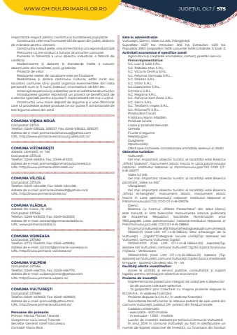 WWW.GHIDULPRIMARIILOR.RO JUDE%u021aUL OLT / 575importan%u021b%u0103 major%u0103 pentru confortul %u0219i bun%u0103starea popula%u021bieiConstruc%u021bia celei mai frumoase s%u0103li de sport din jude%u021b, obiectiv de m%u00e2ndrie pentru vi%u0219inieniConstruc%u021bia a dou%u0103 pie%u021be, una alimentar%u0103 %u0219i una agroindustrial%u0103Pietruirea cu trei straturi a tuturor drumurilor comuneiPunerea %u00een folosin%u021b%u0103 a unui obiectiv industrial, o fabric%u0103 de confec%u021bii%u00a0Modernizarea %u0219i dotarea la standarde %u00eenalte a tuturor obiectivelor din localitate, %u0219coli, gr%u0103dini%u021beProiecte de%u00a0viitor:Realizarea re%u021belei de canalizare este pe finalizareReabilitarea %u0219i dotare c%u0103minului cultural, astfel %u00eenc%u00e2t aici locuitorii comunei s%u0103-%u0219i poat%u0103 organiza evenimentele din via%u021ba personal%u0103 cum ar fi nun%u021bi, botezuri, onomastice, serb%u0103ri etc%u00a0Amenajarea parcului %u0219i a spa%u021biilor verzi ori asfaltarea drumurilorIntroducerea gazelor reprezint%u0103 un proiect ce beneficiaz%u0103 de o aten%u021bie special%u0103 pentru a putea fi materializat%u0103 c%u00e2t mai cur%u00e2ndConstruc%u021bia unui mare depozit de legume %u0219i a unei f%u0103bricu%u021be care s%u0103 proceseze aceste produse ce vor putea fi achizi%u021bionate de to%u021bi legumicultorii din zon%u0103COMUNA VI%u015eINA NOU%u0102Cod po%u0219tal: 237511Telefon: 0249-539222, 539237; Fax: 0249-539222, 539237; Adresa de e-mail: primariavisinanoua@yahoo.comURL: http://www.primariavisinanoua.judetulolt.ro/COMUNA VITOMIRE%u015eTIAdres%u0103: Libert%u0103%u021bii, nr. 146Cod po%u0219tal: 237545Telefon: 0249-469314; Fax: 0349-411005; Adresa de e-mail: primaria@primariavitomiresti.roURL: http://www.primariavitomiresti.ro/COMUNA V%u00ceLCELECod po%u0219tal: 237525Telefon: 0249-484498; Fax: 0249-484498; Adresa de e-mail: primariavilceleolt@yahoo.comURL: http://www.primariavilcele.ro/COMUNA VL%u0102DILAAdres%u0103: Str. Cozia , Nr. 204Cod po%u0219tal: 237555Telefon: 0249-543003; Fax: 0249-543003; Adresa de e-mail: contact@primariavladila.roURL: www.primariavladila.roCOMUNA VOINEASACod po%u0219tal: 237560Telefon: 0773-754500; Fax: 0349-409282; Adresa de e-mail: contact@primaria-voineasa.roURL: http://www.primaria-voineasa.ro/COMUNA VULPENICod po%u0219tal: 237565Telefon: 0249-456704; Fax: 0249-456770; Adresa de e-mail: vulpeniprimar@yahoo.comURL: http://www.primariavulpeni.ro/COMUNA VULTURE%u015eTICod po%u0219tal: 237580Telefon: 0249-469003; Fax: 0249-469003; Adresa de e-mail: primvult@yahoo.comURL: http://www.primariavulturesti.ro/Persoane din primarie:Primar: Marius Florian Trean%u021b%u0103Viceprimar: Liviu Ionu%u021b Trean%u021b%u0103Secretar General: Ionel VoiculescuContabil: Maria Bic%u0103Sate %u00een administra%u021bie:Vulture%u015fti, Dienci, Valea lui Alb, Vl%u0103ng%u0103re%u015ftiSuprafa%u021ba:%u00a0 4537 ha; Intravilan:%u00a0 306 ha; Extravilan:%u00a0 4231 ha; Popula%u021bia:%u00a02180; Gospod%u0103rii:%u00a01409; Locuin%u021be:%u00a01409; Gr%u0103dini%u021be:%u00a03; %u0218coli:%u00a03; Activitati economice si specifice zonei:Agricultura %u015fi cre%u015fterea animalelor, comer%u0163, prest%u0103ri serviciiFirme reprezentative:S.C. Luci %u015fi Iulia S.R.L.S.C. Robidex Max S.R.L.S.C. V%u00eeciu la Centru S.R.L.S.C. Felymar Damada S.R.L.S.C. Dradan S.R.L.S.C. Intim S.R.L.S.C.Gipexpress S.R.L.S.C.Marvi.S.R.L.S.C. Regiana S.R.L.S.C. Pahonie Kart Zone S.R.L.S.C. Geicu S.R.L.S.C. Terafarm Impex S.R.L.S.C. Priomarfil S.R.L.Produc%u0103tori localilI%u00a0Militaru Marin M%u0103d%u0103linProduse locale:Lapte %u015fi produse derivateCerealeFructe %u0219i legumeMe%u015fte%u015fugari:Dulgherie Oportunit%u0103%u0163i:Ofer%u0103 spre %u00eenchiriere- concesionare immobile, terenuri %u0219i cl%u0103diriObiective turistice:Vulture%u015ftiCel mai important obiectiv turistic al localit%u0103%u021bii este Biserica %u201eSfin%u0163ii Voievozi%u201d, monument istoric %u00eenscris %u00een Lista patrimoniului na%u0163ional- Institutul Na%u0163ional al Patrimoniului,poz.723 COD OTII-B-09077Valea lui AlbCel mai important obiectiv turistic al localit%u0103%u0163ii este Biserica parohial%u0103 ,,Valea lui Alb%u201dVl%u0103ng%u0103re%u015ftiCel mai important obiectiv turistic al localit%u0103%u0163ii este Biserica %u201eSfin%u0163ii Arhangheli%u201d, monument istoric, monument istoric %u00eenscris %u00een Lista patrimoniului na%u0163ional- Institutul Na%u0163ional al Patrimoniului,poz.722 COD OT-II-B-09076DienciBiserica cu hramul ,,Sf%u00e2nta Parascheva%u201d din satul Dienci este trecut%u0103 %u00een lista bisericilor monumente istorice publicat%u0103 de Academia Republicii Socialiste Rom%u00e2nia,din anul 1955,pag.88. Lista patrimoniului na%u0163ional-Institutul Na%u0163ional al Patrimoniului,poz.482 COD OT-II-B-08863%u00cen comuna Vulture%u015fti se afl%u0103 3 situri arheologice,dup%u0103 cum urmeaz%u0103:130240.01 (Cod LMI: OT-I-s-B-08544) Situl arheologic de la Vulture%u015fti - %u201eOgr%u0103zi%u201d(Categorie: locuire civil%u0103)(Tip: a%u015fezare) sat Vulture%u0219ti, comuna Vulture%u0219ti Ogr%u0103zi130240.01.01 (Cod LMI: OT-I-m-B-08544.02) A%u0219ezare(Tip: asezare sat Vulturesti, comuna Vulturesti Ogr%u0103zi Epoca bronzului mijlociu %u2013 Verbicioara130240.01.02 (Cod LMI: OT-I-m-B-08544.01) A%u0219ezare (Tip: a%u0219ezare) sat Vulture%u0219ti, comuna Vulture%u0219ti Ogr%u0103zi Epoca medieval%u0103 timpurie - Ipotesti-C%u00e2ndesti sec. IV - VIIFacilit%u00e3%u0163i oferite investitorilor:Acces la utilit%u0103%u021bi %u0219i servicii publice, consultan%u021b%u0103%u00a0 %u0219i suport logistic pentru amenajare obiective economiceProiecte de investi%u0163ii:Implementarea proiectului integrat de colectare a de%u015feurilor- 24 de puncte colectare selectiv%u0103- la gospod%u0103rii prin colectare cu ma%u015fina proiecte depuse la M.D.R.P.A.. %u00een vederea finan%u0163%u0103riiProiecte depuse la C.N.A.I. %u00een vederea finan%u021b%u0103rii: