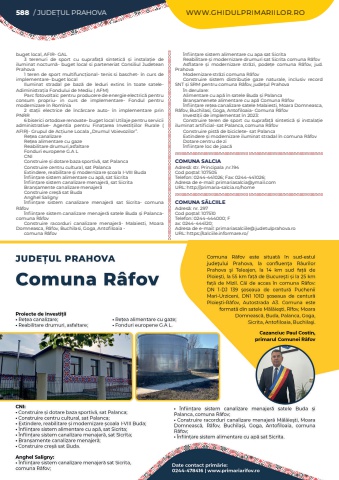 588 / JUDE%u021aUL PRAHOVA WWW.GHIDULPRIMARIILOR.RObuget local, AFIR- GAL3 terenuri de sport cu suprafa%u021b%u0103 sintetic%u0103 %u0219i instala%u021bie de iluminat nocturn%u0103- buget local si parteneriat Consiliul Judetean Prahova1 teren de sport multifunc%u021bional- tenis si baschet- %u00een curs de implementare- buget localIluminat stradal pe baz%u0103 de leduri extins %u00een toate sateleAdiministra%u021bia Fondului de Mediu ( AFM)Parc fotovoltaic pentru producere de energie electric%u0103 pentru consum propriu- in curs de implementare- Fondul pentru modernizare %u00een Rom%u00eenia2 sta%u021bii electrice de %u00eenc%u0103rcare auto- %u00een implementare prin PNRR6 biserici ortodoxe renovate- buget local Utilaje pentru servicii administrative- Agentia pentru Fina%u021barea Investi%u021biilor Rurale ( AFIR)- Grupul de Ac%u021biune Locala %u201eDrumul Voievozilor%u201d.Re%u021bea canalizareRe%u021bea alimentare cu gazeReabilitare drumuri,asfaltare Fonduri europene G.A LCNIConstruire %u0219i dotare baza sportiv%u0103, sat PalancaConstruire centru cultural, sat PalancaExtindere, reabilitare %u0219i modernizare %u0219coala I-VIII Buda%u00cenfiin%u021bare sistem alimentare cu ap%u0103, sat Sicrita%u00cenfiin%u021bare sistem canalizare menajer%u0103, sat SicritaBran%u0219amente canalizare menajer%u0103Construire cre%u0219%u0103%u00a0sat BudaAnghel Saligny%u00cenfiin%u021bare sistem canalizare menajer%u0103%u00a0 sat Sicrita- comuna R%u00e2fov%u00cenfiin%u021bare sistem canalizare menajer%u0103%u00a0satele Buda %u0219i Palancacomuna R%u00e2fovConstruire racorduri canalizare menajer%u0103- Malaiesti, Moara Domneasca, R%u00e2fov, Buchilasi, Goga, Antofiloaia -comuna R%u00e2fov%u00cenfiin%u021bare sistem alimentare cu apa sat SicritaReabilitare %u0219i modernizare drumuri sat Sicrita comuna R%u00e2fovAsflatare %u0219i modernizare str%u0103zi, pode%u021be comuna R%u00e2fov, jud. PrahovaModernizare str%u0103zi comuna R%u00e2fovConstruire sistem distribu%u021bie gaze naturale, inclusiv record SNT %u0219i SRM pentru comuna R%u00e2fov, jude%u021bul%u00a0Prahova%u00cen derulare:Alimentare cu ap%u0103%u00a0%u00een satele Buda %u0219i PalancaBran%u0219amenete alimentare cu ap%u0103%u00a0Comuna R%u00e2fov%u00cenfiin%u021bare re%u021bea canalizare satele Malaiesti, Moara Domneasca, R%u00e2fov, Buchilasi, Goga, Antofiloaia- Comuna R%u00e2fovInvesti%u021bii de implementat %u00een 2023:Construire teren de sport cu suprafa%u021b%u0103%u00a0 sintetic%u0103%u00a0 %u0219i instala%u021bie iluminat artificial- sat Palanca, comuna%u00a0R%u00e2fovConstruire pist%u0103%u00a0de biciclete- sat PalancaExtindere %u0219i modernizare iluminat stradal %u00een comuna R%u00e2fovDotare centru de zi%u00cenfiin%u021bare loc de joac%u0103COMUNA SALCIAAdres%u0103: str. Principala ,nr.194Cod po%u0219tal: 107505Telefon: 0244-441026; Fax: 0244-441026; Adresa de e-mail: primariasalcia@ymail.comURL: http://primaria-salcia.ro/homeCOMUNA S%u0102LCIILEAdres%u0103: nr. 297Cod po%u0219tal: 107510Telefon: 0244-444000; Fax: 0244-444120; Adresa de e-mail: primariasalciile@judetulprahova.roURL: https://salciile.informare.ro/