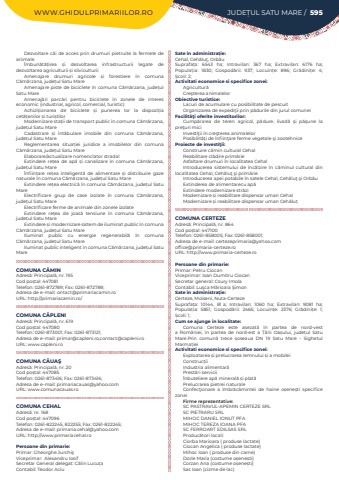 WWW.GHIDULPRIMARIILOR.RO JUDE%u021aUL SATU MARE / 595Dezvoltare c%u0103i de acces prin drumuri pietruite la fermele de animale%u00cembun%u0103t%u0103%u021birea %u0219i dezvoltarea infrastructurii legate de dezvoltarea agriculturii %u0219i silviculturiiAmenajare drumuri agricole %u0219i forestiere %u00een comuna C%u0103m%u0103rzana, jude%u021bul Satu MareAmenajare piste de biciclete %u00een comuna C%u0103m%u0103rzana, jude%u021bul Satu MareAmenaj%u0103ri parc%u0103ri pentru biciclete %u00een zonele de interes economic (industrial, agricol, comercial, turistic)Achizi%u021bionarea de biciclete %u0219i punerea lor la dispozi%u021bia cet%u0103%u021benilor %u0219i turi%u0219tilorModernizare sta%u021bii de transport public %u00een comuna C%u0103m%u0103rzana, jude%u021bul Satu MareCadastrare %u0219i %u00eent%u0103bulare imobile din comuna C%u0103m%u0103rzana, jude%u021bul Satu MareReglementarea situa%u021biei juridice a imobilelor din comuna C%u0103m%u0103rzana, jude%u021bul Satu MareElaborare/actualizare nomenclator stradalExtindere re%u021bea de ap%u0103 %u0219i canalizare %u00een comuna C%u0103m%u0103rzana, jude%u021bul Satu Mare%u00cenfiin%u021bare re%u021bea inteligent%u0103 de alimentare %u0219i distribuire gaze naturale %u00een comuna C%u0103m%u0103rzana, jude%u021bul Satu MareExtindere re%u021bea electric%u0103 %u00een comuna C%u0103m%u0103rzana, jude%u021bul Satu MareElectrificare grup de case izolate %u00een comuna C%u0103m%u0103rzana, jude%u021bul Satu MareElectrificare ferme de animale din zonele izolateExtindere re%u021bea de joas%u0103 tensiune %u00een comuna C%u0103m%u0103rzana, jude%u021bul Satu MareExtindere %u0219i modernizare sistem de iluminat public %u00een comuna C%u0103m%u0103rzana, jude%u021bul Satu MareIluminat public cu energie regenerabil%u0103 %u00een comuna C%u0103m%u0103rzana, jude%u021bul Satu Mare Iluminat public inteligent %u00een comuna C%u0103m%u0103rzana, jude%u021bul Satu MareCOMUNA C%u0102MINAdres%u0103: Principal%u0103, nr. 195Cod po%u0219tal: 447081Telefon: 0261-872789; Fax: 0261-872789; Adresa de e-mail: ontact@primariacamin.roURL: http://primariacamin.ro/COMUNA C%u0102PLENIAdres%u0103: Principal%u0103, nr. 619Cod po%u0219tal: 447080Telefon: 0261-873001; Fax: 0261-873121; Adresa de e-mail: primar@capleni.ro,contact@capleni.roURL: www.capleni.roCOMUNA C%u0102UA%u015eAdres%u0103: Principal%u0103, nr. 20Cod po%u0219tal: 447085Telefon: 0261-873416; Fax: 0261-873416; Adresa de e-mail: primariacauas@yahoo.comURL: www.comunacauas.roCOMUNA CEHALAdres%u0103: nr. 168Cod po%u0219tal: 447096Telefon: 0261-822245, 822255; Fax: 0261-822245; Adresa de e-mail: primaria.cehal@yahoo.comURL: http://www.primariacehal.roPersoane din primarie:Primar: Gheorghe%u00a0Jurchi%u015f%u00a0Viceprimar:%u00a0 Alexandru%u00a0Iosif%u00a0Secretar General delegat:%u00a0C%u0103lin%u00a0Lucu%u021ba%u00a0Contabil: Teodor AciuSate %u00een administra%u021bie:Cehal, Ceh%u0103lu%u0163, Orb%u0103uSuprafa%u021ba:%u00a0 6543 ha; Intravilan:%u00a0 367 ha; Extravilan:%u00a0 6176 ha; Popula%u021bia:%u00a0 1830; Gospod%u0103rii:%u00a0 937; Locuin%u021be:%u00a0 896; Gr%u0103dini%u021be:%u00a0 4; %u0218coli:%u00a02; Activitati economice si specifice zonei:Agricultur%u0103Cre%u015fterea animalelorObiective turistice:Lacuri de acumulare cu posibilitate de pescuitOrganizarea de expedi%u0163ii prin p%u0103durile din jurul comuneiFacilit%u00e3%u0163i oferite investitorilor:Cump%u0103rarea de teren agricol, p%u0103dure, livad%u0103 %u015fi p%u0103%u015fune la pre%u0163uri miciInvesti%u0163ii %u00een cre%u015fterea animalelorPosibilit%u0103%u0163i de %u00eenfiin%u0163are ferme vegetale %u015fi zootehniceProiecte de investi%u0163ii:Construire c%u0103min cultural CehalReabilitare cl%u0103dire prim%u0103rieAsfaltare drumuri %u00een localitatea CehalIntroducerea sistemului de %u00eenc%u0103lzire %u00een c%u0103minul cultural din localitatea Cehal, Ceh%u0103lu%u0163 %u015fi prim%u0103rieIntroducerea apei potabile %u00een satele Cehal, Ceh%u0103lu%u0163 %u015fi Orb%u0103uExtinderea de alimentarecu ap%u0103Extindere modernizare str%u0103ziModernizare %u0219i reabilitare dispensar uman CehalModernizare %u0219i reabilitare dispensar uman Ceh%u0103lu%u021b COMUNA CERTEZEAdres%u0103: Principal%u0103, nr. 864Cod po%u0219tal: 447100Telefon: 0261-858005; Fax: 0261-858001; Adresa de e-mail: certezeprimaria@yahoo.comoffice@primaria-certeze.roURL: http://www.primaria-certeze.roPersoane din primarie:Primar: Petru CiocanViceprimar: Ioan Dumitru CiocanSecretar general: Csury ImolaContabil: Lu%u015fca M%u0103rioara %u015eimonSate %u00een administra%u021bie:Certeze, Moiseni, Nuta-CertezeSuprafa%u021ba:%u00a0 10144, 81 a; Intravilan:%u00a0 1060 ha; Extravilan:%u00a0 9081 ha; Popula%u021bia:%u00a0 5851; Gospod%u0103rii:%u00a0 2465; Locuin%u021be:%u00a0 2376; Gr%u0103dini%u021be:%u00a0 1; %u0218coli:%u00a01; Cum se ajunge in localitate:Comuna Certeze este a%u0219ezat%u0103 %u00een partea de nord-vest a%u00a0 Rom%u00e2niei, %u00een partea de nord-est a %u021a%u0103rii Oa%u0219ului, jude%u021bul Satu Mare.Prin comun%u0103 trece %u0219oseaua DN 19 Satu Mare - Sighetul Marma%u021bieiActivitati economice si specifice zonei:Exploatarea %u0219i prelucrarea lemnului %u0219i a mobileiConstruc%u021biiIndustria alimentar%u0103Prest%u0103ri servicii%u00cenbuteliere ap%u0103 mineral%u0103 %u0219i plat%u0103Prelucrarea pietrei naturale Confec%u0163ionare a %u00eembr%u0103c%u0103mintei de haine o%u0219ene%u0219ti specifice zoneiFirme reprezentative:SC PASTRAVUL-APEMIN CERTEZE SRLSC PIETRARU SRLMIHOC DANIEL IONUT PFAMIHOC TEREZA IOANA PFASC FERROART EDILSAS SRLProduc%u0103tori locali:Ciorba Marioara ( produse lactate)Ciocan Angelica ( produse lactate)Mihoc Ioan ( produse din carne)Dorle Maria (costume o%u0219ene%u0219ti)Corzan Ana (costume o%u0219ene%u0219ti)Sas Ioan (cizme de lac)