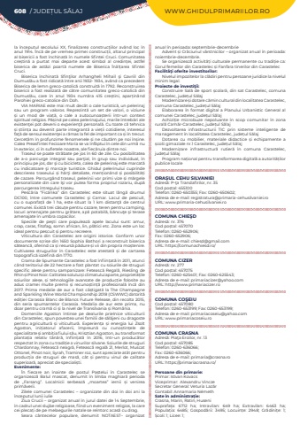 608 / JUDE%u021aUL S%u0102LAJ WWW.GHIDULPRIMARIILOR.ROla %u00eenceputul secolului XX, finalizarea construc%u021biilor av%u00e2nd loc %u00een anul 1914. %u00cenc%u0103 de pe vremea primei construc%u021bii, altarul principal al bisericii a fost %u00eenchinat%u0103 %u00een numele Sfintei Cruci. Comunitatea cre%u0219tin%u0103 a purtat mai departe acest simbol al credin%u021bei, astfel biserica de ast%u0103zi poart%u0103 numele de Biserica %u00cen%u0103l%u021barea Sfintei Cruci.Biserica %u00eenchinat%u0103 Sfin%u0163ilor Arhangheli Mihail %u015fi Gavriil din Dumusl%u0103u a fost ridicat%u0103 %u00eentre anii 1932- 1934, av%u00e2nd ca precedent Biserica de lemn greco-catolic%u0103 construit%u0103 %u00een 1792. Reconstruirea bisericii a fost realizat%u0103 de c%u0103tre comunitatea greco-catolic%u0103 din Dumusl%u0103u, care %u00een anul 1934 num%u0103ra 415 cre%u0219tini, apar%u021bin%u00e2nd Parohiei greco-catolice din Doh.VIA MARIAE este mai mult dec%u00e2t o cale turistic%u0103, un pelerinaj sau un program valoros. Reprezint%u0103 un set de valori, o viziune %u0219i un mod de via%u021b%u0103, o cale a autocunoa%u0219terii %u00eentr-un context spiritual religios. P%u0103%u0219ind pe calea pelerinajului, marile %u00eentreb%u0103ri ale existen%u0163ei pot deveni o experien%u0163%u0103 personal%u0103. Cu toate c%u0103 tehnica %u0219i %u0219tiin%u021ba au devenit parte integrant%u0103 a vie%u021bii cotidiene, interesul fa%u0163%u0103 de sensul existen%u0163ei a r%u0103mas la fel de important ca %u0219i %u00een trecut. Cercet%u0103m %u00een profunzime fenomenele %u0219i ne c%u0103ut%u0103m pe noi %u00een%u0219ine. Calea Preasfintei Fecioare Maria se va %u00eenf%u0103ptui %u00een cele din urm%u0103 nu %u00een exterior, ci %u00een sufletele noastre, ale fiec%u0103ruia dintre noi.Traseul se poate str%u0103bate pe jos %u00een 60 de zile. Cu posibilitatea de a-o parcurge integral sau par%u0163ial, %u00een grup sau individual, %u00een principiu pe jos, dar %u015fi cu bicicleta, calea de pelerinaj este marcat%u0103 cu indicatoare %u015fi marcaje turistice. Ghidul pelerinului cuprinde descrierea traseului %u0219i h%u0103r%u0163i detaliate, men%u021bion%u00e2nd %u0219i posibilit%u0103%u021bi de cazare. Parcurg%u00e2nd traseul, pelerinii vor primi vize %u0219i m%u0103rgele personalizate din care %u00ee%u015fi vor putea forma propriul rozariu, dup%u0103 parcurgerea %u00eentregului traseu.Pesc%u0103ria %u201cFic%u00e1nka%u201d din Carastelec este situat l%u00e2ng%u0103 drumul DC100, %u00eentre comunele Carastelec %u015fi Camar. Lacul de pescuit, cu o suprafa%u021b%u0103 de 1 ha, este situat la 1 km distan%u0163%u0103 de centrul comunei. Exist%u0103 trei c%u0103su%u021be pentru cazare, teren pentru camping, locuri amenajate pentru gr%u0103tare, ap%u0103 potabil%u0103, b%u0103ncu%u0163e %u015fi terase amenajate %u00een umbra copacilor.Speciile de pe%u015fti care populeaz%u0103 apele lacului sunt: amur, crap, caras, fitofag, somn african, lin, pl%u0103tici etc. Zona este un loc ideal pentru pescuit %u0219i pentru recreere.Viticultura din Carastelec are origini istorice. Conform unor documente scrise din 1650 Sophia Bathori a reconstruit biserica s%u0103teanc%u0103, oferind ca %u0219i resurs%u0103 p%u0103dure %u0219i vii din propria mo%u0219tenire. Cultivarea strugurilor %u00een Carastelec este atestat%u0103 %u0219i de cartarea topografic%u0103 iozefin%u0103 din 1770.Crama de Spumante Carastelec a fost %u00eenfiin%u021bat%u0103 %u00een 2011, atunci c%u00e2nd teritoriul de 22 hectare a fost plantat cu soiurile de struguri specific alese pentru %u0219ampanizare: Feteasc%u0103 Regal%u0103, Riesling de Rhin %u0219i Pinot Noir. Calitatea solului %u0219i climatului aparte, propriet%u0103%u021bile soiurilor alese, %u0219i tehnologiile avansate de produc%u021bie folosite au adus cramei multe premii %u0219i recuno%u0219tin%u021b%u0103 profesional%u0103 %u00eenc%u0103 din 2017. Prima medalie de aur a fost c%u00e2%u0219tigat%u0103 la The Champagne and Sparkling Wine World Championship 2018 (CSWWC) datorit%u0103 edi%u021biei Carassia Blanc de Blancs Future Release, din recolta 2015, din seria spumantelor Carassia. Medalia de aur este prima, nu doar pentru cram%u0103 ci %u0219i la nivel de Transilvania %u0219i Rom%u00e2nia. Domeniile Agoston %u00eentinse pe dealurile prielnice viticulturii din Carastelec, spun povestea unei familii de s%u0103l%u0103jeni cu dragoste pentru agricultur%u0103 %u0219i viticultur%u0103. Experien%u021ba %u0219i energia lui Zsolt Agoston, ini%u021biatorul afacerii, %u00eempreun%u0103 cu cuno%u0219tin%u021bele de specialitate %u0219i ambi%u021bia fiului s%u0103u, Krisztian Agoston, au transformat planta%u021bia relativ t%u00e2n%u0103r%u0103, %u00eenfiin%u021bat%u0103 %u00een 2016, %u00eentr-un produc%u0103tor respectat %u00een zona cu tradi%u021bie a vinurilor silvane. Soiurile de struguri Chardonnay, Feteasc%u0103 neagr%u0103, Feteasc%u0103 regal%u0103 21, Merlot, Muscat Ottonel, Pinot noir, Syrah, Traminer roz, sunt apreciate at%u00e2t pentru produc%u021bia de struguri de mas%u0103, c%u00e2t %u0219i pentru vinul de calitate superioar%u0103, apreciat de speciali%u0219ti.Evenimente:%u00cen fiecare an %u00eenainte de postul Pa%u0219telui %u00een Carastelec se organizeaz%u0103 Balul mascat, denumit %u00een limba maghiar%u0103 perioda de %u201eFarsang%u201d. Localnicii serbeaz%u0103 %u201emoartea%u201d iernii %u0219i venirea prim%u0103verii.Zilele comunei Carastelec %u2013 organizate din doi %u00een doi ani la %u00eenceputul lunii iulieZiua Crucii %u2013 organizat anual %u00een jurul datei de 14 Septembrie, %u00een cadrul unei slujbe religioase, fiind un eveniment religios, la care cei pleca%u021bi de pe melaegurile natale se re%u00eentorc acas%u0103 cu drag.Seara c%u00e2ntecelor populare, denumit NOTAEST%u2013 organizat anual %u00een perioada: septembrie-decembrie Advent %u0219i Cr%u0103ciunul v%u00e2rstnicilor %u2013 organizat anual %u00een perioada: noiembrie-decembrie. Se organizeaz%u0103 activit%u0