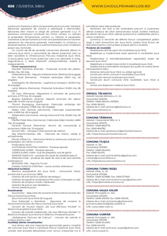 636 / JUDE%u021aUL SIBIU WWW.GHIDULPRIMARIILOR.ROconstruc%u021bii metalice %u0219i p%u0103r%u021bi componente ale structurilor metalice, fabricarea aparatelor de control %u0219i distribu%u021bie a electricit%u0103%u021bii, fabricarea altor ma%u0219ini %u0219i utilaje de utilizare general%u0103 n.c.a. %u00cen domeniul comer%u0163ului activeaz%u0103 trei firme: comer%u021b cu ridicata al produselor farmaceutice, comer%u021b cu ridicata al produselor cosmetice %u0219i de parfumerie %u0219i firme care presteaz%u0103 servicii diverse: opera%u021biuni de mecanic%u0103 general%u0103, intermedieri %u00een comer%u021bul cu produse diverse, %u00eenchirierea %u0219i sub%u00eenchirierea bunurilor imobiliare proprii sau %u00eenchiriate.Un num%u0103r de 58 de societ%u0103%u0163i comerciale dezvolt%u0103 afaceri %u00een comuna %u015eura Mic%u0103, o comunitate de afaceri puternic%u0103 care nu este racordat%u0103 la infrastructura Parcului Industrial %u015eura Mic%u0103. O bun%u0103 parte sunt firme puternice care s-au dezvoltat %u00een timp, asigur%u00e2ndu-%u015fi o baz%u0103 material%u0103 corespunz%u0103toare, stabil%u0103 %u015fi independent%u0103.Firme reprezentative:Mainetti Rom%u00e2nia (Olanda) - Produc%u0163ie articole din plastic, 26.564 mp, 120 ang.Fildas (Romania) - Depozit medicamente, 3000mp 30 angaja%u0163iPan Food (Romania) - Produse zaharoase, 2000 mp, 40 angaja%u0163iAutologistic Ro (Romania) - Logistic%u0103 %u015fi transport, 25.000 mp, 35 angaja%u0163iLacto Sibiana (Romania)- Produc%u0163ie br%u00e2nzeturi 9.000 mp, 85 angaja%u0163iOil Com (Romania) -Depozitare si activitati de prelucrare primara, 5.773 mp, 30 angaja%u0163iBogner Edelstahl (Austria)- Depozit laminate din o%u0163eluri speciale, 16.400 mp,45 angaja%u0163iThimm Packaging (Germania)- Fabrica%u0163ie ambalaje din cartoane ondulate, 47656 mp, 150 angaja%u0163iMatec CNC Technik (Germania)- Fabrica%u0163ie subansamble auto, 6.638 mp, 80 angaja%u0163iWittenstein (Germania)- Montaj mecanic%u0103 fin%u0103, 23.600 mp, 95 angaja%u0163iPfeiffer Poles Sibiu (Germania)- Fabrica%u0163ie st%u00e2lpi metalici, 6693 mp, 25 angaja%u0163iGeneral Consult (Romania)- Servicii de consultan%u0163%u0103 %u015fi proiectare, 3.656 mp, 15 angaja%u0163iSorcani SRL %u2013 transport interna%u021bional de m%u0103rfuriIllig Maschinnenbau SRL %u2013 fabricare de ma%u0219ini, utilaje %u0219i echipamenteRondo Offset S.A. - fabricarea h%u00e2rtiei %u0219i cartonului ondulat %u0219i a ambalajelor din h%u00e2rtie %u0219i cartonProduc%u0103tori locali :CIUFUDEAN DUMITRU-MARIUS - Produse apicoleTOP%u00ceRCEAN SORIN - Produse apicoleUDREA AUREL-IOAN -Ou%u0103 de prepeli%u021b%u0103, ou%u0103 de g%u0103in%u0103R%u0102SPOP IOAN-ILIE %u2013 produse din lapte de oaie(br%u00e2nzeturi)DRAGOE IOAN - produse din lapte de oaie %u0219i de vac%u0103 (lactate %u0219i br%u00e2nzeturi)BOTEANU ION %u2013 legume, fructe COM%u0218A CHIVU%u021aA-CRISTINA %u2013 carne, lactate, br%u00e2nzeturiObiective turistice:Biserica evanghelic%u0103 din %u0218ura Mic%u0103 - monument istoric (construit%u0103 %u00een jurul anului 1280)Colec%u021bia de art%u0103 sacr%u0103 %u0219i colec%u021bia de steaguriColec%u021bia etnografic%u0103 rom%u00e2neasc%u0103 P%u0103curariu Gheorghe %u0219i LidiaColec%u021bia de sculpturi Ovidiu Top%u00e2rceanColec%u021bia de picturi Ioan Br%u0103deanu Ferma vesel%u0103 RuscioriEvenimente:Ziua Eroilor %u2013 depunere de coroane la Monumentul Eroilor din Parcul Central %u0218ura Mic%u0103Ziua Comunei %u0218ura Mic%u0103 (15 August)Ziua Na%u021bional%u0103 a Rom%u00e2niei %u2013 depunere de coroane la Monumentul Eroilor din Parcul Central %u0218ura Mic%u0103Concert de muzic%u0103 clasic%u0103 %u201eDe ziua Sf%u00e2ntului Nicolae%u201d %u00een Biserica Evanghelic%u0103 %u0218ura Mic%u0103 Concert de colinde tradi%u021bionale %u201eDe ziua Sf%u00e2ntului Nicolae%u201d %u00een Biserica Ortodox%u0103 %u0218ura Mic%u0103 %u0219i %u00een Biserica Ortodox%u0103 Rusciori %u201eS%u0103rb%u0103toarea Pomului de Cr%u0103ciun%u201d - Concert de colinde %u0219i cadouri pentru copiiFacilit%u00e3%u0163i oferite investitorilor:Una dintre cele mai importante oportunit%u0103%u021bi pentru investi%u021bii ale comunei %u0218ura Mic%u0103 o constituie Parcul Industrial %u0218ura Mic%u0103, unitate care prevede dezvoltarea unor ramuri industriale noi %u0219i extinderea celor deja existente.Partenerii din %u021bar%u0103 %u0219i din str%u0103in%u0103tate precum %u0219i sus%u021binerea oferit%u0103 acestora de c%u0103tre administra%u021bia%u00a0 local%u0103 confer%u0103 mediului de afaceri din %u0218ura Mic%u0103 valen%u021be puternice %u0219i credibilitate pentru viitorii investitori. Comer%u021bul %u0219i serviciile de diferite facturi completeaz%u0103 paleta larg%u0103 a vie%u021bii economice din %u0218ura Mic%u0103, ace%u0219tia fiind factori de dezvoltare pentru comunitate, propice pentru investi%u021biiProiecte de investi%u0163ii:Reabilitarea s%u0103lii de sport din localitatea %u0218ura Mic%u0103Reabilitare %u0219i modernizare baz%u0103 sportiv%u0103 %u00een localitatea %u0218ura Mic%u0103Modernizare %u0219i extindere(dublarea capacit%u0103%u021bii) sta%u021bie de epurare %u0218ura Mic%u0103Reabilitare %u0219i modernizare str%u0103zi %u00een localitarea %u0218ura Mic%u0103Modernizare %u0219i extinderea transportului public la nivelul Zonei Metropolitane SibiuDotarea comunei %u0218ura Mic%u0103 cu utilaje agricoleConstruire c%u0103min cultural %u00een localitatea %u0218ura Mic%u0103Construire centur%u0103 ocolitoare %u0218ura Mic%u0103Construire drum comunal %u00eentre localit%u0103%u021bile %u0218ura Mic%u0103 %u0219i Rusciori Construire dispensar medical %u0218ura Mic%u0103ORA%u0218UL T%u0102LMACIUAdres%u0103: Nicolae B%u0103lcescu, nr. 24Cod po%u0219tal: 555700Telefon: 0269-555401, 555359; Fax: 0269-550101; Adresa de e-mail: primaria@talmaciu.roURL: www.talmaciu.roCOMUNA T%u00c2RNAVAAdres%u0103: 1 Decembrie 1918, nr. 5Cod po%u0219tal: 557275Telefon: 0269-806775; Fax: 0269-8067