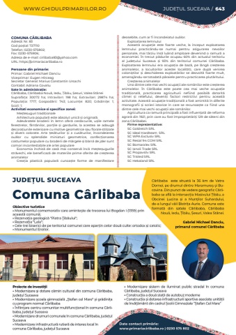 WWW.GHIDULPRIMARIILOR.RO JUDE%u021aUL SUCEAVA / 643COMUNA C%u00c2RLIBABAAdres%u0103: Nr. 83Cod po%u0219tal: 727110Telefon: 0230-575802; Fax: 0230-575906; Adresa de e-mail: cirlibaba83@yahoo.comURL: https://primariacarlibaba.roPersoane din primarie:Primar: Gabriel Michael DanciuViceprimar: Eugen H%u00eerceagSecretar General: Marius Constantin UrsachiContabil: Adriana CovaliuSate %u00een administra%u021bie:C%u00e2rlibaba, C%u00e2rlibaba Nou%u0103, Iedu, %u021aib%u0103u, %u0218esuri, Valea St%u00e2neiSuprafa%u021ba:%u00a0 30072 ha; Intravilan:%u00a0 198 ha; Extravilan:%u00a0 29874 ha; Popula%u021bia:%u00a0 1717; Gospod%u0103rii:%u00a0 743; Locuin%u021be:%u00a0 820; Gr%u0103dini%u021be:%u00a0 1; %u0218coli:%u00a01; Activitati economice si specifice zonei:Me%u0219te%u0219uguri tradi%u021bionaleArhitectura popular%u0103 este absolut unic%u0103 %u0219i original%u0103.Adev%u0103ratele broderii %u00een lemn ofer%u0103 cerdacurile, u%u0219ile ramele ferestrelor, f%u00e2nt%u00e2nilor, por%u021bile %u0219i gardurile, la acestea se adaug%u0103 decora%u021biunile exterioare cu motive geometrice sau florale stilizate %u0219i divers colorate. Arta %u021bes%u0103turilor %u0219i a cus%u0103turilor, %u00eencondeierea ou%u0103lor cu splendide miniaturi geometrice, confec%u021bionarea costumelor populare cu broderii de m%u0103rgele %u0219i blan%u0103 de jder sunt comori incontestabile ale artei populareEconomia %u00eenchis%u0103 de cas%u0103 mai conserv%u0103 %u00eenc%u0103 me%u0219te%u0219ugurile str%u0103vechi, ele beneficaz%u0103 de materiile prime oferite de cre%u0219terea animalelorCrea%u021bia plastic%u0103 popular%u0103 cunoa%u0219te forme de manifestare deosebite, cum ar fi %u00eencondeiatul ou%u0103lor.Exploatarea lemnuluiAceast%u0103 ocupa%u021bie este foarte veche, la %u00eenceput exploatarea lemnului practic%u00e2ndu-se numai pentru asigurarea nevoilor personale, mai t%u00e2rziu %u00eens%u0103 lu%u00e2nd amploare devenind o ramur%u0103 a economiei. %u00cen trecut p%u0103durile ocupau 60% din actualul teritoriu al jude%u021bului Suceava %u0219i 93% din teritoriul comunei C%u00e2rlibaba. Exploatarea lemnului era ocupa%u021bia de baz%u0103, pe l%u00e2ng%u0103 cre%u0219terea animalelor, a locuitorilor acestei localit%u0103%u021bi, care dup%u0103 venirea coloni%u0219tilor %u0219i deschiderea exploat%u0103rilor se dezvolt%u0103 foarte mult, amenaj%u00e2ndu-se totodat%u0103 p%u00e2raiele pentru practicarea plut%u0103ritului.Cre%u0219terea animalelorUna dintre cele mai vechi ocupa%u021bii ale rom%u00e2nilor este cre%u0219terea animalelor. %u00cen C%u00e2rlibaba este poate cea mai veche ocupa%u021bie tradi%u021bional%u0103, practicarea agriculturii nefiind posibil%u0103 datorit%u0103 climei %u0219i reliefului, deveni%u021bi factori restrictivi pentru aceast%u0103 activitate. Aceast%u0103 ocupa%u021bie tradi%u021bional%u0103 a fost amintit%u0103 %u00een diferite monografii %u0219i scrieri istorice %u00een care se recunoa%u0219te ca fiind una dintre cele mai vechi ocupa%u021bii ale rom%u00e2nilor.Agricultura ca ramur%u0103 principal%u0103 a fost influen%u021bat%u0103 de reforma agrar%u0103 din 1921, prin care au fost %u00eempropriet%u0103ri%u021bi 129 de s%u0103teni din zona C%u00e2rlibabei.Firme reprezentative:SC Goldreich SRLSC Ideal Hardteam%u00a0 SRLSC WPA Exclusiv SRLSC Resial 94 COM SRLSC Bomaralex SRLSC Ianoli Trade SRLSC Propavsilv SRLSC Tristed SRLSC Hekaland SRL