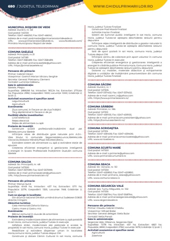 680 / JUDE%u021aUL TELEORMAN WWW.GHIDULPRIMARIILOR.ROMUNICIPIUL RO%u015eIORII DE VEDEAdres%u0103: Dun%u0103rii, nr. 58Cod po%u0219tal: 145100Telefon: 0247-466250; Fax: 0247-466141; Adresa de e-mail: postmaster@primariarosioriidevede.roURL: www.primariarosioriidevede.ro, www.facebook.com/Prim%u0103ria Municipiului Ro%u015fiorii de VedeCOMUNA SAELELEAdres%u0103: Principal%u0103, nr.31Cod po%u0219tal: 147183Telefon: 0247-358489; Fax: 0247-358489; Adresa de e-mail: primaria.saelele@yahoo.comURL: https://primariasaelele.ro/Persoane din primarie:Primar: Gabriel%u00a0C%u00e2rjan%u00a0Viceprimar: Cosmin Marian V%u0103rzaru SerghieSecretar General: Pietreanu ClementContabil: Lumini%u0163a%u00a0Od%u0103ianu%u00a0Sate %u00een administra%u021bie:S%u0103elele, Ple%u015fovSuprafa%u021ba:%u00a0 2898,98 ha; Intravilan:%u00a0 183,34 ha; Extravilan:%u00a0 2715,64 ha; Popula%u021bia:%u00a02992; Gospod%u0103rii:%u00a01000; Locuin%u021be:%u00a01000; Gr%u0103dini%u021be:%u00a02; %u0218coli:%u00a02; Activitati economice si specifice zonei:Legumicultur%u0103Agricultur%u0103Evenimente:Ziua comunei, %u00een fiecare an de ziua %u00cen%u0103l%u0163%u0103riiT%u00e2rg s%u0103pt%u0103m%u00e2nal %u00een fiecare zi de joiFacilit%u00e3%u0163i oferite investitorilor:Linie telefonic%u0103Re%u0163ea electric%u0103Re%u0163ea de alimentare cu ap%u0103Proiecte de investi%u0163ii:Construire %u0219coal%u0103 profesional%u0103-inv%u0103%u021b%u0103m%u00eent dual ,sat S%u0103elele,comuna S%u0103eleleInfiin%u021bare re%u021bea de distribu%u021bie gaze naturale prin A.D.I.-Vlea Siiului %u00een comunele SegarceaVale,Lunca,S%u0103elele,Uda Clocociov,Slobozia M%u00e2ndr%u0103,Plopii Sl%u0103vite%u0219ti,Beciu.Extindere sistem de alimentare cu ap%u0103 %u0219i extindere sta%u021bie de epurareCre%u0219terea eficien%u021bei energetice %u0219i gestionarea inteligent%u0103 a energiei %u00een %u0218coala Profesional%u0103 %u00cenv%u0103%u021b%u0103m%u00eent Dual,din comuna S%u0103eleleCOMUNA SALCIAAdres%u0103: Str. Principal%u0103, nr. 48Cod po%u0219tal: 147300Telefon: 0247-357099; Fax: 0247-357099; Adresa de e-mail: primariasalciatr@yahoo.comURL: http://www.primariasalciatr.ro/Persoane din primarie:Primar:%u00a0Marius%u00a0%u0218un%u0103%u00a0Suprafa%u021ba:%u00a0 6148 ha; Intravilan:%u00a0 437 ha; Extravilan:%u00a0 5711 ha; Popula%u021bia:%u00a0 2279; Gospod%u0103rii:%u00a0 1325; Locuin%u021be:%u00a0 1168; Gr%u0103dini%u021be:%u00a0 2; %u0218coli:%u00a01; Cum se ajunge in localitate:Din drumul na%u021bional DN 65A urm%u00e2nd drumul Jude%u021bean DJ653 direc%u021bia CringeniObiective turistice:Casa memorial%u0103 Zaharia StancuCastru mare %u0219i Castru micEvenimente:B%u00e2lciul comunal %u00een ziua de 26 octombrieProiecte de investi%u0163ii:Extindere %u015fi modernizare sistem de alimentare cu ap%u0103 potabil%u0103 %u00een sat Horia, comuna Horia, jude%u021bul Tulcea-%u00een execu%u0163ieAsfaltare str%u0103zi, modernizare alei pietonale %u0219i accese la propiet%u0103%u021bi %u00een sat Horia, comuna Horia, jude%u0163ul Tulcea-%u00een execu%u021bieReabilitare %u015fi extindere dispensar uman %u00een localiatea Horia,comuna Horia, jude%u021bul Tulcea-depus CNIConstruire %u015fi dotare C%u0103min Cultural %u00een sat Horia, comuna Horia, jude%u021bul Tulcea-finalizatConstruire Pod Moar%u0103-finalizatAchizi%u021bie tractor-finalizatSistem de iluminat public intelligent %u00een sat Horia, comuna Horia, jude%u021bul Tulcea-se a%u015fteapta deschiderea sesiunii pentru depunere%u00cenfiin%u0163are re%u0163ea inteligent%u0103 de distribu%u021bie a gazelor naturale %u00een comuna Horia, jude%u021bul Tulcea-se a%u015fteapta deschiderea sesiunii pentru depunereSal%u0103 de sport %u015fcolar%u0103 %u00een sat Horia, comuna Horia, jude%u021bul Tulcea-depus CNI%u00cenfiin%u0163are centru de colectare prin aport voluntar %u00een comuna Horia, jude%u021bul Tulcea-%u00een execu%u021bieCre%u015fterea eficien%u021bei energetice %u015fi gestionarea inteligent%u0103 a energiei %u00een cl%u0103dirile publice-Primaria Horia, Comuna Horia, jude%u021bul Tulcea-se a%u015fteapt%u0103 deschiderea sesiunii pentru depunereDotarea cu mobilier, materiale didactice %u015fi echipamente digitale a unit%u0103%u0163ilor de %u00eenv%u0103%u0163%u0103m%u00e2nt preuniversitare din comuna Horia, jude%u021bul Tulcea-finalizatCOMUNA S%u0102CENIAdres%u0103: Dun%u0103rii, nr. 1Cod po%u0219tal: 147305Telefon: 0247-337402; Fax: 0247-337402; Adresa de e-mail: saceni_tr@yahoo.comURL: https://www.primariasaceni.ro/COMUNA S%u00c2RBENIAdres%u0103: Prim%u0103riei, nr. 186Cod po%u0219tal: 147310Telefon: 0247-459105; Fax: 0247-459105; Adresa de e-mail: primariacomuneisirbeni@yahoo.comURL: https://comunasarbenitr.ro/COMUNA SCRIOA%u015eTEACod po%u0219tal: 147315Telefon: 0247-459406; Fax: 0247-459406; Adresa de e-mail: primariacomscrioastea@yahoo.comURL: www.scrioastea.roCOMUNA SCURTU MARECod po%u0219tal: 147320Adresa de e-mail: s.primarie@yahoo.comURL: www.primariascurtumare.roCOMUNA SEACAAdres%u0103: Str. Victorie, nr. 151Cod po%u0219tal: 147330Telefon: 0247-420850; Fax: 0247-420850; Adresa de e-mail: primaria_seaca@yahoo.comURL: www.comuna-seaca.roCOMUNA SEGARCEA VALEAdres%u0103: %u015eos. Turnu M%u0103gurele, nr. 102Cod po%u0219tal: 147335Telefon: 0247-358794; Fax: 0247-358794; Adresa de e-mail: primariasegarceavale@yahoo.comURL: www.segarceavale.roPersoane din primarie:Primar:%u00a0Claudiu Gabriel CheldiuViceprimar: Mihael BobeSecretar General delegat: Stela BularContabil: Nelia PanaitSate %u00een administra%u021bie:Segarcea Vale, Olteanca, Segarcea DealSuprafa%u021ba:%u00a0 7278 ha; Intravilan:%u00a0 457 ha; Extravilan:%u00a0 6821 ha; Popula%u021bia:%u00a02890; Gospod%u0103rii:%u00a02760; Locuin%u021be:%u00a01679; Gr%u0103dini%u021be:%u00a03; %u0218coli:%u00a01; Activitati economice si specifice zonei:Agricultur%u0103Zotehnie