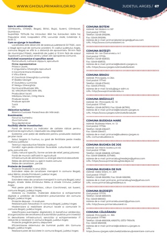 WWW.GHIDULPRIMARIILOR.RO JUDE%u021aUL ARGE%u0218 / 67Sate %u00een administra%u021bie:Gl%u00eembocelu, Chi%u021be%u015fti, Boga%u0163i, B%u00eerloi, Bujoi, Suseni, Gl%u00eembocel, DumbravaSuprafa%u021ba:%u00a0 7074,06 ha; Intravilan:%u00a0 850 ha; Extravilan:%u00a0 6224 ha; Popula%u021bia:%u00a0 4140; Gospod%u0103rii:%u00a0 2751; Locuin%u021be:%u00a0 2426; Gr%u0103dini%u021be:%u00a0 3; %u0218coli:%u00a02; Cum se ajunge in localitate:Localitatea este deservit%u0103 de %u0219oseaua jude%u021bean%u0103 DJ 702C, care o leag%u0103 spre sud de comuna Leordeni. %u00cen cadrul jude%u021bului Arge%u0219, comuna Boga%u021bi se afl%u0103 la o distan%u021b%u0103 de aproximativ 39 Km fa%u021b%u0103 de municipiul Pite%u0219ti, re%u0219edin%u021b%u0103 de jude%u021b %u0219i 13 Km fa%u021b%u0103 de ora%u0219ul Topoloveni, principalul centru urban din apropierea comunei.Activitati economice si specifice zonei:Pomicultur%u0103, cultivare c%u0103p%u0219uni, apicultur%u0103Firme reprezentative:Prisaca Laurei,II Ungureanu Gheorghe Apicultur%u0103II Ciorchin%u0103 Maria MirabelaII V%u00eelcu ElenaIF Ciorchin%u0103 Gheorghi%u021ba Lumini%u021baIF Badea GeorgelIF Du%u021bulescu Lumini%u021baIF Neagu Gheorghi%u021baFarmLand Business SRLSC VINORUM RECWIN SRLProduc%u0103tori locali:M%u0103r%u0103%u0219oiu Marian, C%u00eerlig MariaProduse locale:Produse apicole%u021auic%u0103VinObiective turistice:Biserica Cuvioasa Parascheva din M%u0103rce%u0219ti.Evenimente:Focul lui SumedruZiua ComuneiT%u00e2rg s%u0103pt%u0103m%u00e2nalFacilit%u00e3%u0163i oferite investitorilor:Fond de terenuri cu indicator de calitate ridicat pentru practicarea agriculturii, nepoluate sau degradateExisten%u021ba unei pie%u021be de desfacere pentru produsele realizate pe plan localSoluri bogate %u00een humus, cu grad de fertilitate peste media nivelului jude%u021buluiTerenuri neproductive folosite ca p%u0103%u0219uniCondi%u021bii agro-pedo-climatice favorabile culturilorde cartof , gr%u00e2u, porumb etcCadru natural specific, forme variate de relief, peisaj pitorescFor%u021b%u0103 de munc%u0103 calificat%u0103 %u00een agricultur%u0103Infrastructur%u0103 de alimentare cu energie electric%u0103 dezvoltat%u0103Re%u021bea de alimentare cu ap%u0103 %u00een toat%u0103 comuna Re%u021bea de canalizare , par%u021bial.Proiecte de investi%u0163ii:Proiecte finalizate %u00een anul 2024Extindere re%u021bea de canalizare menajer%u0103 %u00een comuna Boga%u021bi, satul B%u00e2rloi, strada Prim%u0103verii, jude%u021bul Arge%u0219Proiecte %u00een implementareExtindere re%u021bea de canaliare menajer%u0103 %u00een comuna Boga%u021bi, satul Bogati, strada Valea Zimbrului Releu %u0219i strada Crinului, jude%u021bul Arge%u0219Pod peste p%u00e2r%u00e2ul Gl%u00e2mboc, c%u0103tun Ciorchine%u0219ti, sat Suseni, comuna Boga%u0163i, jude%u0163ul Arge%u015fDotarea cu mobilier, materiale didactice %u0219i echipamente digitale a unit%u0103%u021bilor de %u00eenv%u0103%u021b%u0103m%u00e2nt preuniversitar din comuna Boga%u021bi, jude%u021bul Arge%u0219Proiecte depuse %u2013 %u00een evaluareRealizare parc fotovoltaic %u00een comuna Boga%u021bi, jude%u021bul Arge%u0219Modernizare %u0219i reabilitare drumuri locale %u0219i comunale %u00een comuna Boga%u021bi, jude%u021bul Arge%u0219Valorificarea avantajelor digitaliz%u0103rii, %u00een beneficiul cet%u0103%u021benilor, al organiza%u021biilor de cercetare %u0219i al autorit%u0103%u021bilor publice, prin investi%u021bii %u00een dezvoltarea infrastructurii, serviciilor %u0219i echipamentelor IT relevante %u0219i necesare %u00een comuna Boga%u021bi, jude%u021bul Arge%u0219Proiecte preg%u0103tite pentru depunereEficientizarea sistemului de iluminat public din Comuna Boga%u021bi, jude%u021bul Arge%u0219Realizare piste de biciclete %u00een comuna Boga%u021bi, jude%u021bul Arge%u0219COMUNA BOTENIAdres%u0103: Sat Boteni nr.157Cod po%u0219tal: 117130Telefon: 0248-295299; Fax: 0248-295299; Adresa de e-mail: primariaboteniarges@yahoo.comURL: http://www.comunaboteni.roCOMUNA BO%u0162E%u015eTIAdres%u0103: Str. Ion Diaconescu nr.1Cod po%u0219tal: 117135Telefon: 0248-658133; Fax: 0248-658133; Adresa de e-mail: primarie@botesti.cjarges.roURL: https://www.cjarges.ro/en/web/botestiCOMUNA BRADUAdres%u0103: Principala, nr.364Cod po%u0219tal: 117140Telefon: 0248-279412; Fax: 0248-279412; Adresa de e-mail: bradu@ag.e-adm.roURL: http://wwwprimariabradu.roCOMUNA BR%u0102DULE%u0162Adres%u0103: Str. Principal%u0103, Nr. 10Cod po%u0219tal: 117145Telefon: 0248-267910; Fax: 0248-267910; Adresa de e-mail: primarie@bradulet.cjarges.roURL: https://www.cjarges.ro/en/web/braduletCOMUNA BUDEASA MAREAdres%u0103: Budeasa Mare, nr. 12Cod po%u0219tal: 117156Telefon: 0248-236457; Fax: 0248-236457; Adresa de e-mail: primarie@budeasa.cjarges.roURL: comunabudeasa.roCOMUNA BUGHEA DE JOSAdres%u0103: Ion Marin Iovescu,nr.45Cod po%u0219tal: 117165Telefon: 0248-536808, 537480; Fax: 0248-536808, 537480; Adresa de e-mail: primariabugheadejos@yahoo.comURL: https://www.primariabugheadejos.ro/COMUNA BUGHEA DE SUSAdres%u0103: Valea Sili%u0219tii, nr. 229Cod po%u0219tal: 117027Telefon: 0248-555095; Fax: 0248-555095; Adresa de e-mail: primarie_primariabughea@yahoo.comURL: www.primariabugheadesus.roCOMUNA BUZOE%u015eTICod po%u0219tal: 117170Telefon: 0248-690009; Fax: 0248-690051; Adresa de e-mail: primariebuzoesti@yahoo.comURL: http://www.primariabuzoesti.roCOMUNA C%u0102LD%u0102RARUAdres%u0103: Principal%u0103, nr. 355Cod po%u0219tal: 117190Telefon: 0248-692008, 692070, 0372-793419; Fax: 0248-692008; Adresa de e-mail: primarie@caldararu.cjarges.roURL: https://www.cjarges.ro/en/web/caldararu/prezentare-comuna