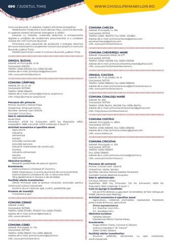 690 / JUDE%u021aUL TIMI%u0218 WWW.GHIDULPRIMARIILOR.ROComuna Bucov%u0103%u021b, %u00een vederea cre%u0219terii eficien%u021bei energeticeReabilitarea moderat%u0103 a %u0218colii Bazo%u0219u Nou, Comuna Bucov%u0103%u021b, %u00een vederea cre%u0219terii eficien%u021bei energetice a cl%u0103diriiDotarea cu mobilier, materiale didactice %u0219i echipamente digitale a unit%u0103%u021bilor de %u00eenv%u0103%u021b%u0103m%u00e2nt preuniversitar %u0219i a unit%u0103%u021bilor conexe din UAT Comuna Bucovat%u00cenfiin%u021barea unei capacit%u0103%u021bi de produc%u021bie a energiei electrice din sursa solar%u0103 pentru acoperirea consumului propriu %u00een comuna Bucov%u0103%u021b, judetul Timi%u0219Modernizare str%u0103zi rurale %u00een comuna Bucov%u0103%u021b, jude%u021bul Timi%u0219ORA%u0218UL BUZIA%u015eAdres%u0103: str.Principal%u0103 .nr.16Cod po%u0219tal: 305100Telefon: 0256-321450; Fax: 0256-321450; Adresa de e-mail: primbuzias@yahoo.comURL: www.primariabuzias.roCOMUNA C%u0102RPINI%u015eAdres%u0103: Str. III, nr. 42Cod po%u0219tal: 307090Telefon: 0256-365001; Adresa de e-mail: contact@primaria-carpinis.roURL: https://primaria-carpinis.ro/Persoane din primarie:Primar: Dumitru Marcel%u00a0Popa%u00a0Viceprimar:%u00a0Emanuel%u00a0Con%u021biuSecretar General:%u00a0Ioan%u00a0St%u00e2nil%u0103Contabil:%u00a0Crina%u00a0Dinu%u00a0Sate %u00een administra%u021bie:Iecea MIc%u0103Intravilan:%u00a0 415,18 ha; Extravilan:%u00a0 4673 ha; Popula%u021bia:%u00a0 4950; Gospod%u0103rii:%u00a01068; Locuin%u021be:%u00a03470; Gr%u0103dini%u021be:%u00a02; %u0218coli:%u00a03; Activitati economice si specifice zonei:Agricultur%u0103IndustrieAlimentar%u0103Mor%u0103ritActivit%u0103%u0163i comercialeActivit%u0103%u0163i bancareIndustria materialelor de construc%u0163iiComer%u0163Industrie alimentar%u0103Mor%u0103ritAgricultur%u0103%u00a0Obiective turistice:Pesc%u0103rie: posibilitate de pescuit sportivEvenimente:Hramul bisericii ortodoxe Sf. DumitruZilele C%u0103rpini%u015fului, %u00een prima duminic%u0103 din luna octombrieHramul bisericii ortodoxe Sf. Ilie, %u00een satul Icea Mic%u0103T%u00e2rg s%u0103pt%u0103m%u00e2nal %u00een fiecare zi de s%u00e2mb%u0103t%u0103Facilit%u00e3%u0163i oferite investitorilor:Oferta Prim%u0103riei este la terenul intravilan, extravilan pentru construc%u0163ii civile %u015fi industrialeAcces la drum na%u0163ional, ap%u0103, curent, posibilit%u0103%u0163i gazProiecte de investi%u0163ii:Canalizare %u015fi gazCOMUNA CENADAdres%u0103: nr.652Cod po%u0219tal: 307095Telefon: 0256-374501, 374507; Fax: 0256-374501; Adresa de e-mail: primaria@cenad.roURL: www.cenad.roCOMUNA CENEIAdres%u0103: Principal%u0103, nr. 134Cod po%u0219tal: 307100Telefon: 0256-366101; Fax: 0256-366416; Adresa de e-mail: primaria.cenei@cjtimis.roURL: www.primariacenei.roCOMUNA CHECEAAdres%u0103: Principal%u0103, nr. 184Cod po%u0219tal: 307102Telefon: 0256- 360373; Fax: 0256- 234862; Adresa de e-mail: primariachecea@yahoo.comsecretarchecea@yahoo.comURL: www.primariachecea.roCOMUNA CHEVERE%u015eU MAREAdres%u0103: Cheveresu Mare, Nr.277Cod po%u0219tal: 307105Telefon: 0256-415008; Fax: 0256-415008; Adresa de e-mail: primaria.cheveresumare@yahoo.comURL: www.primariacheveresumare.roORA%u0218UL CIACOVAAdres%u0103: Str. P-%u0163a Cet%u0103%u0163ii, Nr. 8Cod po%u0219tal: 307110Telefon: 0256-399600; Fax: 0256-399500; Adresa de e-mail: primariaciacova@primariaciacova.roURL: www.primariaciacova.roCOMUNA COMLO%u015eU MAREAdres%u0103: Nr. 655Cod po%u0219tal: 307120Telefon: 0256-364114, 364128; Fax: 0256-364114; Adresa de e-mail: primariacomlosumare@yahoo.comURL: http://www.comlosumare.ro/COMUNA COSTEIUAdres%u0103: Principal%u0103, nr. 282ACod po%u0219tal: 307125Telefon: 0256-326500; Fax: 0256-326500; Adresa de e-mail: primaria.costeiu@yahoo.comURL: www.costeiu.roCOMUNA CRICIOVAAdres%u0103: Principal%u0103, nr. 51ACod po%u0219tal: 307130Telefon: 0256-335807; Fax: 0256-335807; Adresa de e-mail: primaria.criciova@cjtimis.roURL: www.primariacriciova.roPersoane din primarie:Primar: Cristian Iosif%u00a0%u00a0C%u0103tan%u0103%u00a0Viceprimar: Vasile%u00a0%u00a0%u0218andorSecretar General: Denisa-Isabela Parasine%u021biContabil: Carola-Beatrice KruszliczSate %u00een administra%u021bie:Criciova, Jdioara, Cire%u015fuSuprafa%u021ba:%u00a0 5051 Ha; Intravilan:%u00a0 122 ha; Extravilan:%u00a0 4929 ha; Popula%u021bia:%u00a01563; Gr%u0103dini%u021be:%u00a03; %u0218coli:%u00a01; Cum se ajunge in localitate:De pe E70 (direc%u0219ia Lugoj spre Caransebe%u0219) se face st%u00e2nga pe DJ681 (direc%u021bia spre N%u0103drag)Activitati economice si specifice zonei:Agricultura, cre%u0219terea animalelor, exploata%u021bie forestier%u0103, prelucrarea lemnului, apicultur%u0103Firme reprezentative:S.C. Darohar-Line S.R.L. S.C. Sorideea S.R.L.Obiective turistice:Cetatea JdioaraM%u0103n%u0103stirea Sf%u00e2nta Treime Pereu%u00a0Evenimente:Ruga satelor Cire%u0219u, Criciova %u0219i JdioaraHramul m%u0103n%u0103stirii %u201cSf. Treime%u201dZilele Cet%u0103%u021bii JdioaraFacilit%u00e3%u0163i oferite investitorilor:Drumuri asfaltate, alimentare cu ap%u0103, canalizare, zon%u0103%u00a0industrial%u0103