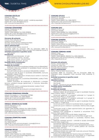 706 / JUDE%u021aUL TIMI%u0218 WWW.GHIDULPRIMARIILOR.ROCOMUNA S%u0102C%u0102LAZAdres%u0103: nr. 368Cod po%u0219tal: 307370Telefon: 0256-367101, 367491, 240201 - eviden%u0163a popula%u0163iei; Adresa de e-mail: office@sacalaz.roURL: www.primariasacalaz.roCOMUNA S%u00c2NANDREIAdres%u0103: Tineretului, nr. 70Cod po%u0219tal: 307375Telefon: 0256-383500; Fax: 0256-383806; Adresa de e-mail: office@primaria-sinandrei.roURL: https://primariasanandrei.ro/Persoane din primarie:Primar: Florin Claudiu ComanViceprimar:Iosif%u00a0 Minnich%u00a0Secretar General:Diana Andreea Muntean%u00a0Contabil: Ionica Claudia Gina Vl%u0103du%u021bSate %u00een administra%u021bie:S%u00e2nandrei, Carani, Covaci, Ias%u00a0km 13Suprafa%u021ba:%u00a0 9239 ha; Intravilan:%u00a0 580 ha; Extravilan:%u00a0 8659 ha; Popula%u021bia:%u00a05282; Gospod%u0103rii:%u00a01594; Locuin%u021be:%u00a01747; Gr%u0103dini%u021be:%u00a03; %u0218coli:%u00a03; Activitati economice si specifice zonei:Agricultur%u0103Evenimente:Zilele comunei S%u00e2nandrei - 21 iulieBalul tineretului Carani - 16 iunieRuga satului Covaci - 26 octombrieRuga satului Ias%u00a0km 13 - 20%u00a0iulieFacilit%u00e3%u0163i oferite investitorilor:Terenuri %u00een concesiuneProiecte de investi%u0163ii:%u201cRe%u021bea de canalizare %u00een localitatea CARANI, comuna S%u00ceNANDREI%u201d%u201c%u00cenfiin%u021bare re%u021bea de canalizare %u00een localitatea Covaci, comuna S%u00e2nandrei, jude%u021bul Timi%u0219%u201dExecu%u021bie re%u021bele de ap%u0103 %u0219i canalizare S%u00c2NANDREI, CARANIConstruire sal%u0103 de sport %u00een localitatea S%u00c2NANDREI, Comuna S%u00c2NANDREI, Jude%u021bul TIMI%u0218Reabilitare %u0219i modernizare infrastructur%u0103 rutier%u0103 %u00een Comuna S%u00c2NANDREI, jude%u021bul TIMI%u0218Bazin de %u00eenot didactic, Localitatea S%u00c2NANDREI, Jude%u021bul TIMI%u0218 Proiecte de viitor:%u201cSistem centralizat de producere %u0219i distribu%u021bie a energiei termice, utiliz%u00e2nd energia geotermal%u0103, %u00een Comuna S%u00e2nandrei, Jude%u0163ul Timi%u0219%u201dConstruire cre%u0219%u0103 %u00een Localitatea S%u00e2nandrei, Jude%u021bul Timi%u0219%u201dSta%u021bii %u00eenc%u0103rcare electric%u0103Solu%u021bii fotovoltaice de producere a energiei electriceCOMUNA S%u00c2NMIHAIU ROM%u00c2NAdres%u0103: Principal%u0103, nr. 1; Cod po%u0219tal: 307380Telefon: 0256-363501; Fax: 0256-363501; Adresa de e-mail: primaria@sanmihaiu.roURL: www.sinmihaiuroman.roORA%u0218UL S%u00c2NNICOLAU MAREAdres%u0103: Republicii, nr. 15Cod po%u0219tal: 305600Telefon: 0256-370366, 370340; Fax: 0256-370350; Adresa de e-mail: primaria@sannicolau-mare.romediu@sannicolau-mare.roURL: www.sannicolau-mare.roCOMUNA S%u00c2NPETRU MAREAdres%u0103: nr. 1Cod po%u0219tal: 307385Fax: 0256-376177; Adresa de e-mail: primaria.sanpetru_mare@cjtimis.roURL: https://primariasanpetrumare.ro/COMUNA SECA%u015eAdres%u0103: Principal%u0103, nr. 19Cod po%u0219tal: 307390Telefon: 0256-705002; Fax: 0256-705002; Adresa de e-mail: primariasecas@yahoo.comURL: www.primariasecas.roCOMUNA STIUCAAdres%u0103: str. Principala . nr. 111Cod po%u0219tal: 307400Telefon: 0256-335937; Fax: 0256-335711; Adresa de e-mail: primaria.stiuca@cjtimis.roURL: https://primariastiuca.ro/COMUNA %u015eAGAdres%u0103: a II-a, nr. 49Cod po%u0219tal: 307395Telefon: 0256-395368; Fax: 0256-395368; Adresa de e-mail: primaria.sag@cjtimis.roURL: www.primariasag.roCOMUNA %u015eANDRAAdres%u0103: Principal%u0103, nr. 6Cod po%u0219tal: 307065Telefon: 0256-379149; Fax: 0256-379494; Adresa de e-mail: primariasandratm@gmail.comURL: www.primariasandra.roCOMUNA TEREMIA MAREAdres%u0103: nr.559Cod po%u0219tal: 307405Telefon: 0256-380003, 380002; Fax: 0256-380003; Adresa de e-mail: primaria.teremia_mare@cjtimis.roURL: https://teremia.ro/Persoane din primarie:Primar:%u00a0 Cornel Vasile%u00a0Gui%u00a0Viceprimar: Valer RusSecretar General: Adriana%u00a0Tompo%u0219%u00a0Contabil: Raluca%u00a0BostanSate %u00een administra%u021bie:Ner%u0103u, Teremia Mare, Teremia Mic%u0103Suprafa%u021ba:%u00a0 8999 ha; Intravilan:%u00a0 633 ha; Extravilan:%u00a0 8366 ha; Popula%u021bia:%u00a0 4064; Gospod%u0103rii:%u00a0 1340; Locuin%u021be:%u00a0 1235; Gr%u0103dini%u021be:%u00a0 3; %u0218coli:%u00a05; Activitati economice si specifice zonei:Agricultur%u0103Obiective turistice:Ap%u0103 geotermal%u0103Gaz sond%u0103Muzee - viticultur%u0103, pictur%u0103, Nichita St%u0103nescuFacilit%u00e3%u0163i oferite investitorilor:Agent termicProiecte de investi%u0163ii:OBIECTIVE %u0218I INVESTI%u021aII REALIZATE:Realizare sistem de alimentare cu ap%u0103 %u00een localit%u0103%u021bile Teremia Mare %u0219i Ner%u0103u, PNDL 1 + buget localConstruire gr%u0103dini%u021b%u0103 cu program prelungit cu 3 grupe %u00een Teremia Mic%u0103, PNDL 2 + buget localConstruire gr%u0103dini%u021b%u0103 cu program prelungit cu 6 grupe %u00een Teremia Mare, PNDL 2 + buget localRealizare sistem de alimentare cu ap%u0103 %u00een localitatea Teremia Mic%u0103, PNDL 2 + buget localConstruire punct medical %u00een localitatea%u00a0Ner%u0103u, buget localConstruire punct medical %u00een localitatea%u00a0Teremia Mic%u0103, buget localContinuare lucr%u0103ri la Baza sportiv%u0103-Centru de agrement %u00een Teremia Mare, buget localRealizare PUZ reziden%u021bial %u0219i industrial %u0219i actualizare PUG Teremia Mare, buget localRepara%u021bii C%u0103minul Cultural din Ner%u0103u, buget localIdentificarea str%u0103zilor dup%u0103 noul nomenclator, buget localIluminat stradal ornamental %u00een localitatea%u00a0 Teremia Mic%u0103, buget localRepara%u021bii instala%u021bie termic%u0103 + central%u0103 la %u0218coala Gimnazial%u0103 Teremia Mare, buget localSchimbarea re%u021belei electrice %u00een comuna Teremia MareIntroducere re%u021bea fibr%u0103 internet %u00een loc alitatateaTeremia Mic%u0103Introducere internet wi-fi %u00een zonele publice ale comunei Teremia Mare, WiFi4EUOBIECTIVE %u0218I INVESTI%u021aII %u00ceN CURS:Asfaltarea str%u0103zilor din toate cele 3 sate ale comunei Teremia Mare, prin PNI 