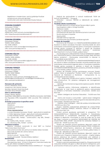 WWW.GHIDULPRIMARIILOR.RO JUDE%u021aUL VASLUI / 729Reabilitare si modernizare%u00a0 %u015fcoli %u015fi gr%u0103dini%u0163e-finalizatInfrastructura comunei-derulareConstruirea unei case memoriale Muzeul SatuluiCOMUNA DUME%u015eTICod po%u0219tal: 737235Telefon: 0235-459075; Fax: 0235-459075; Adresa de e-mail: primaria_dumesti@yahoo.comURL: https://www.primariadumesti.ro/COMUNA EPURENICod po%u0219tal: 737240Telefon: 0235-429626; Fax: 0235-429627; Adresa de e-mail: contact@primariaepureni.roURL: www.primariaepureni.roCOMUNA F%u0102LCIUCod po%u0219tal: 737245Telefon: 0235-430254; Fax: 0235-430361; Adresa de e-mail: primariafalciu@yahoo.comURL: www.primariafalciu.roCOMUNA FERE%u015eTIAdres%u0103: Principala ,FNCod po%u0219tal: 737566Telefon: 0235-708222; Fax: 0235-708222; Adresa de e-mail: primaria_feresti@yahoo.comsecretar@primariaferesti.ro, contabil@primariaferesti.roURL: www.primariaferesti.roPersoane din primarie:Primar: Sebastian ArteniViceprimar: Alin Marian ManeaSecretar General: Viorel Gavrilu%u021b%u0103Contabil: Alina Mihaela HabetSate %u00een administra%u021bie:Fere%u0219ti, Sarata, Velni%u021baSuprafa%u021ba:%u00a02466,0866 ha; Intravilan:%u00a0218,53ha; Extravilan:%u00a02247,5566 ha; Popula%u021bia:%u00a0 2178; Gospod%u0103rii:%u00a0 1499; Locuin%u021be:%u00a0 730; Gr%u0103dini%u021be:%u00a0 1; %u0218coli:%u00a01; Activitati economice si specifice zonei:Agricultur%u0103ZootehnieComer%u021b cu am%u0103nuntulConstruc%u021biiFirme reprezentative:I.I. Arteni Nicoleta Genoveva, Fere%u0219ti - agricultur%u0103 %u0219i zootehnieI.I. Trifan Speran%u021ba, Fere%u0219ti - agricultur%u0103 cultivarea plantelorI.I. Filip Andreea, Fere%u0219ti - agricultur%u0103 %u0219i zootehnieS.C. Iulcasa SRL, Fere%u0219ti - construc%u021biiS.C. Aky SRL, Fere%u0219ti - construc%u021biiS.C. Nuf%u0103rul SRL, Fere%u0219ti - comer%u021b S.C. Deceneus SRL, Fere%u0219ti - comer%u021bObiective turistice:Biserica Ortodox%u0103 construit%u01ce %u020bn anul 1857 cu hramul %u201dAdormirea Maicii Domnului%u201dMonumentul eroilor din primul %u0219i al doilea r%u01cezboi mondialParcul de recreere din centrul satuluiBaza sportiv%u01ceCentrul cultural %u02dd Sandu Trifan%u02dd %u0218coala gimnazial%u01ce %u02ddNicolae Milescu Sp%u01cetaru%u02ddEvenimente:Ziua satului - FESTIVALUL FLORI de SALC%u00c2M %u2013 21 maiZiua sportului local - 21 mai, %u020bn fiecare an ( tenis de mas%u01ce %u0219i de c%u00e2mp, %u0219ah, fotbal, handball %u0219i atletism)Hramul bisericii %u201dADORMIREA MAICII DOMNULUI%u201d %u2013 15 augustFestival de spiritualitate %u0219i cultur%u01ce tradi%u021bional%u01ce %u201cDOR de SUFLET ROM%u00c2NESC%u201d %u2013 15 august Festivalul - concurs %u201cDATINI %u0219i OBICEIURI de IARN%u01cd - decembrieFacilit%u00e3%u0163i oferite investitorilor:Energie electric%u0103 cu lampi led pe fiecare st%u00e2lp %u020bn parteSupraveghere video a %u020bntregii localit%u01ce%u021biTelefonie mobil%u0103Cablu TV, telefonie fix%u01ce %u0219i internetConcesionare de teren din domeniul privat al comuneiScutire de taxe %u0219i impoziteOportunit%u01ce%u021bi:Arend%u01ceri terenuri agricole Achizi%u021bionarea de animale %u0219i produse agricoleProiecte de investi%u0163ii:Contractul de finan%u0163are nr.C 1920074A203513904208/08.11.2018,av%u00e2nd ca obiect acordarea finan%u0163%u0103rii nerambursabile de c%u0103tre Autoritatea contractant%u0103 (Agen%u0163ia pentru Finan%u0163area Investi%u0163iilor Rurale) pentru punerea %u00een aplicare a Cererii de finan%u0163are nr. F1920074A203513904208 pentru proiectul %u201c Construire Baz%u0103%u00a0Sportiv%u0103%u00a0%u00een Comuna Fere%u0219ti, jude%u0163ul Vaslui %u201cAcordul de grant nr.INEA/CEF/Wi-Fi4EU/2-2019/007313-009871, prin mecanismul pentru interconectarea Europei (MIE) WiFi4EU pentru proiectul ,, Promovarea conectivit%u0103%u021bii la internet %u00een comunit%u0103%u021bile locale WiFi4EU%u201d.Contractul de finan%u0163are nr.C 1920074X203513907662/12.08.2020, av%u00e2nd ca obiect acordarea finan%u0163%u0103rii nerambursabile de c%u0103tre Autoritatea contractant%u0103 (Agen%u0163ia pentru Finan%u0163area Investi%u0163iilor Rurale) pentru punerea %u00een aplicare a Cererii de finan%u0163are nr.F1920074X203513907662 pentru proiectul,,Achizi%u021bii de Utilaje %u00een Comuna Fere%u0219ti, jude%u0163ul Vaslui %u201cProiect de hotar%u00e2re privind participarea comunei Fere%u0219ti, jude%u021bul Vaslui la programul %u201cFondul Local%u201d %u00een cadrul Planului Na%u021bional de Redresare %u0219i Rezilien%u021b%u0103%u00a0 %u2013 Componenta 10, cu urm%u0103toarele axe de investi%u021bii%u00a0:- I.1.2 - Asigurarea infrastructurii pentru transport verde-ITS/alte infrastructuri TIC (sisteme inteligente de management urban/local)- Sistem de monitorizare %u0219i siguran%u021b%u0103%u00a0a spa%u021biului public -80.000 euro fara TVA- Aplica%u021bie pentru informarea cet%u0103%u021benilor %u0219i identificarea problemelor la nivel local %u0219i platform%u0103%u00a0 pentru comunicarea cu cet%u0103%u021benii %u0219i formarea ini%u021biativelor comunitare.- 20.000 euro f%u0103r%u0103%u00a0TVA- Sistem inteligent de iluminat fotovoltaic - 74.000 euro fara TVA- Centru de inovare a comunit%u0103%u021bii %u2013 aplic%u0103%u00a0 solu%u021bii inteligente pentru incluziune social%u0103%u00a0%u0219i ofer%u0103%u00a0programe educa%u021bionale pentru comunitate%u00a0;-120.000 euro fara TVA- Mobilier urban inteligent %u2013 sta%u021bii de autobuz smartdenumite - 30.000 euro fara TVA.Proiect %u201dCENTRU COMUNITAR INTEGRAT %u00ceN LOCALITATEA FERE%u0218TI, COMUNA FERE%u0218TI, JUDE%u021aUL VASLUI%u201d %u00een valoare de%u2013 143,700 euro f%u0103r%u0103%u00a0TVA%u00a0Proiect privind aprobarea particip%u0103rii la programul %u2018%u2019C3-MANAGEMENTULUI DE%u0218EURILOR, Investi%u021bia I.1- Dezvoltarea, modernizarea %u0219i completarea sistemelor de management integrat al de%u0219eurilor municipale la nivel de jude%u021b sau la nivel de ora%u0219e / comune cu proiectul: %u00ceNFIIN%u021aAREA DE