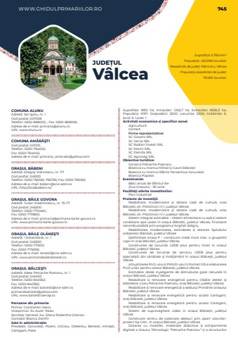 WWW.GHIDULPRIMARIILOR.RO 745Suprafa%u021b%u0103: 5.765 km%u00b2Popula%u021bie: 432.980 locuitoriRe%u0219edin%u021b%u0103 de jude%u021b: R%u00e2mnicu V%u00e2lceaPopula%u021bia re%u0219edin%u021bei de jude%u021b: 119.851 locuitoriJUDE%u021aULV%u00e2lceaCOMUNA ALUNUAdres%u0103: Sat Igoiu, nr. 1Cod po%u0219tal: 247008Telefon: 0250-868002, ; Fax: 0250-868006; Adresa de e-mail: primaria@alunu.roURL: www.alunu.roCOMUNA AM%u0102R%u0102%u015eTICod po%u0219tal: 247015Telefon: 0250-764022; Fax: 0250-764045; Adresa de e-mail: primaria_amarasti@yahoo.comORA%u0218UL B%u0102BENIAdres%u0103: Drago%u015f Vr%u00e2nceanu, nr. 171Cod po%u0219tal: 245100Telefon: 0250-765160, 765765; Fax: 0250-765160; Adresa de e-mail: babeni@vl.e-adm.roURL: http://orasbabeni.ro/ORA%u0218UL B%u0102ILE GOVORAAdres%u0103: Tudor Vladimirescu, nr. 75-77Cod po%u0219tal: 245200Telefon: 0250-770460,; Fax: 0250-770800; Adresa de e-mail: primaria@primaria-baile-govora.roURL: www.primaria-baile-govora.roORA%u0218UL B%u0102ILE OL%u0102NE%u015eTIAdres%u0103: 1 Decembrie, nr. 1Cod po%u0219tal: 245300Telefon: 0250-775012; Fax: 0250-775099; Adresa de e-mail: lanesti@vl.e-adm.roURL: www.primariabaileolanesti.roORA%u0218UL B%u0102LCE%u015eTIAdres%u0103: Aleea Petrache Poenaru, nr. 1Cod po%u0219tal: 245400Telefon: 0250-840352; Fax: 0250-840352; Adresa de e-mail: balcesti@vl.e-adm.roprimariabalcesti@yahoo.comURL: www.balcesti.senap.roPersoane din primarie:Primar: Constantin Aleca%u00a0Viceprimar: Ec.Aurel%u00a0 Radu%u00a0Secretar General: Jur. Elena Robertha Gherlan%u00a0Contabil: Bianca Zamfir%u00a0Sate %u00een administra%u021bie:Preo%u021be%u0219ti, Gorune%u0219ti, Poieni, Ulicioiu, Otetelisu, Benesti,%u00a0 Irime%u015fti, C%u00e2rlogani, PaleiSuprafa%u021ba:%u00a0 9812 ha; Intravilan:%u00a0 1256,7 ha; Extravilan:%u00a0 8555,3 ha; Popula%u021bia:%u00a0 5197; Gospod%u0103rii:%u00a0 3200; Locuin%u021be:%u00a0 3200; Gr%u0103dini%u021be:%u00a0 5; %u0218coli:%u00a05; Licee:%u00a01; Activitati economice si specifice zonei:Agricultur%u0103Comer%u021bFirme reprezentative:SC Giovani SRLSC Cerna SRLSC Rodian %u00cenve%u0219ti SRLSC Miami SRLSC Damila SRLSC Agroneg SRL Obiective turistice:Conacul Petrache PoenaruBiserica cu hramul Mihail %u0219i Gavril B%u0103lce%u0219tiBiserica cu hramul Sf%u00e2nta Paraschiva Gorune%u0219tiBiserica Pope%u0219tiEvenimente:B%u00e2lci anual de Sf%u00e2ntul IlieZiua Ora%u0219ului - 18 iunieFacilit%u00e3%u0163i oferite investitorilor:Parc Industrial%u00a0Proiecte de investi%u0163ii:Reabilitare, modernizare %u015fi dotare cas%u0103 de cultur%u0103, ora%u0219 B%u0103lce%u0219ti, str. Policlinicii nr.1, jude%u0163ul V%u00e2lceaReabilitare, modernizare %u015fi dotare cas%u0103 de cultur%u0103, ora%u0219 B%u0103lce%u0219ti, str. Policlinicii nr.1, jude%u0163ul V%u00e2lceaSistem integrat extindere %u2013 sistem alimentare cu ap%u0103%u00a0%u0219i sistem canalizare ape uzate %u00een ora%u0219ul B%u0103lce%u021bti, jude%u021bul V%u00e2lcea, finan%u021bare nerambursabil%u0103%u00a0prin programul Anghel SalignyReabilitarea, modenizarea, extinderea %u0219i dotarea Spitalului or%u0103%u0219enesc B%u0103lce%u0219ti, jude%u021bul V%u00e2lceaDesfiin%u021bare anexa P %u2013 construire cre%u0219%u0103%u00a0mic%u0103%u00a0max. 4 grupe/40 copii %u00een ora%u0219%u00a0B%u0103lce%u0219ti, jude%u021bul V%u00e2lceaConstruirea de locuin%u021be nZEB plus pentru tineri %u00een ora%u0219ul B%u0103lce%u0219ti, jude%u021bul V%u00e2lceaConstruirea de locuin%u0163e de serviciu nZEB plus pentru speciali%u015ftii din s%u0103n%u0103tate %u015fi %u00eenv%u0103%u0163%u0103m%u00e2nt %u00een ora%u015ful B%u0103lce%u015fti, jude%u0163ul V%u00e2lceaActualizarea PUG-ului si PMUD-ului %u00een format GIS %u0219i elaborarea PUZ-urilor pentru orasul B%u0103lce%u0219ti, judetul V%u00e2lceaExtindere re%u021bele inyeligente de distrubu%u021bie gaze naturale %u00een ora%u0219ul B%u0103lce%u0219ti, jude%u021bul V%u00e2lceaReabilitare %u0219i renovare energetic%u0103%u00a0 pentru cl%u0103dire atelier %u0219i biblioteca Liceu Petrache Poenaru, ora%u0219%u00a0B%u0103lce%u0219ti, jude%u021bul V%u00e2lceaReabilitare %u0219i renovare energetic%u0103%u00a0a sediului Prim%u0103riei ora%u0219ului B%u0103lce%u0219ti, jude%u021bul V%u00e2lceaReabilitare %u0219i renovare energetic%u0103%u00a0 pentru %u0219coala Carlogani, ora%u0219%u00a0B%u0103lce%u0219ti, jude%u021bul V%u00e2lceaReabilitare %u0219i renovare energetic%u0103%u00a0 pentru %u0219coala Carlogani, ora%u0219%u00a0B%u0103lce%u0219ti, jude%u021bul V%u00e2lceaSistem de supraveghere video %u00een ora%u0219ul B%u0103lce%u0219ti, jude%u021bul V%u00e2lceaConstruire centru de colectare de%u0219euri prin aport voluntarproiect tip CAV , %u00een ora%u0219ul B%u0103lce%u0219ti, jude%u021bul V%u00e2lceaDotarea cu mobilier, materiale didactice %u0219i echipamente digitale a liceului Tehnologic %u201cPetrache Poenaru%u201d %u0219i a structurilor